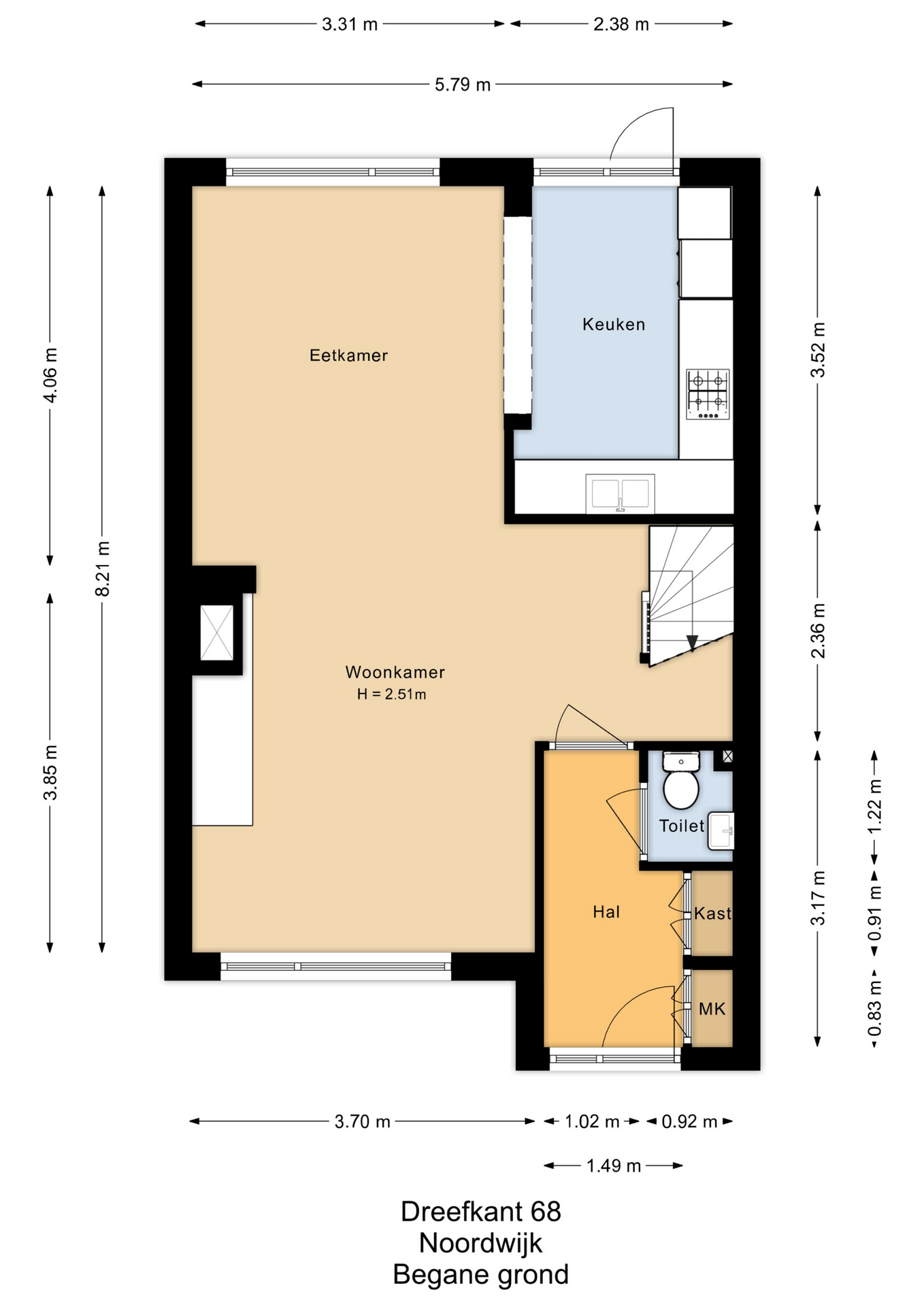 Entree, hal met meterkast, garderobe en toiletruimte met fonteintje. Ruime en lichte woonkamer met open haard, open keuken in L-opstelling met eenvoudige keukeninrichting en voorzien van inbouwapparatuur, te weten: gaskookplaat, afzuigkap, koelkast en oven. Vanuit de keuken toegang tot fraai aangelegde achtertuin op het zuidoosten.