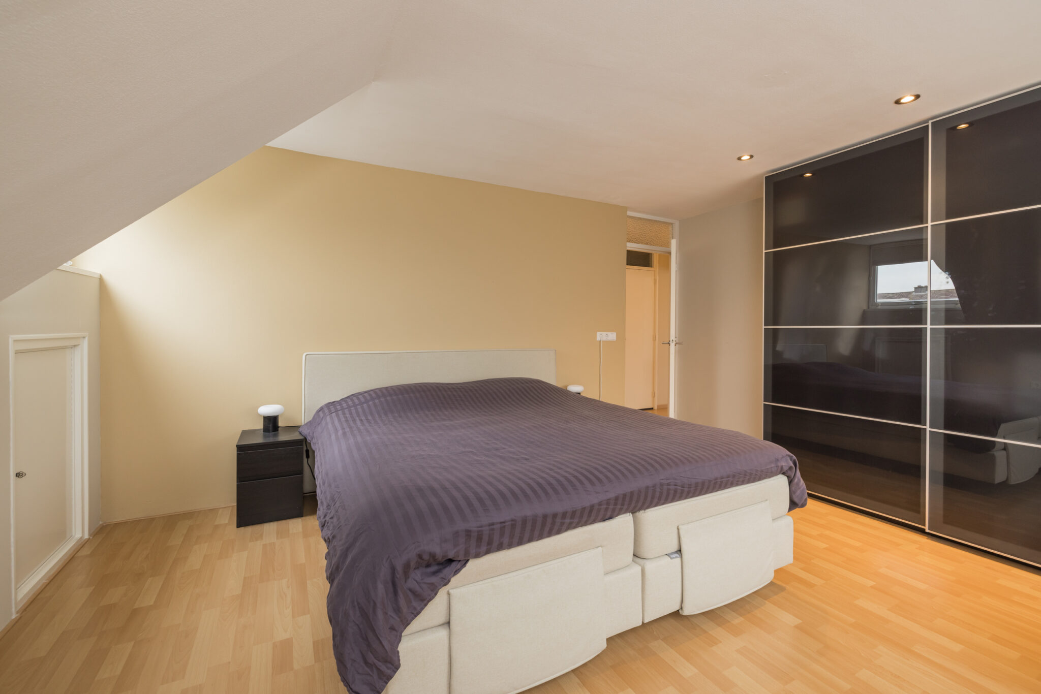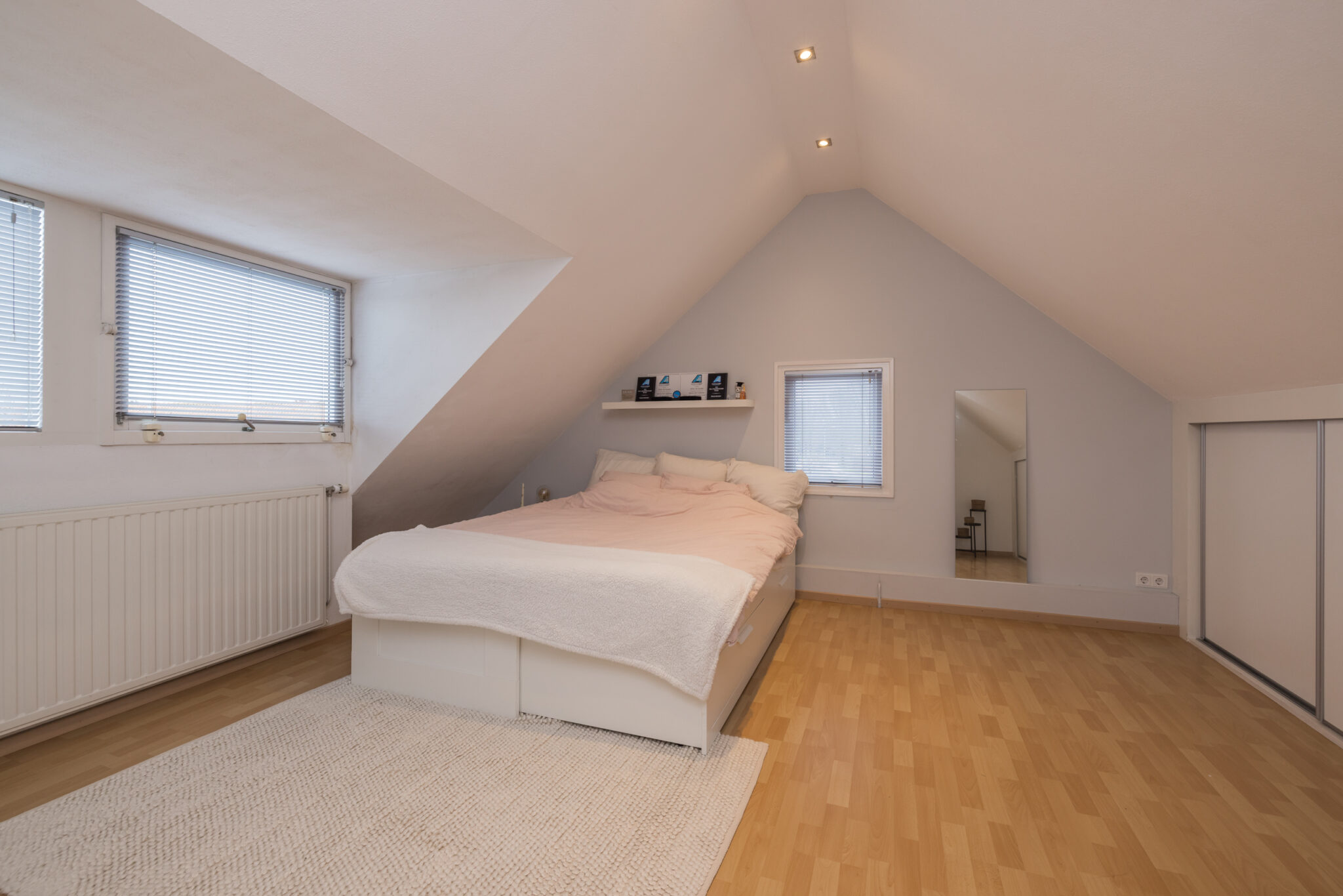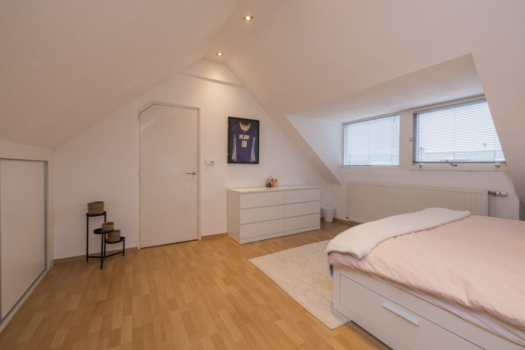 Ruime overloop met toiletruimte. Grote 1e slaapkamer en 2e slaap-/werkkamer aan de achterzijde. In moderne kleurstellingen betegelde badkamer met inloopdouche, ligbad, dubbele wastafel, vloerverwarming en dakraam. 3e (ouder) slaapkamer met dakkapel aan de voorzijde en veel bergruimte achter knieschot.