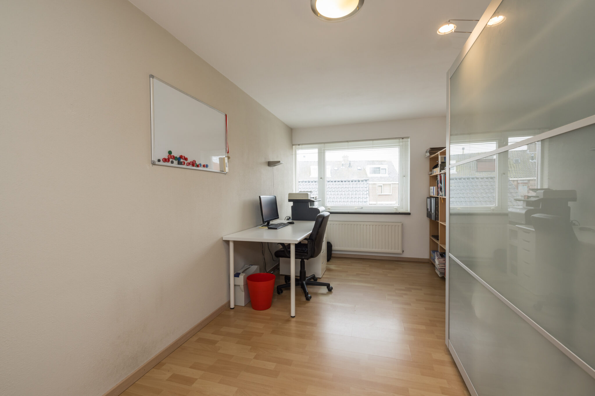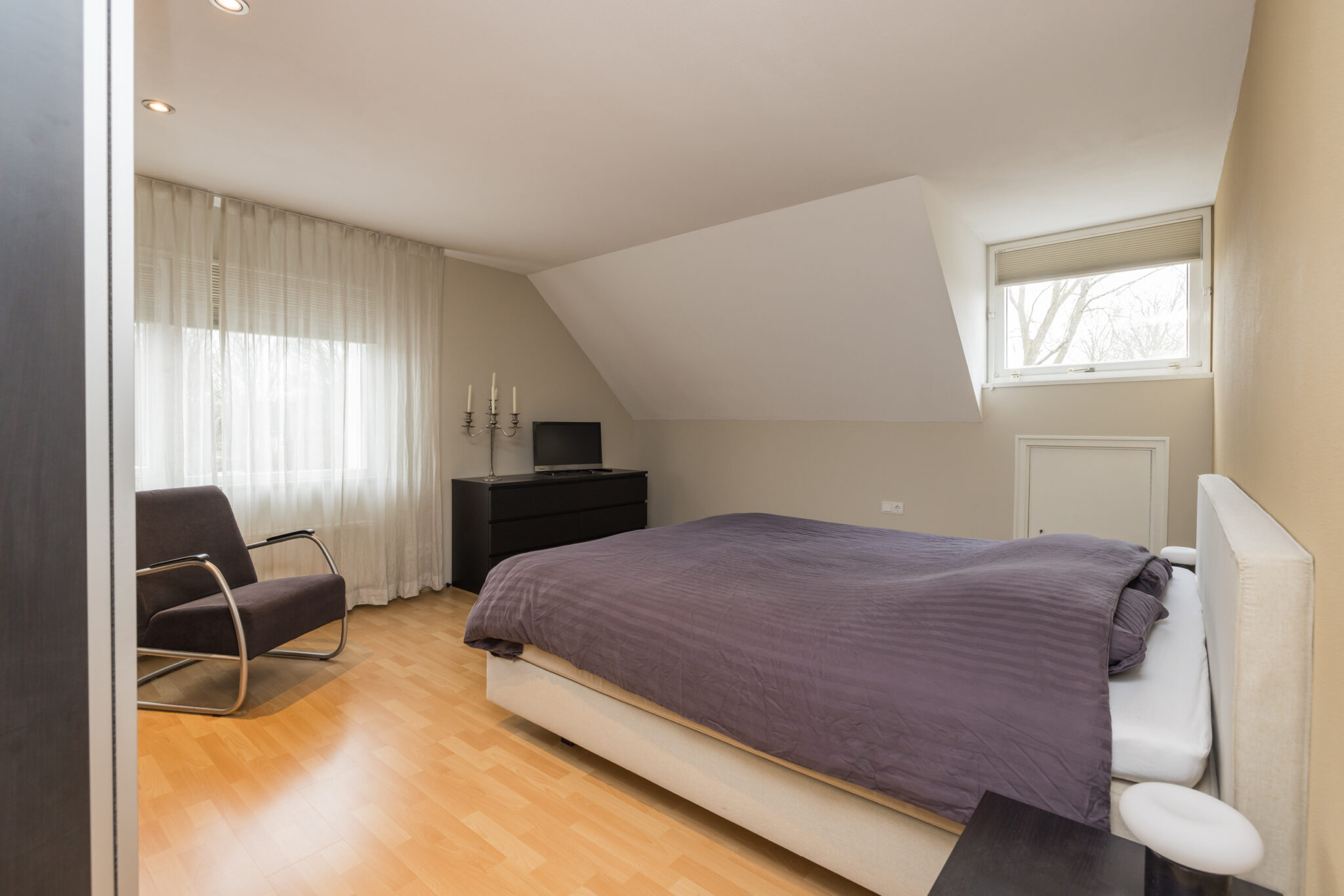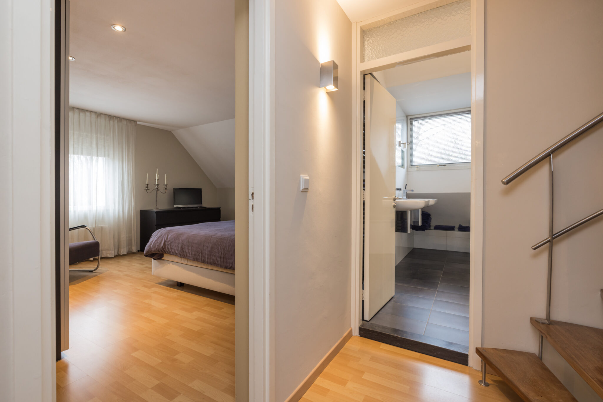 Ruime overloop met toiletruimte. Grote 1e slaapkamer en 2e slaap-/werkkamer aan de achterzijde. In moderne kleurstellingen betegelde badkamer met inloopdouche, ligbad, dubbele wastafel, vloerverwarming en dakraam. 3e (ouder) slaapkamer met dakkapel aan de voorzijde en veel bergruimte achter knieschot.
