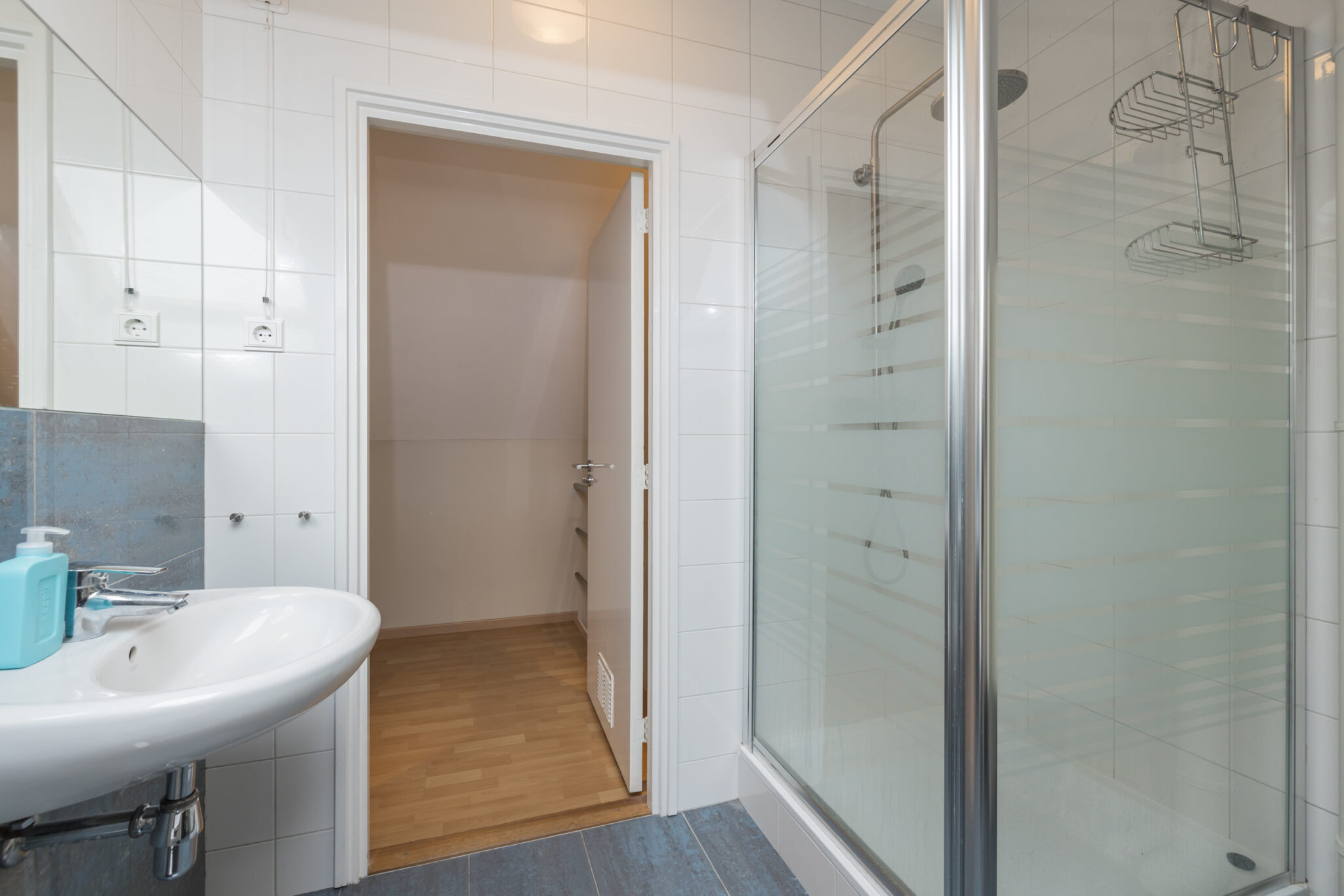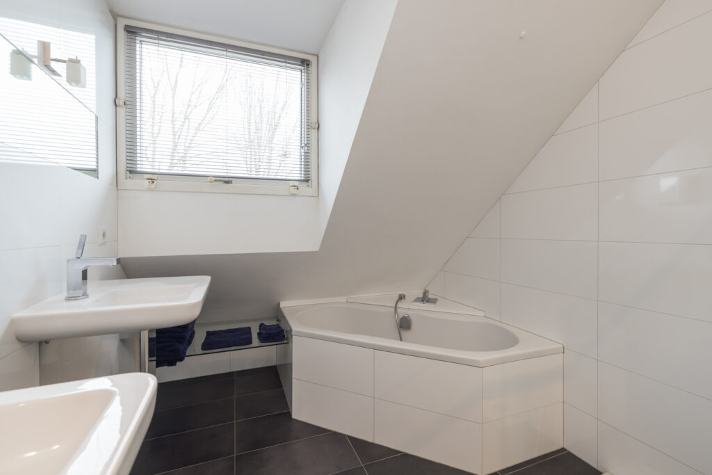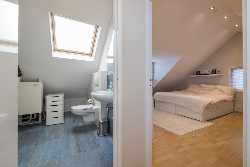 Overloop, 2e badkamer met douche, wastafel, wandcloset, dakraam en opstelling cv combiketel en boiler, royale 4e slaapkamer met vaste kastenwand en dakkapel aan de achterzijde.