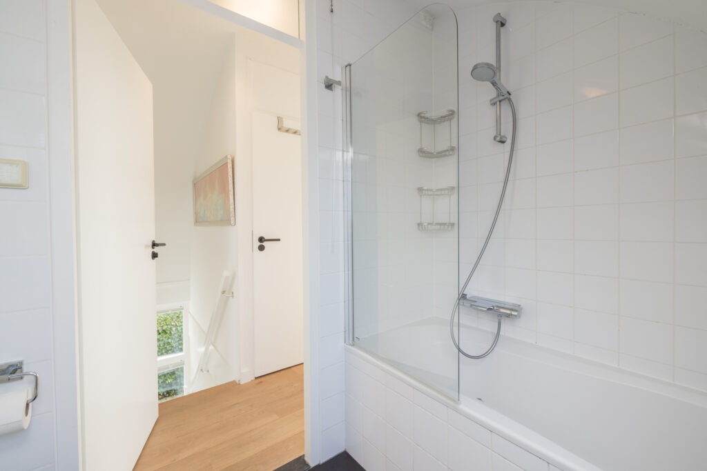 Overloop met vaste kast alwaar opstelling c.v. combiketel, riante (ouder)slaapkamer met vaste kast en airco. In lichte kleurstellingen betegelde badkamer met ligbad/douchecombinatie, wastafelmeubel en wandcloset. Ruime 2e slaapkamer met airco (mogelijkheid tot het realiseren van een 3e slaapkamer).
