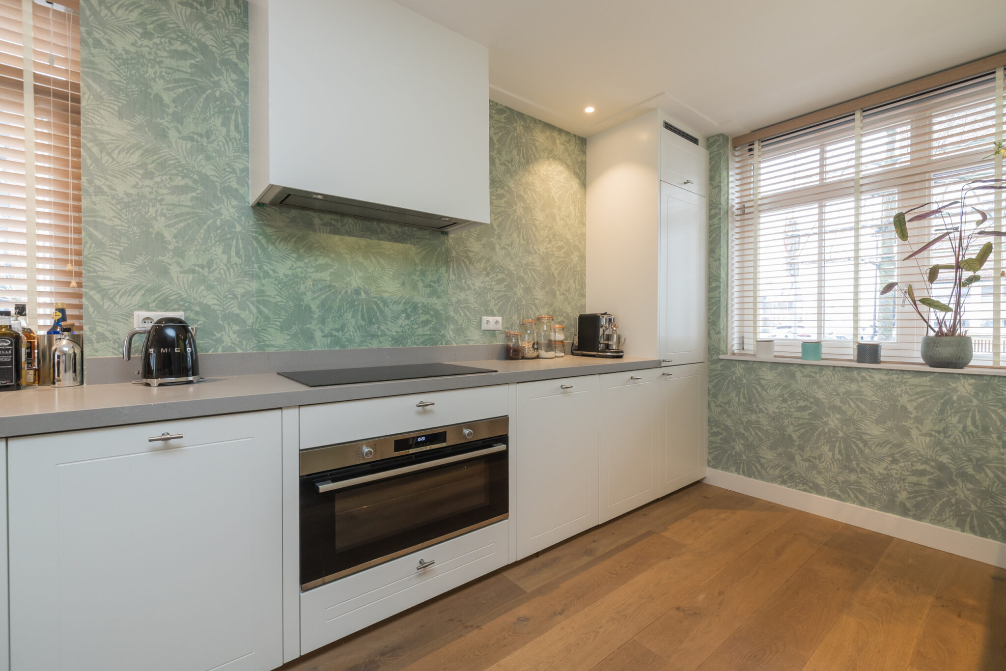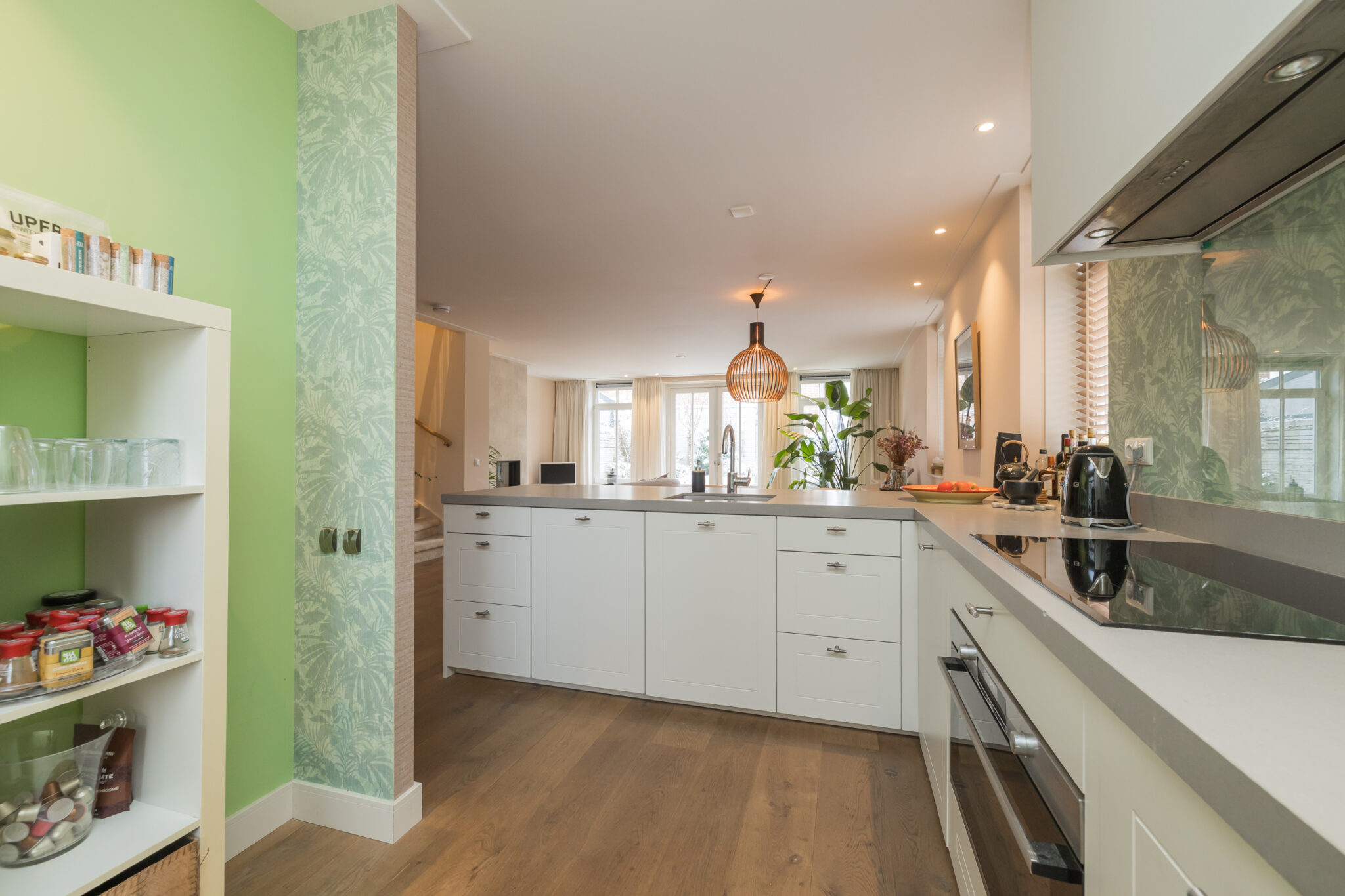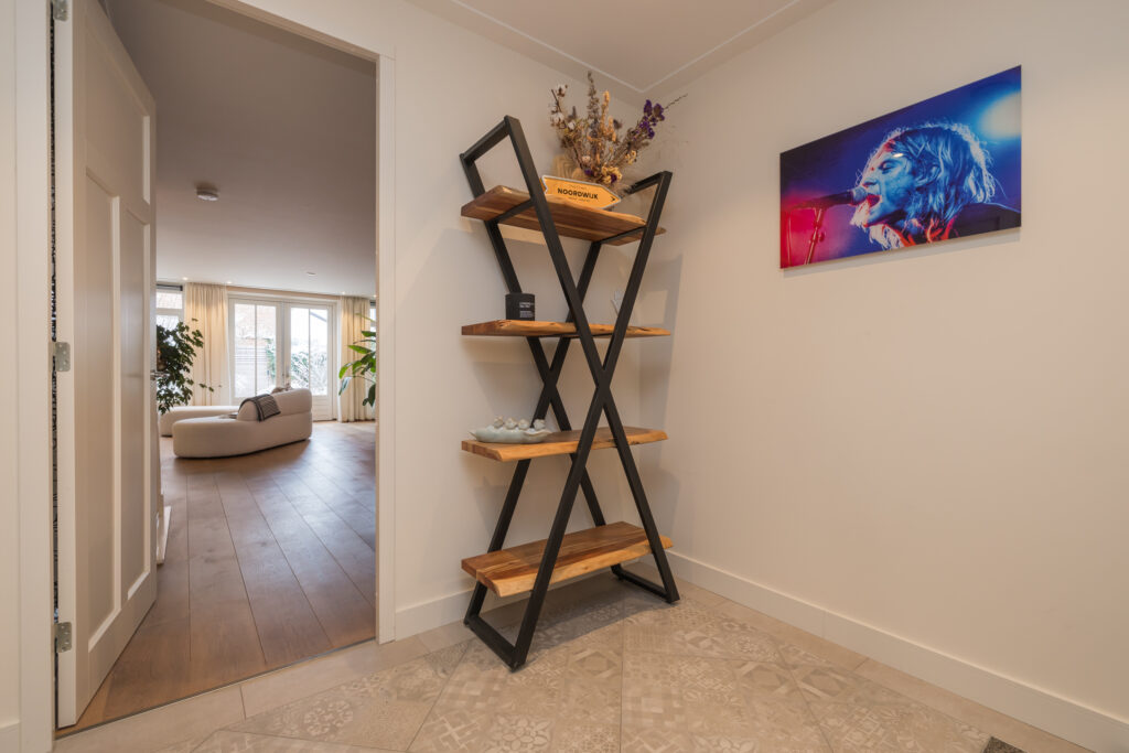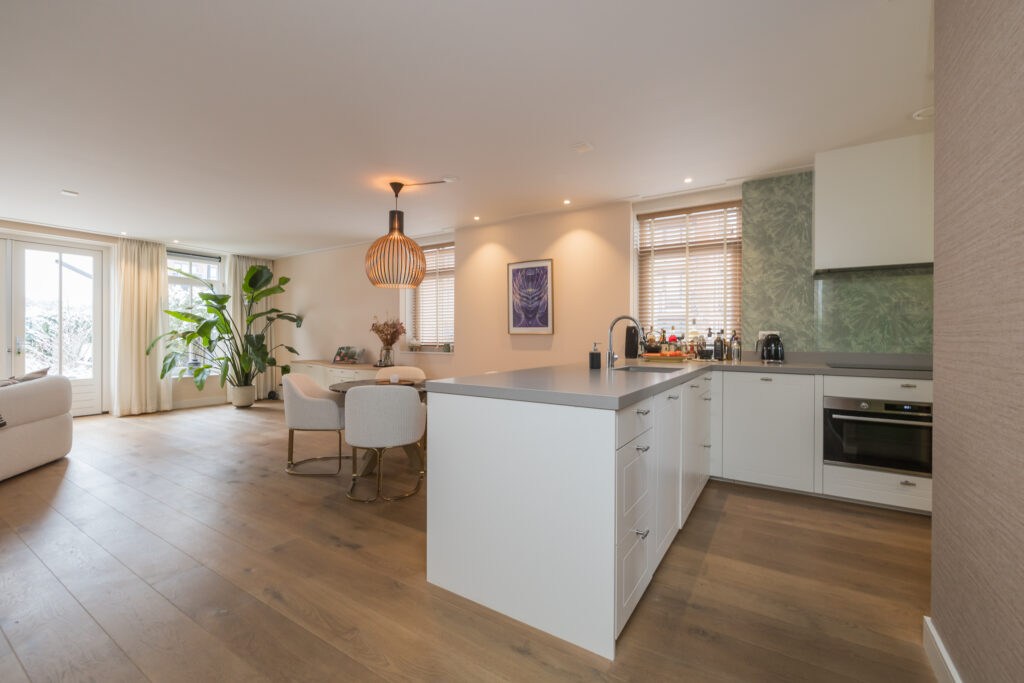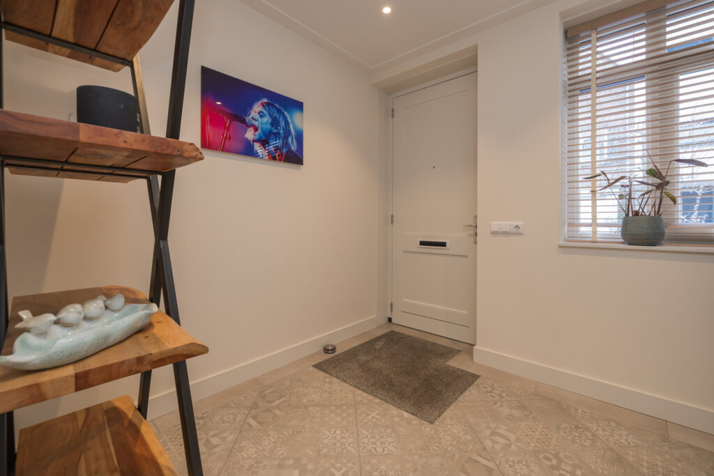 Entree in de ruime hal met garderobe, meterkast en moderne toiletruimte met wandcloset en fonteintje. Vanuit de hal bereikt u de opvallend brede woonkamer met eikenhouten vloer, strakke wand- en plafondafwerking, luxe binnendeuren en een sfeervolle houtgestookte openhaard. De grote raampartijen zorgen voor veel licht en geven een prachtig zicht op de tuin. Aan de voorzijde bevindt zich de moderne keuken, voorzien van hoogwaardige inbouwapparatuur en een royaal werkblad. Via dubbele openslaande deuren is de zonnige tuin bereikbaar.