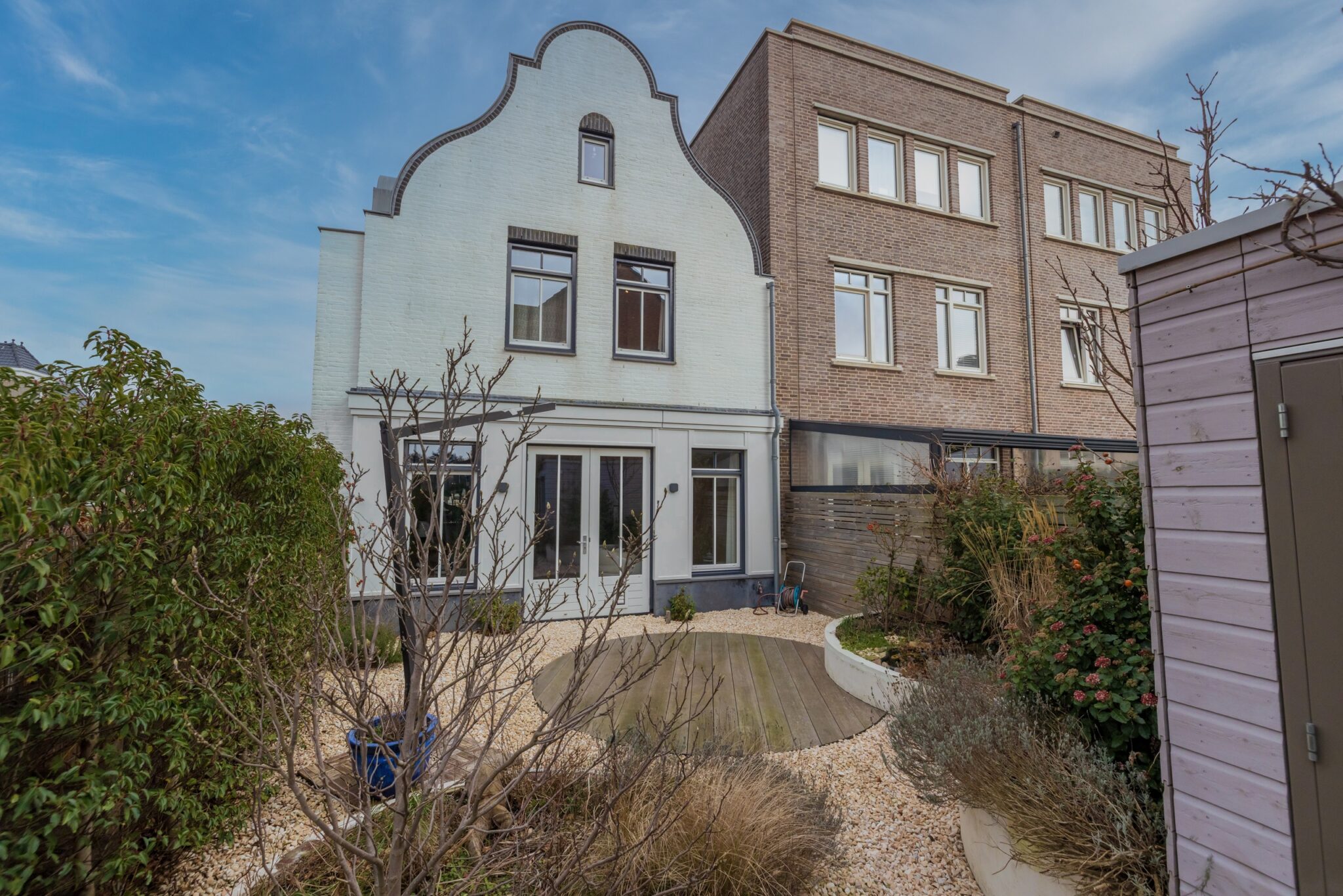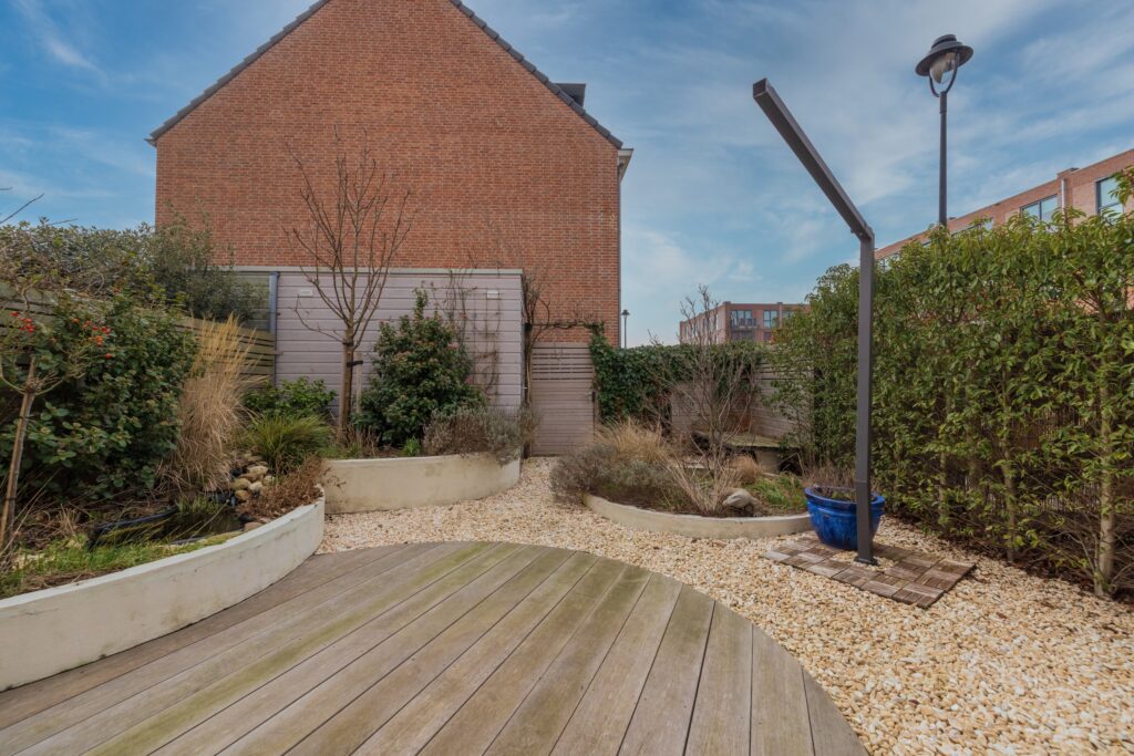 De fraai aangelegde tuin op het zuidwesten is ontworpen met organische vormen en biedt meerdere zitmogelijkheden. Hier geniet u de hele dag van de zon. Achterin de tuin staat een praktische berging.