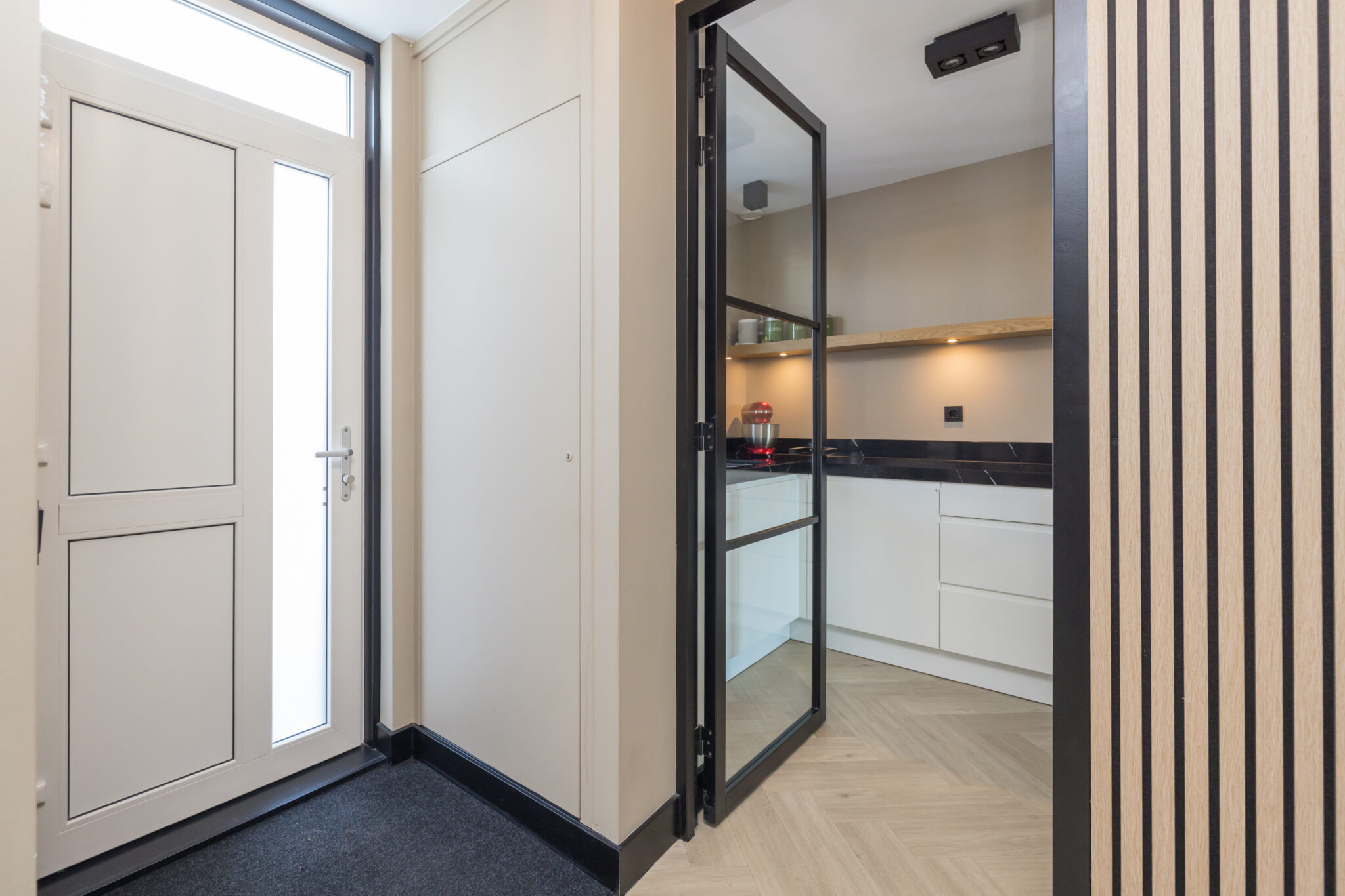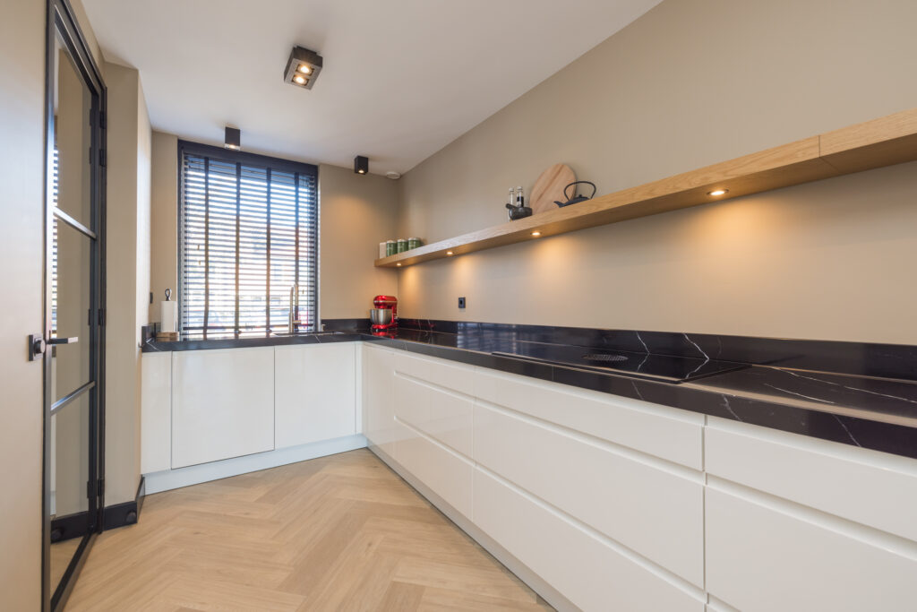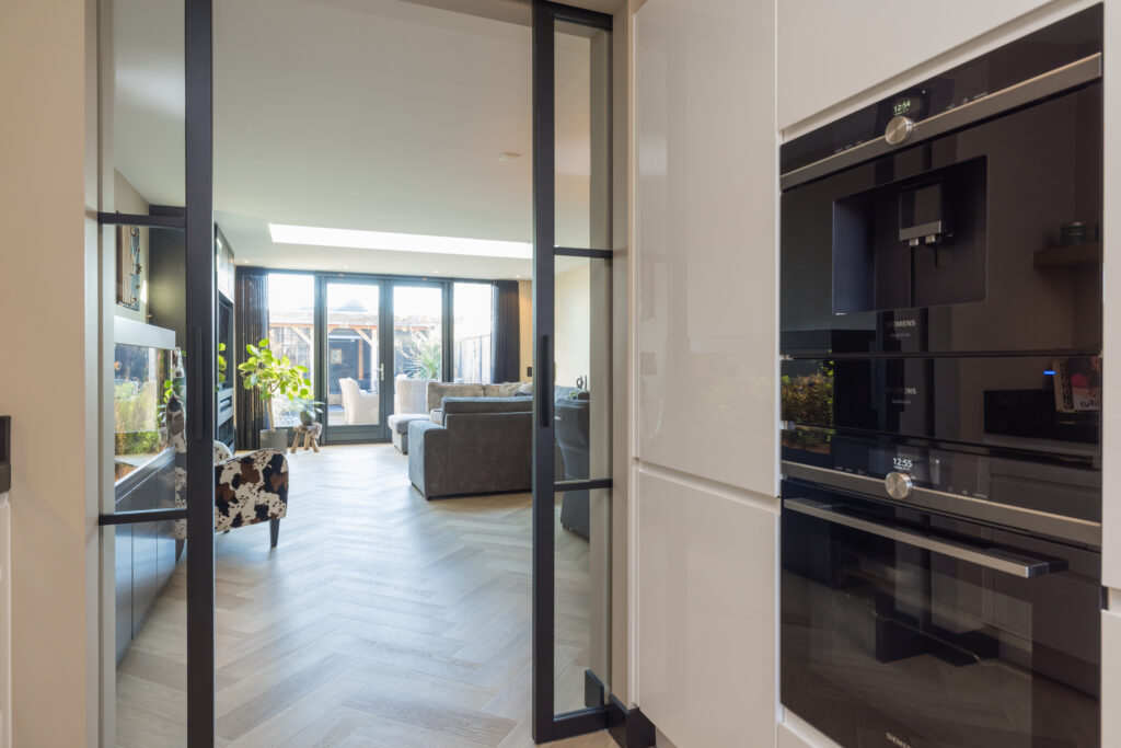 Entree, hal met meterkast, grote berging/bijkeuken en toiletruimte met wandcloset en fonteintje. Aan de voorzijde bevindt zich de ruime en fraaie keuken (2022), uitgevoerd met allerhande inbouwapparatuur, te weten: Siemens koffiezetapparaat, combi-oven, BORA X Pure inductiekookplaat met geïntegreerde afzuiging, nieuwe vaatwasser (2025) en Quooker.