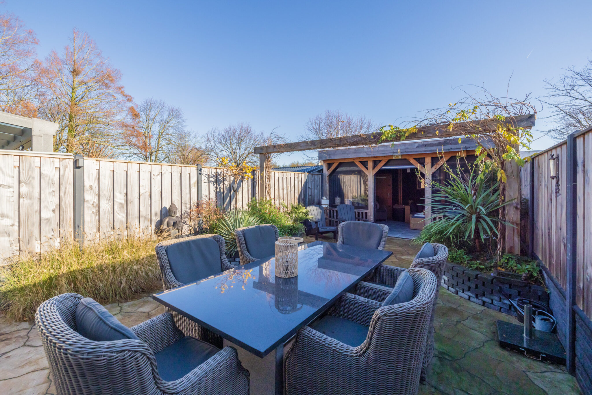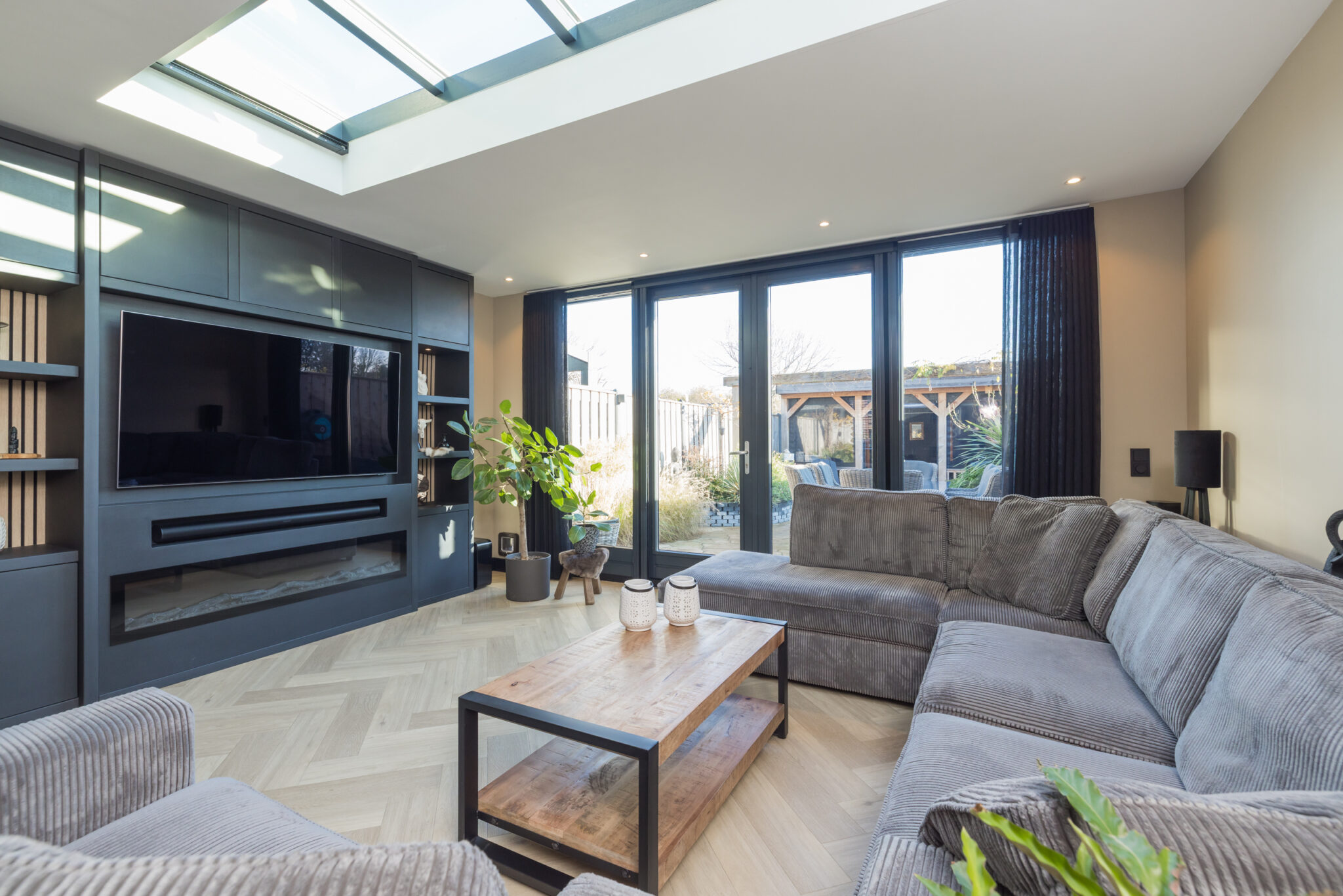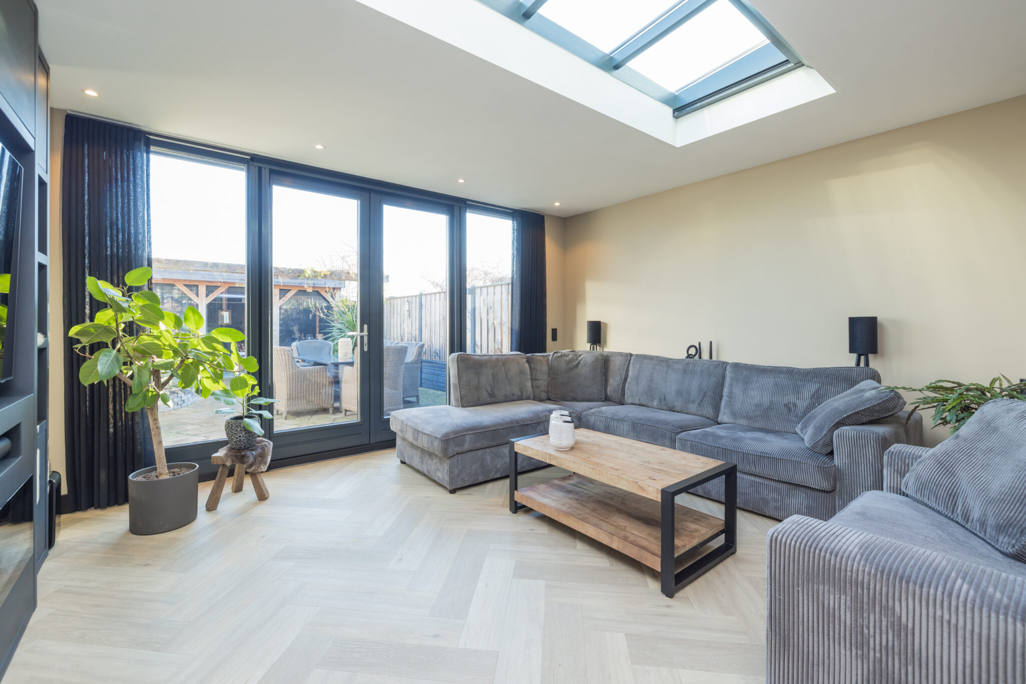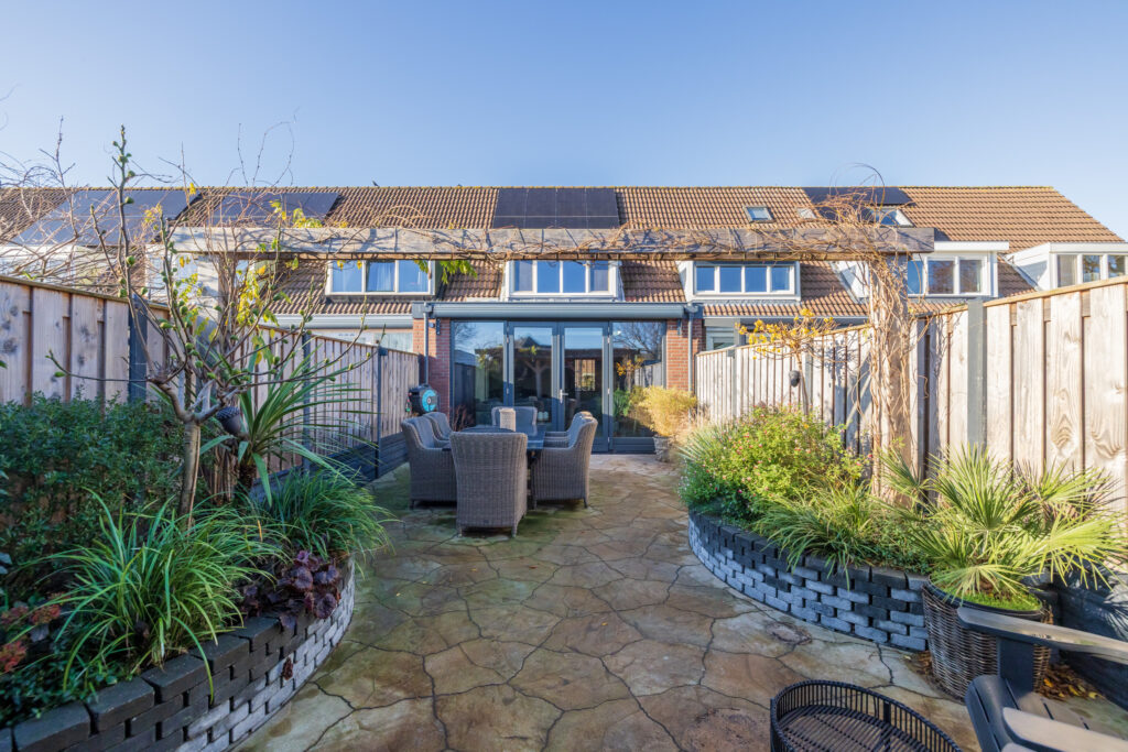 Via en-suite deuren toegang tot de uitgebouwde woonkamer met grote raampartijen en een lichtstraat voor extra daglicht. Via de openslaande deuren bereikt u de zonnige en fraai aangelegde achtertuin met achterin een grote, overdekte loungehoek/veranda. De tuin biedt veel privacy en heeft een praktische indeling.