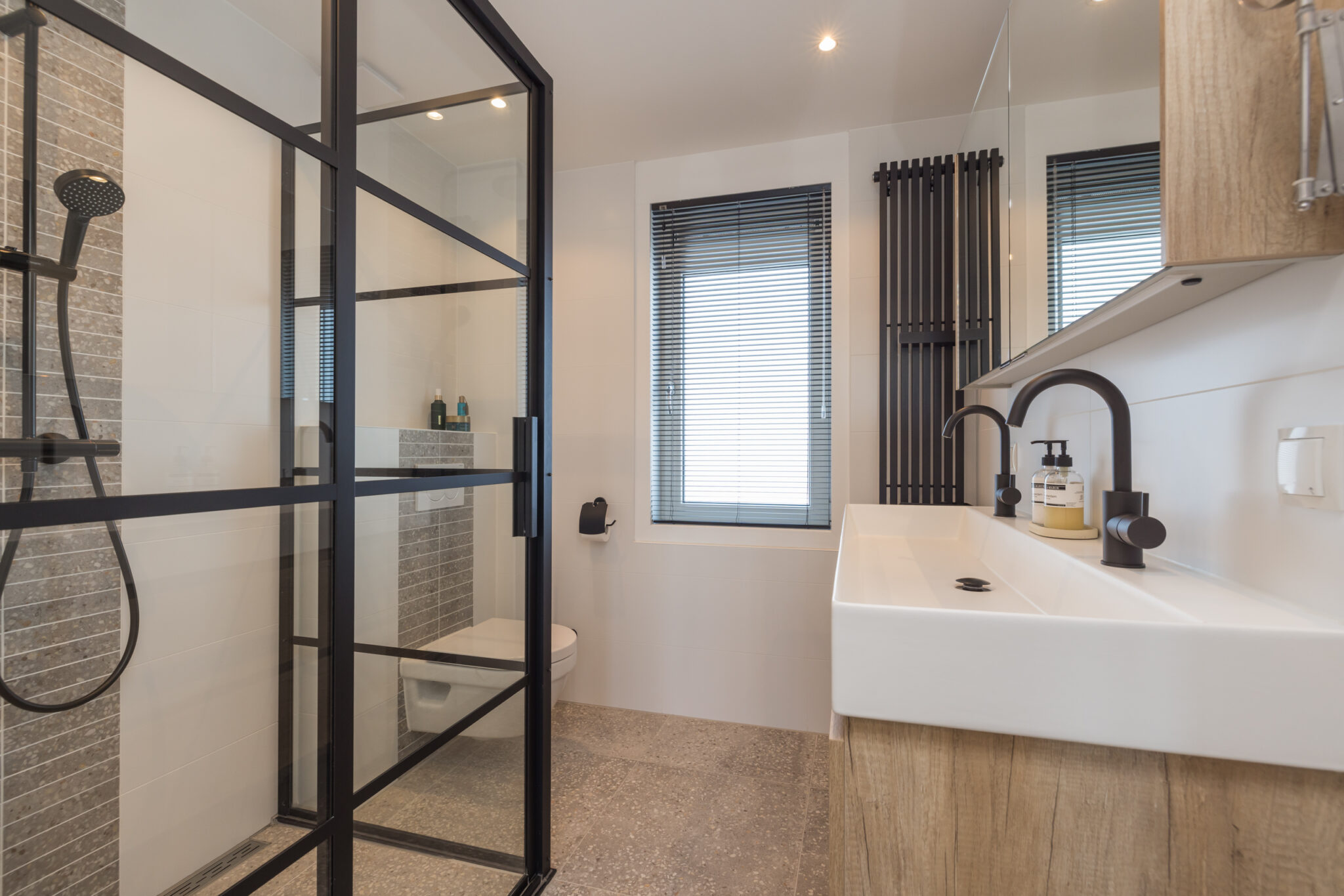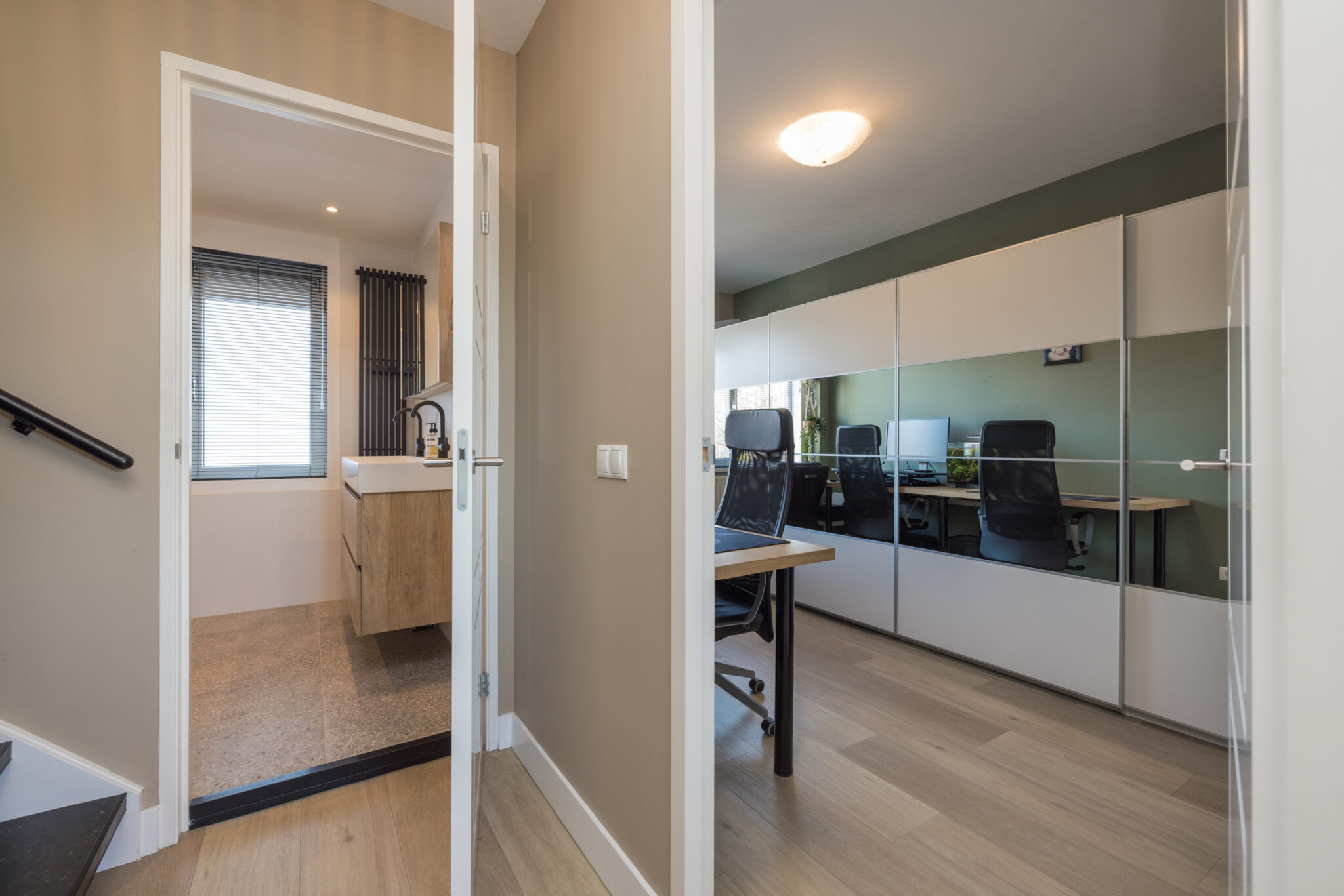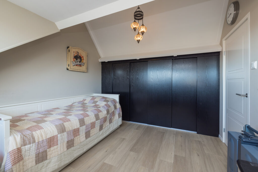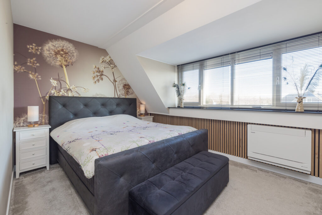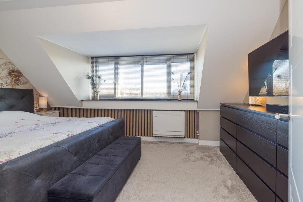 Overloop, 1e slaapkamer aan de voorzijde en 2e (ouder)slaapkamer aan de achterzijde met dakkapel en airconditioning. Moderne badkamer met wastafelmeubel voorzien van 2 kranen, wandcloset, luxe inloopdouche en elektrische vloerverwarming.