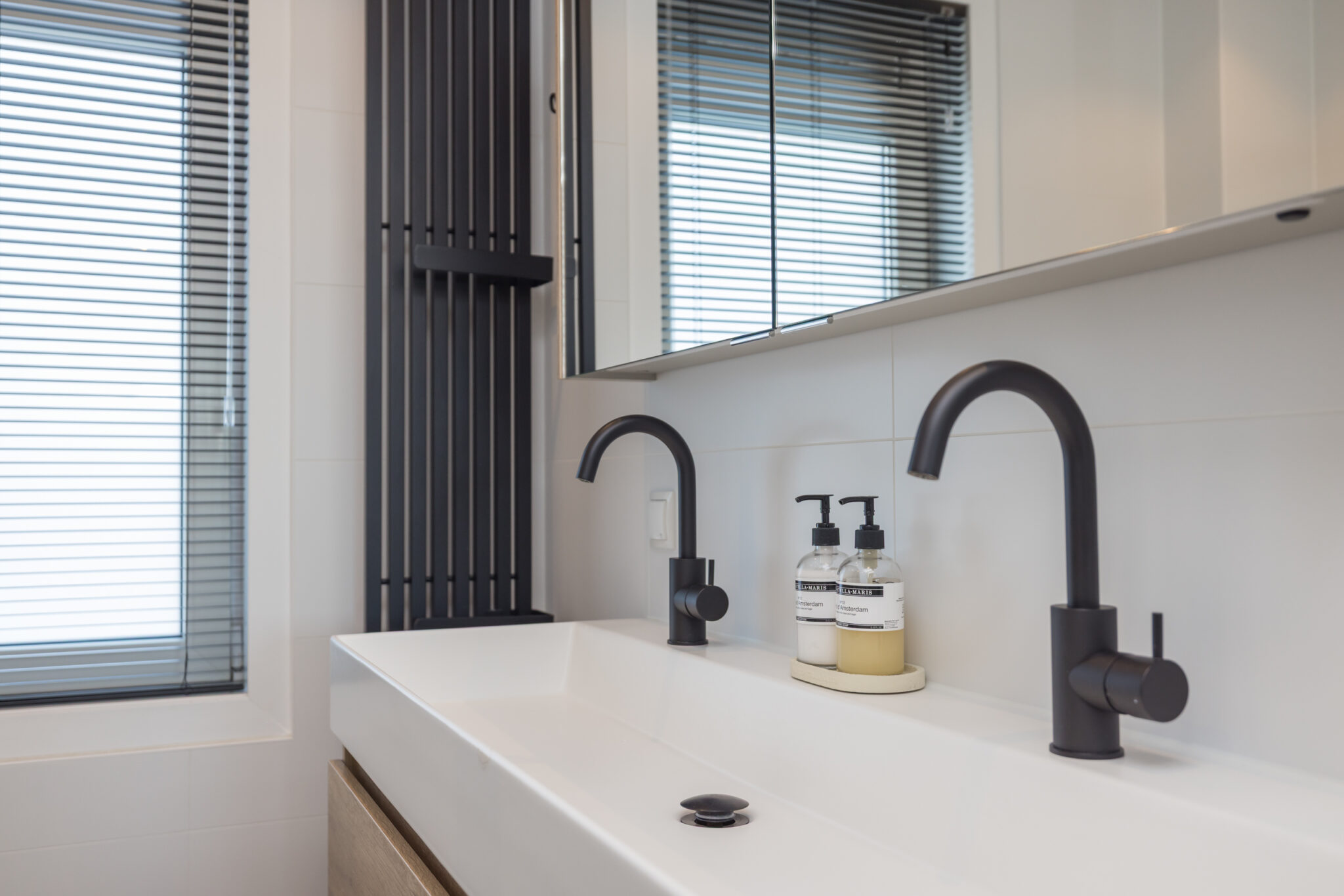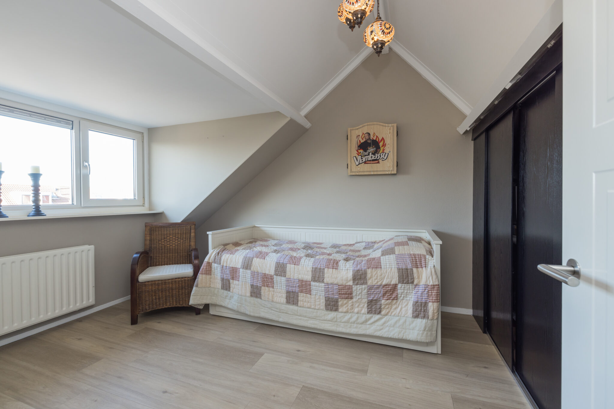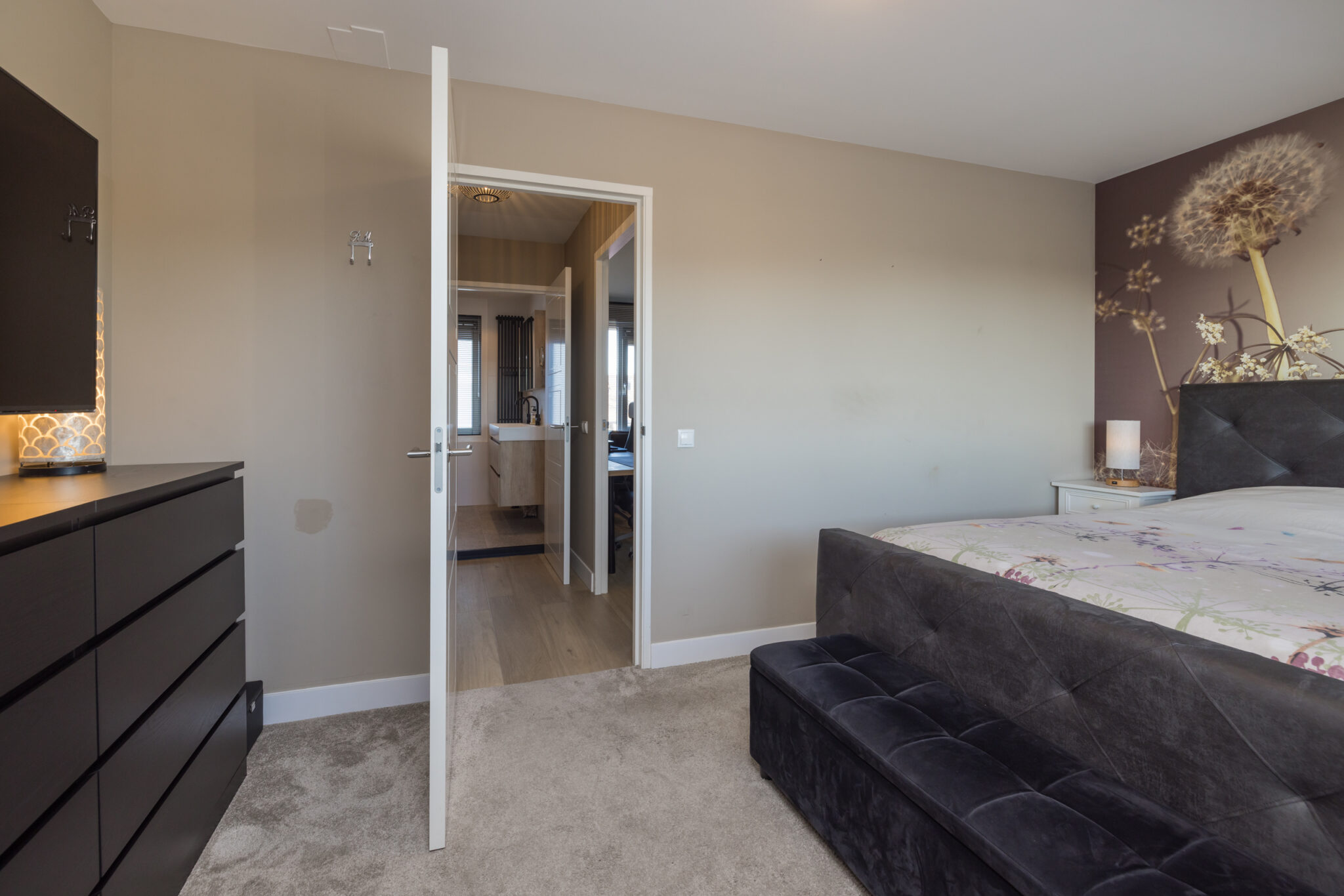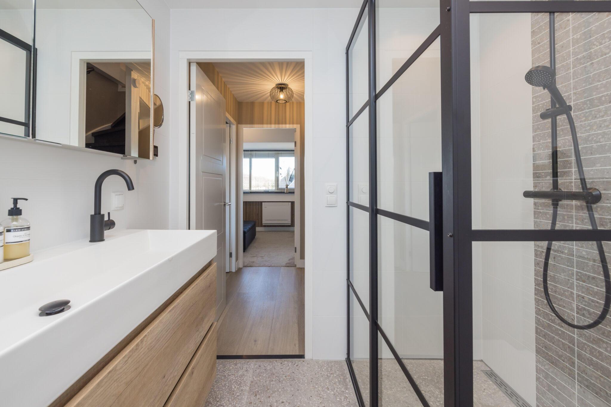 Overloop, 1e slaapkamer aan de voorzijde en 2e (ouder)slaapkamer aan de achterzijde met dakkapel en airconditioning. Moderne badkamer met wastafelmeubel voorzien van 2 kranen, wandcloset, luxe inloopdouche en elektrische vloerverwarming.