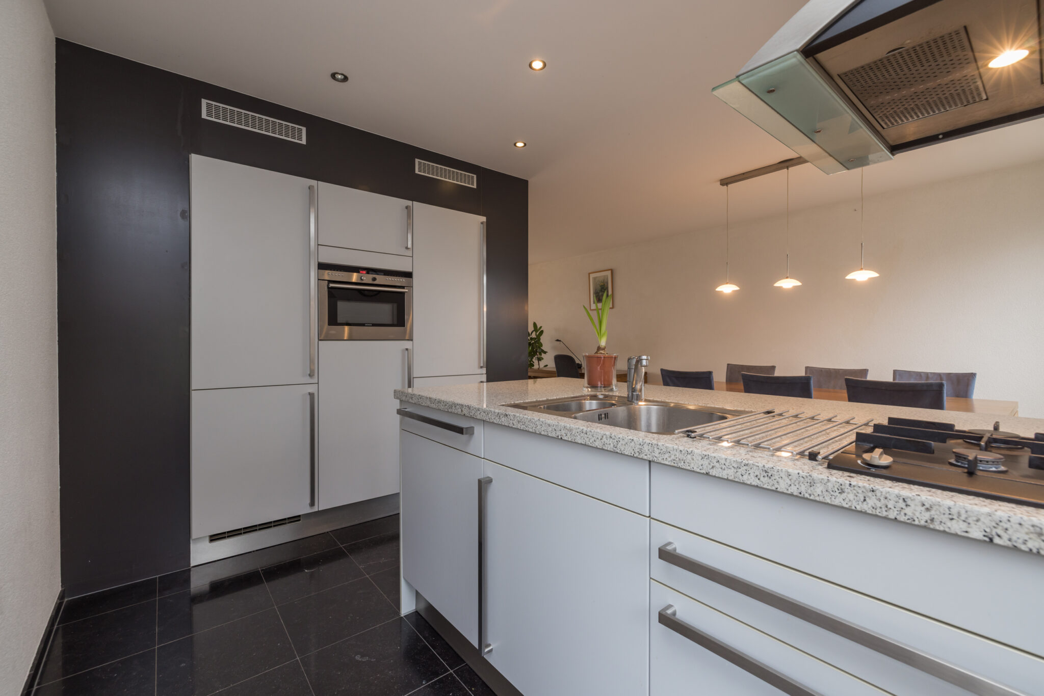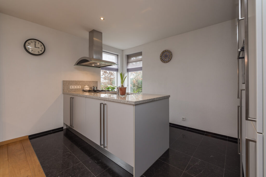 Entree, ruime hal met garderobe, meterkast en moderne toiletruimte met wandcloset en fonteintje. Royale uitgebouwde woonkamer met lichtstraat en openslaande deuren naar de fraai aangelegde achtertuin met meerdere terrassen, vlonder en fraai vrij uitzicht. Moderne open keuken voorzien van natuurstenen aanrechtbladen en diverse inbouwapparatuur, te weten: 4-pits gaskookplaat, afzuigkap, combimagnetron, koelkast, vriezer en vaatwasser. Vanuit de woonkamer toegang tot de ruime bijkeuken/berging met vaste kastenwand en aansluiting wasapparatuur.