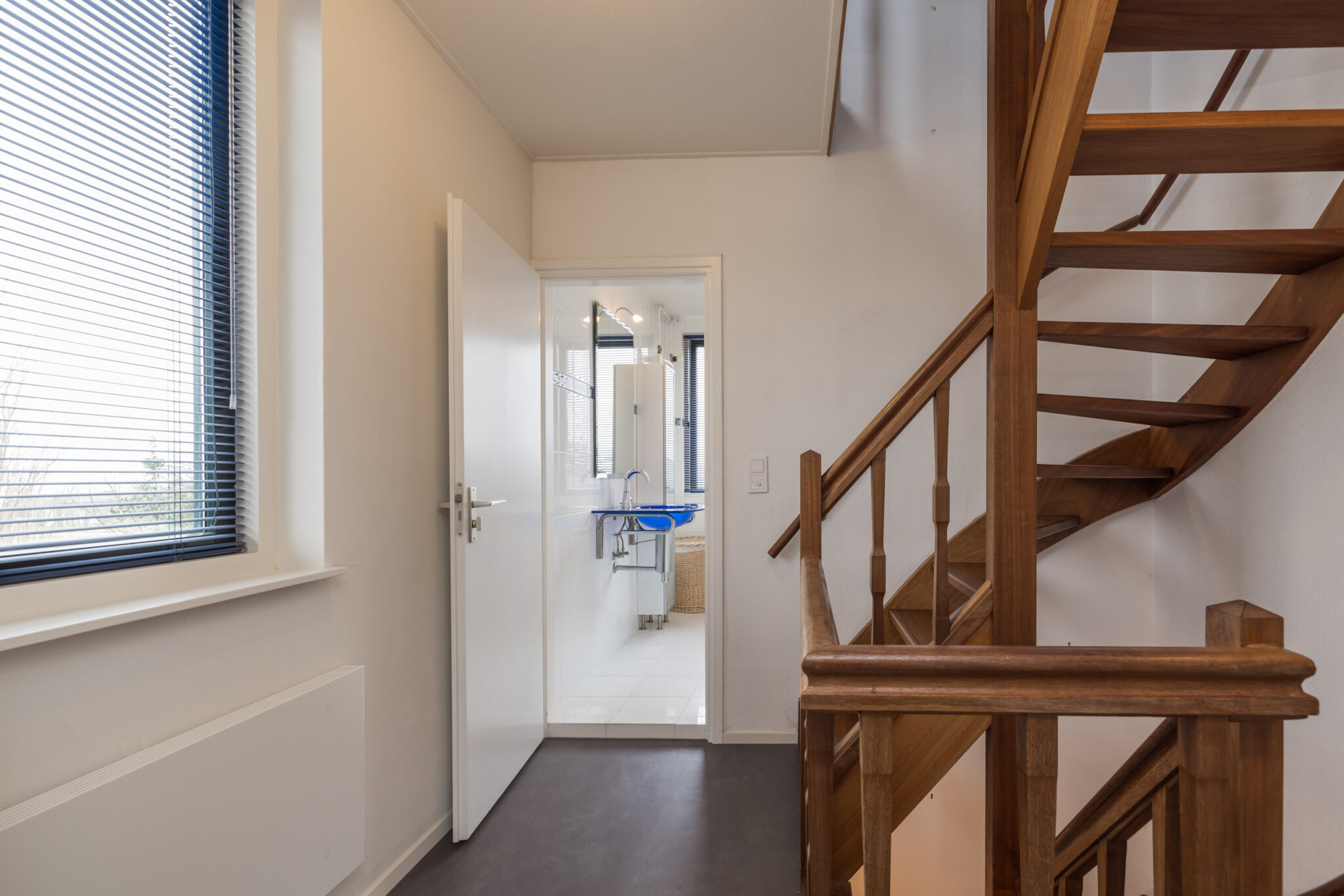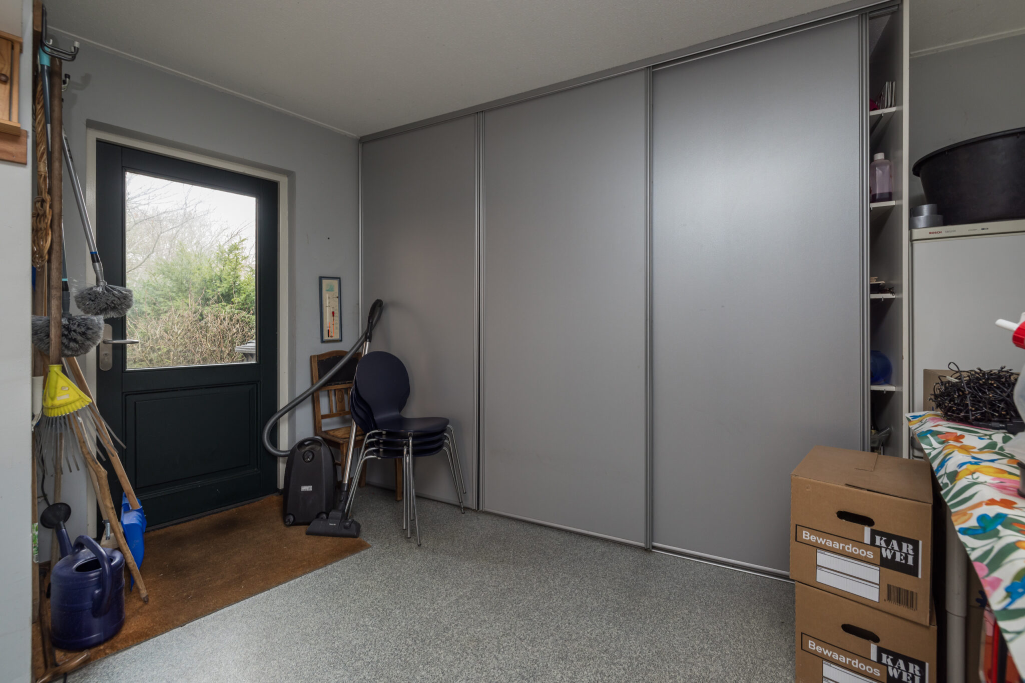 Grote voorzolder met opstelling cv combiketel en toegang tot de bergruimte aan de achterzijde.