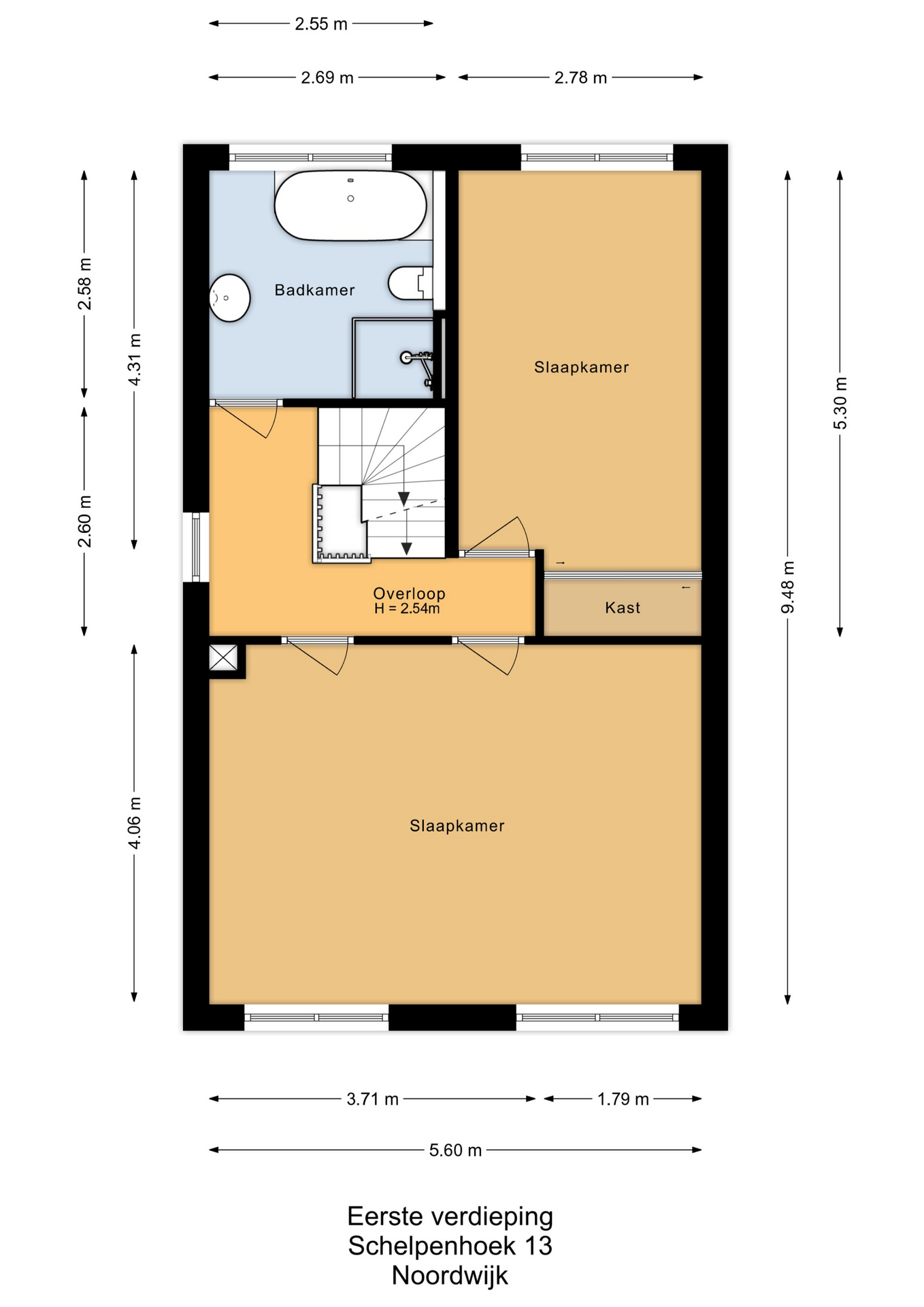 Ruime overloop, 1e slaapkamer met vaste kastenwand, in lichte kleurstellingen betegelde badkamer met douche, ligbad, wastafel en wandcloset aan de achterzijde. Royale (ouder) slaapkamer (voorheen 2 slaapkamers) aan de voorzijde. De ouderslaapkamer is eenvoudig weer naar 2 ruime slaapkamers terug te brengen.
