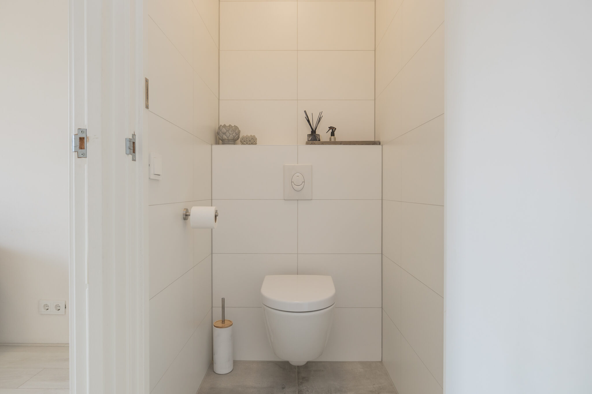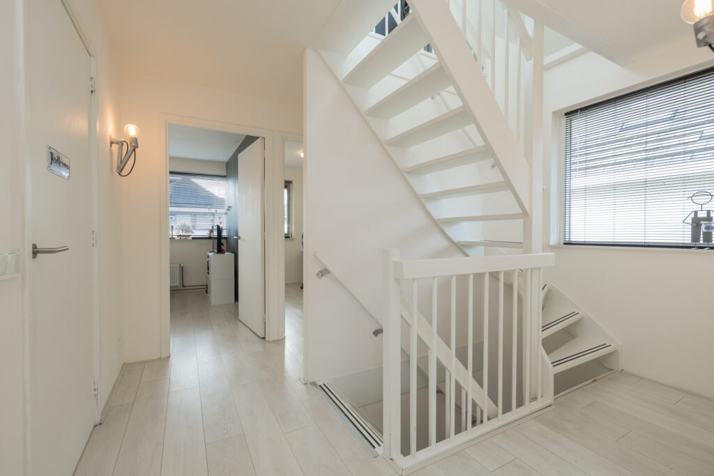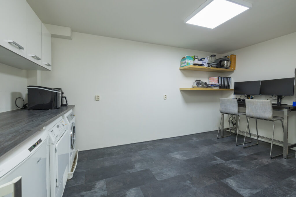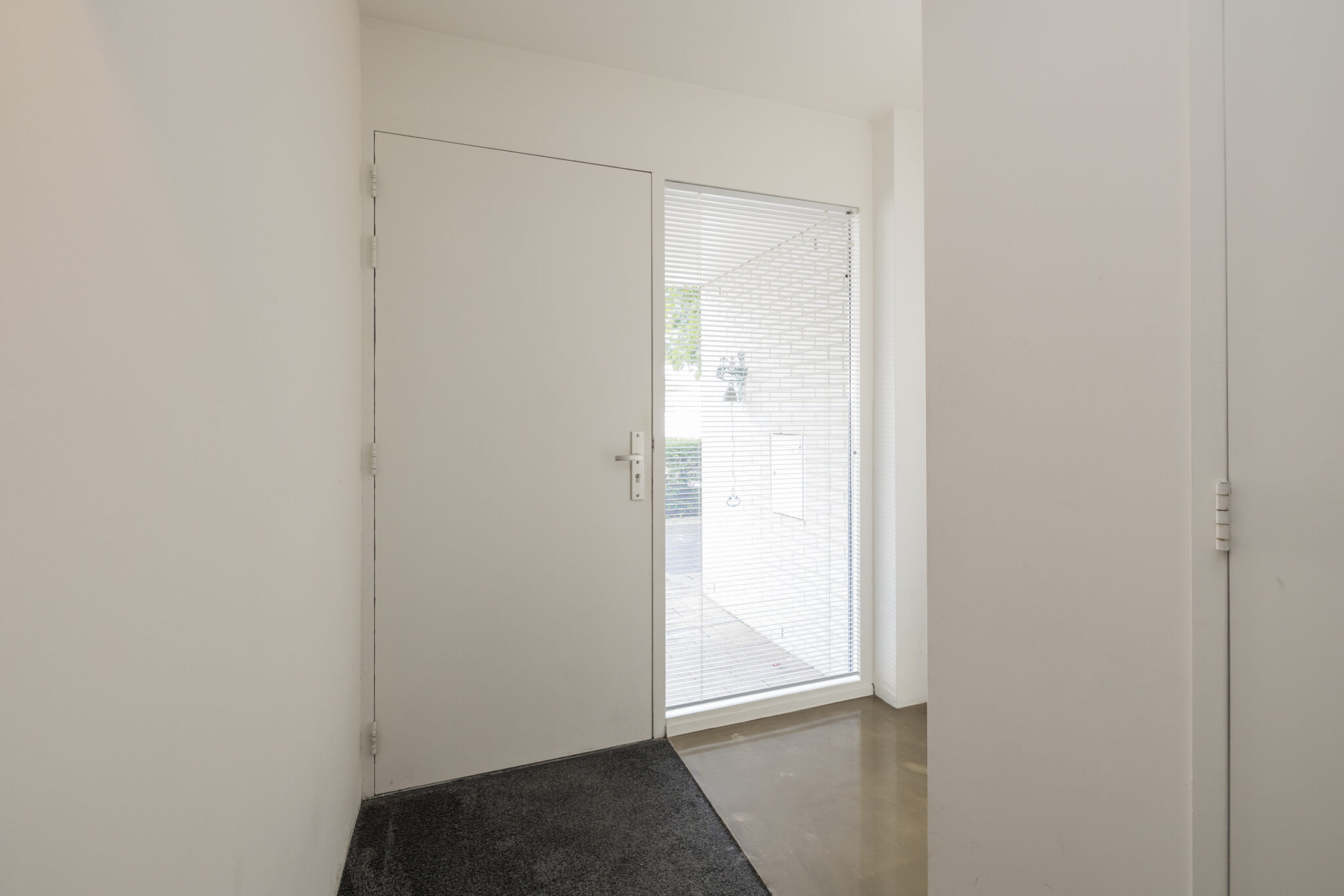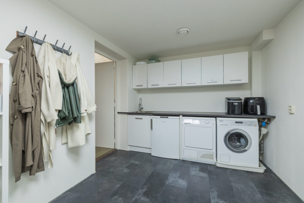 Entree, ruime hal met meterkast en separate toiletruimte met wandcloset en fonteintje. Vanuit de hal toegang tot de bijkeuken (mogelijkheid tot ombouwen garage) met aansluiting voor wasapparatuur. Ruime en lichte woonkamer met openslaande deuren naar de tuin en fraaie Taatsdeuren naar de eetkamer. Aan de voorzijde bevindt zich de open keuken met wit hoogglans keukenopstelling voorzien van diverse inbouwapparatuur, te weten: Quooker, koel/vriescombinatie, vaatwasser, inductiekookplaat en combi-oven. Vanuit de woonkamer toegang tot de tuin.