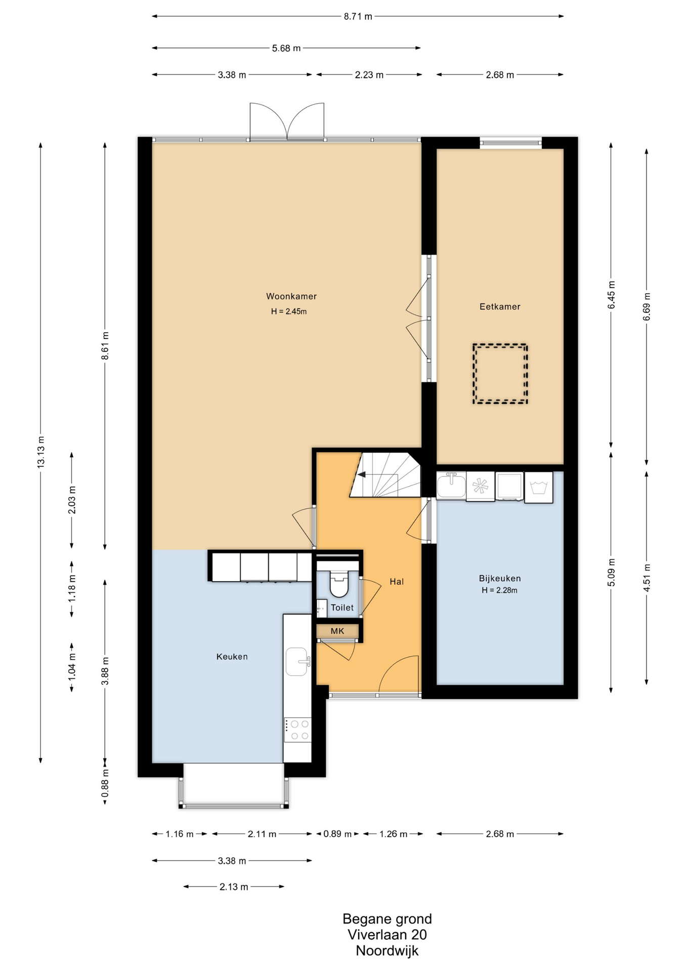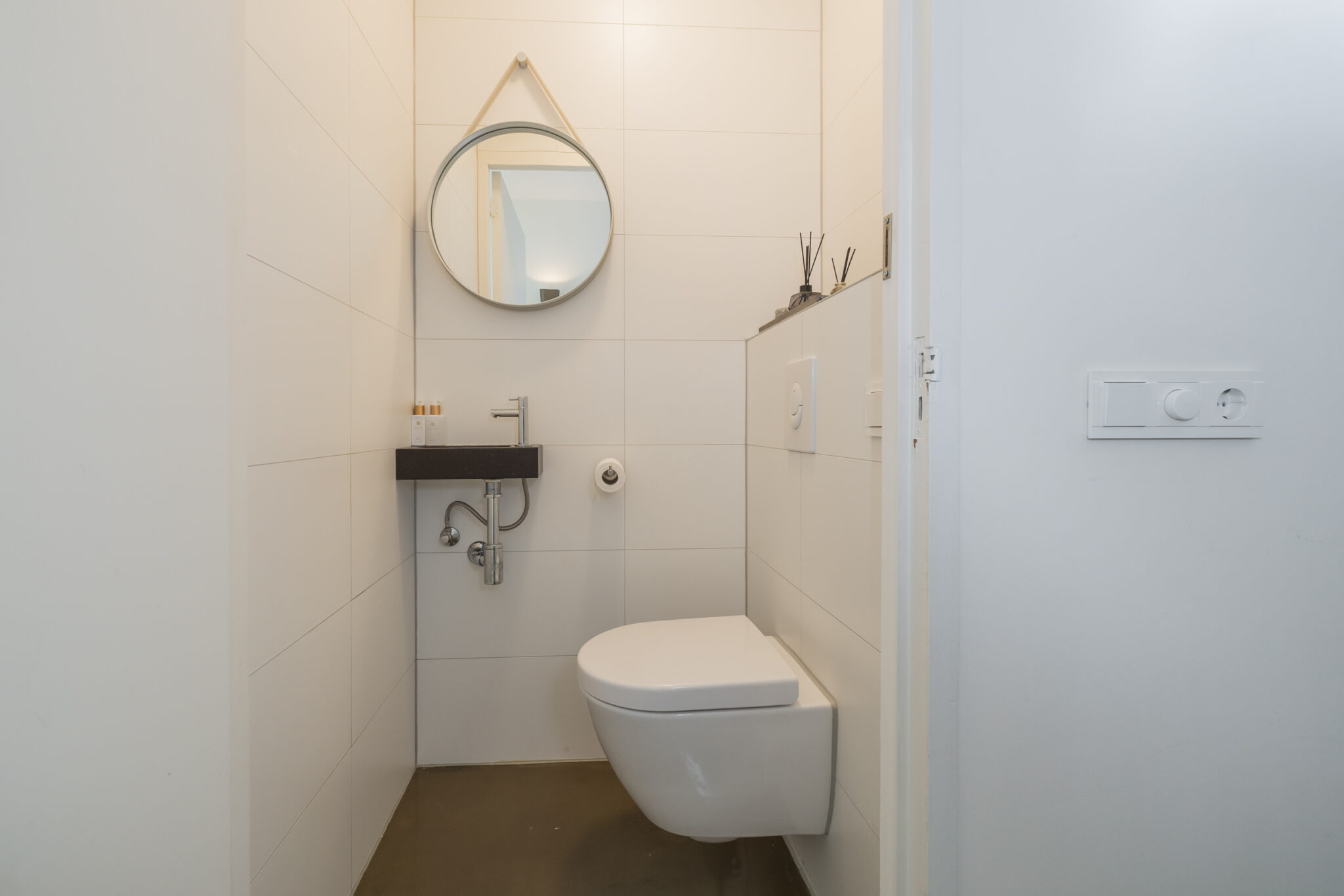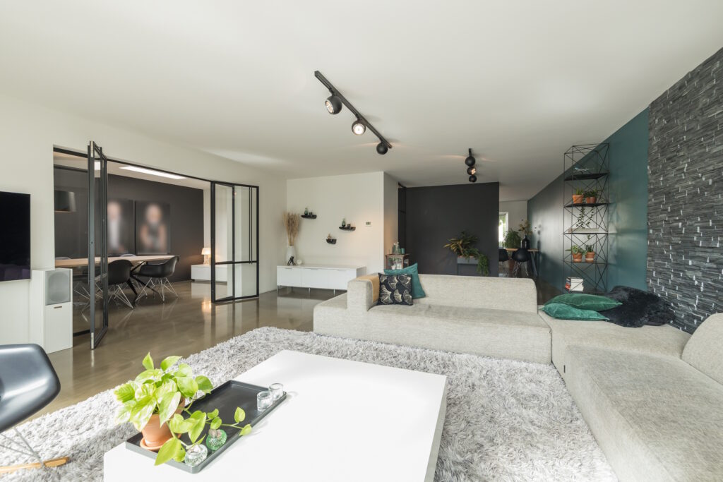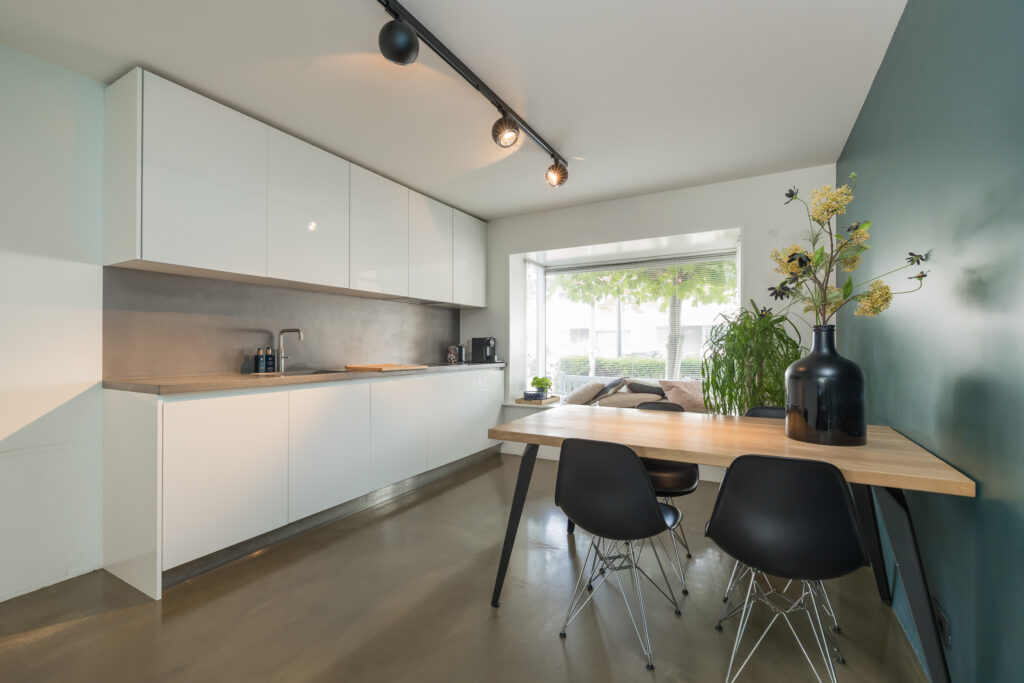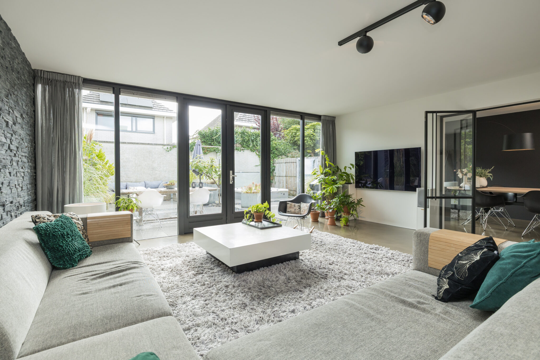 Entree, ruime hal met meterkast en separate toiletruimte met wandcloset en fonteintje. Vanuit de hal toegang tot de bijkeuken (mogelijkheid tot ombouwen garage) met aansluiting voor wasapparatuur. Ruime en lichte woonkamer met openslaande deuren naar de tuin en fraaie Taatsdeuren naar de eetkamer. Aan de voorzijde bevindt zich de open keuken met wit hoogglans keukenopstelling voorzien van diverse inbouwapparatuur, te weten: Quooker, koel/vriescombinatie, vaatwasser, inductiekookplaat en combi-oven. Vanuit de woonkamer toegang tot de tuin.