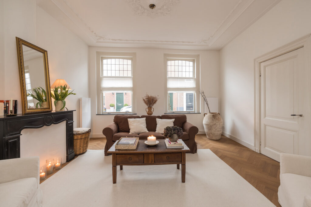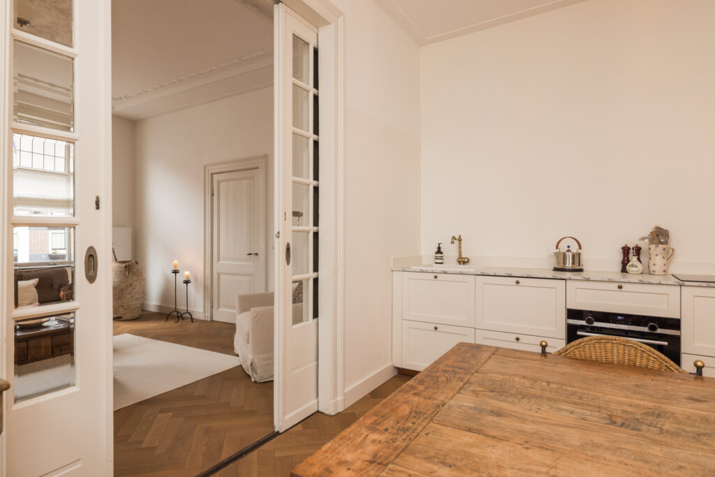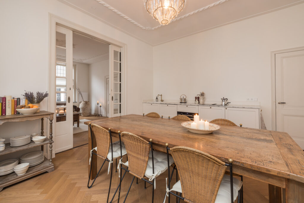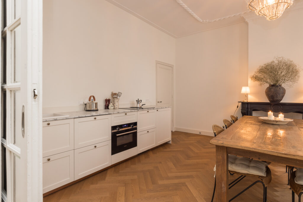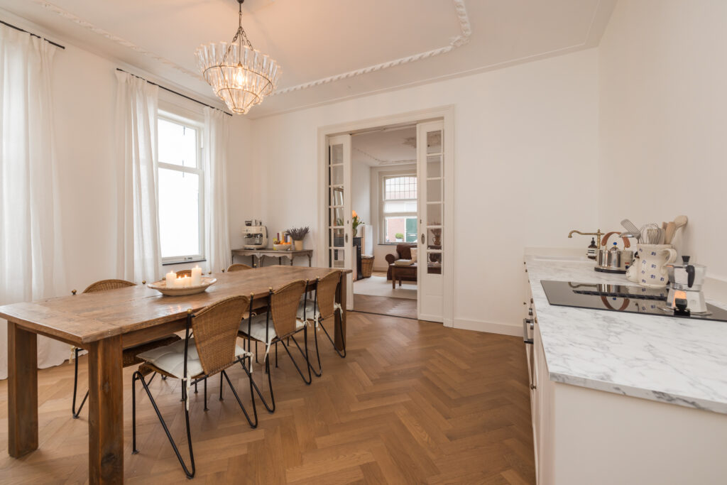 De woonkamer is bereikbaar via houten deuren en wordt gekenmerkt door fraaie glas-in-loodramen, voorzien van op maat gemaakte linnen Gotain gordijnen, een sierlijke schouw en originele plafond ornamenten. Dankzij de grote ramen is dit een bijzonder aangename en lichte leefruimte. De karakteristieke en-suite deuren verbinden de woonkamer met de eetkeuken. In 2024 is hier een nieuwe keuken geplaatst, voorzien van een inductiekookplaat met geïntegreerde afzuiging, een koelkast met vriesvak, combi-oven en een inbouwvaatwasser. Twee grote schuiframen zorgen voor veel lichtinval en bieden in de zomer een prettige verbinding met het hofje. In de gehele woonkamer en eetkeuken ligt een houten, smalle visgraatvloer.