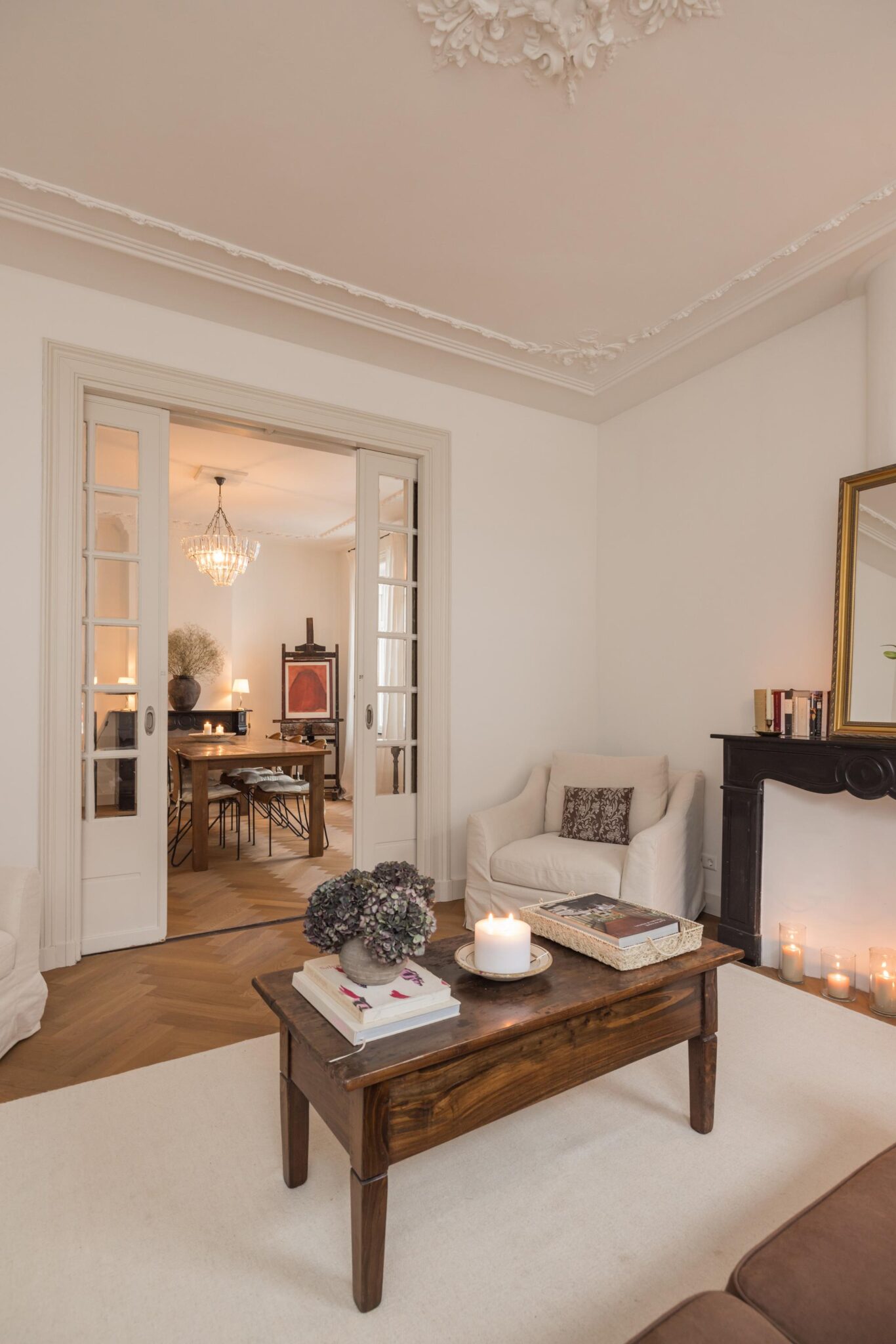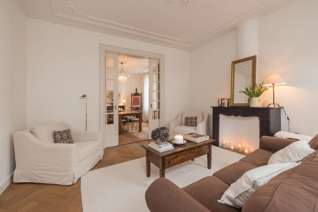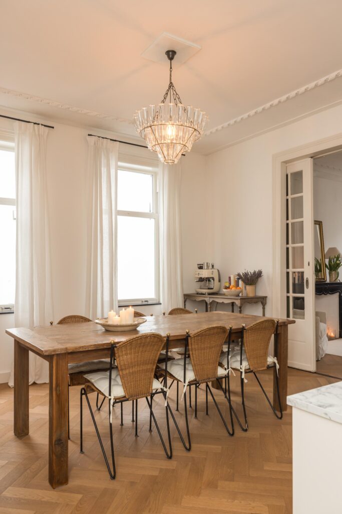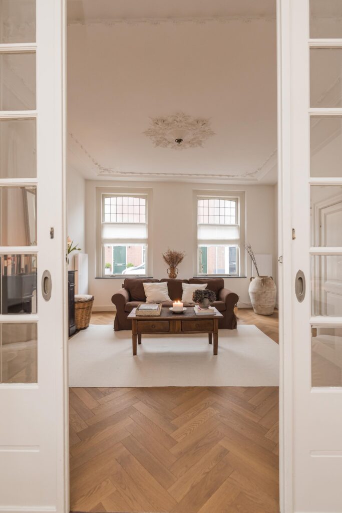 De woonkamer is bereikbaar via houten deuren en wordt gekenmerkt door fraaie glas-in-loodramen, voorzien van op maat gemaakte linnen Gotain gordijnen, een sierlijke schouw en originele plafond ornamenten. Dankzij de grote ramen is dit een bijzonder aangename en lichte leefruimte. De karakteristieke en-suite deuren verbinden de woonkamer met de eetkeuken. In 2024 is hier een nieuwe keuken geplaatst, voorzien van een inductiekookplaat met geïntegreerde afzuiging, een koelkast met vriesvak, combi-oven en een inbouwvaatwasser. Twee grote schuiframen zorgen voor veel lichtinval en bieden in de zomer een prettige verbinding met het hofje. In de gehele woonkamer en eetkeuken ligt een houten, smalle visgraatvloer.