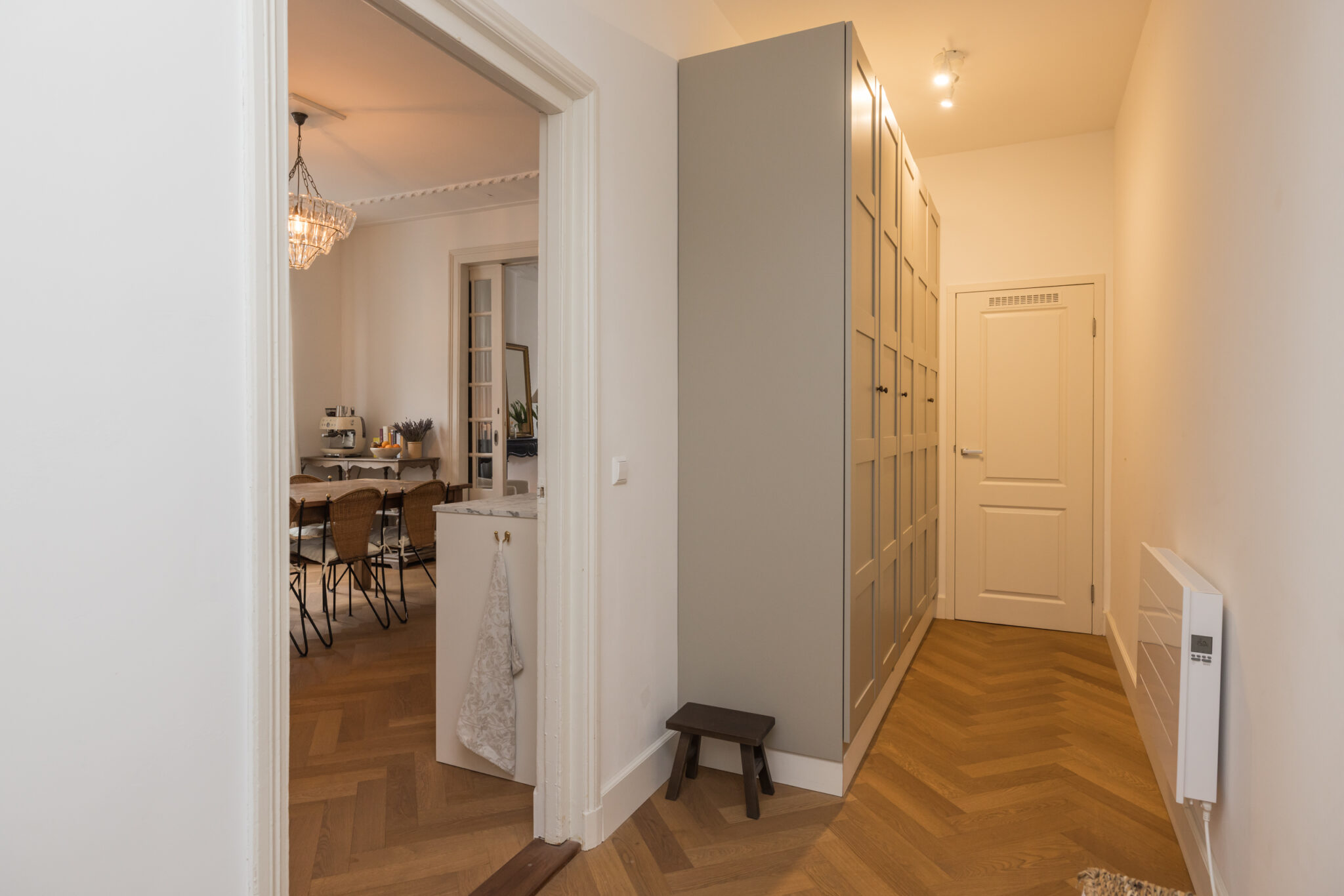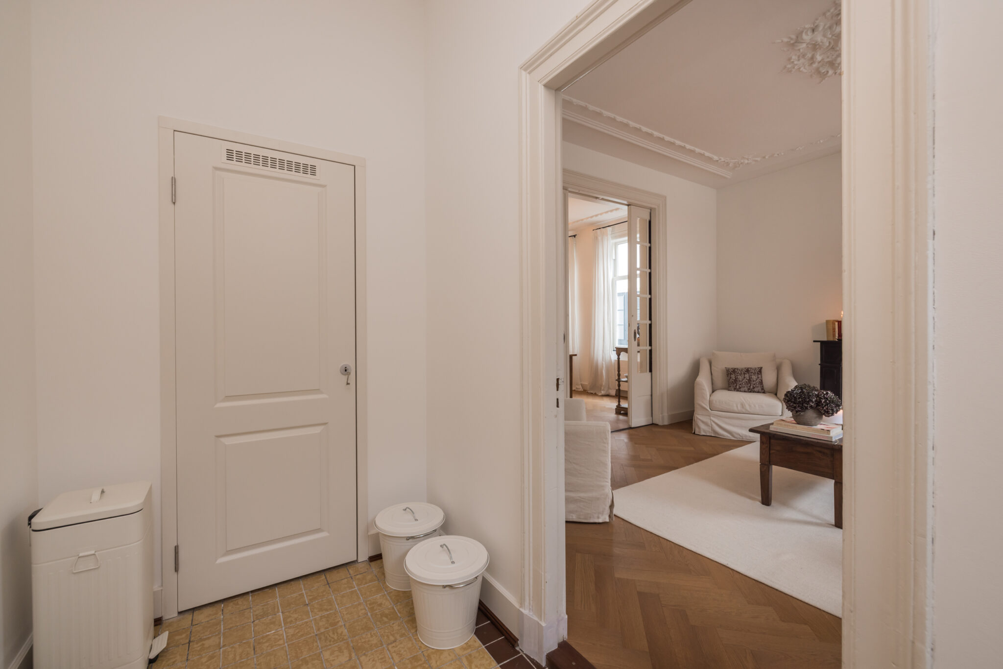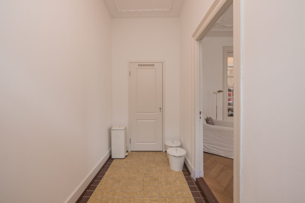 Via de eigen entree betreedt u de woning. De hal met een plafondhoogte van ruim drie meter, is voorzien van originele ornamenten uit circa 1880–1910. Hier bevinden zich de meterkast, wateraansluiting en een praktische bergkast.