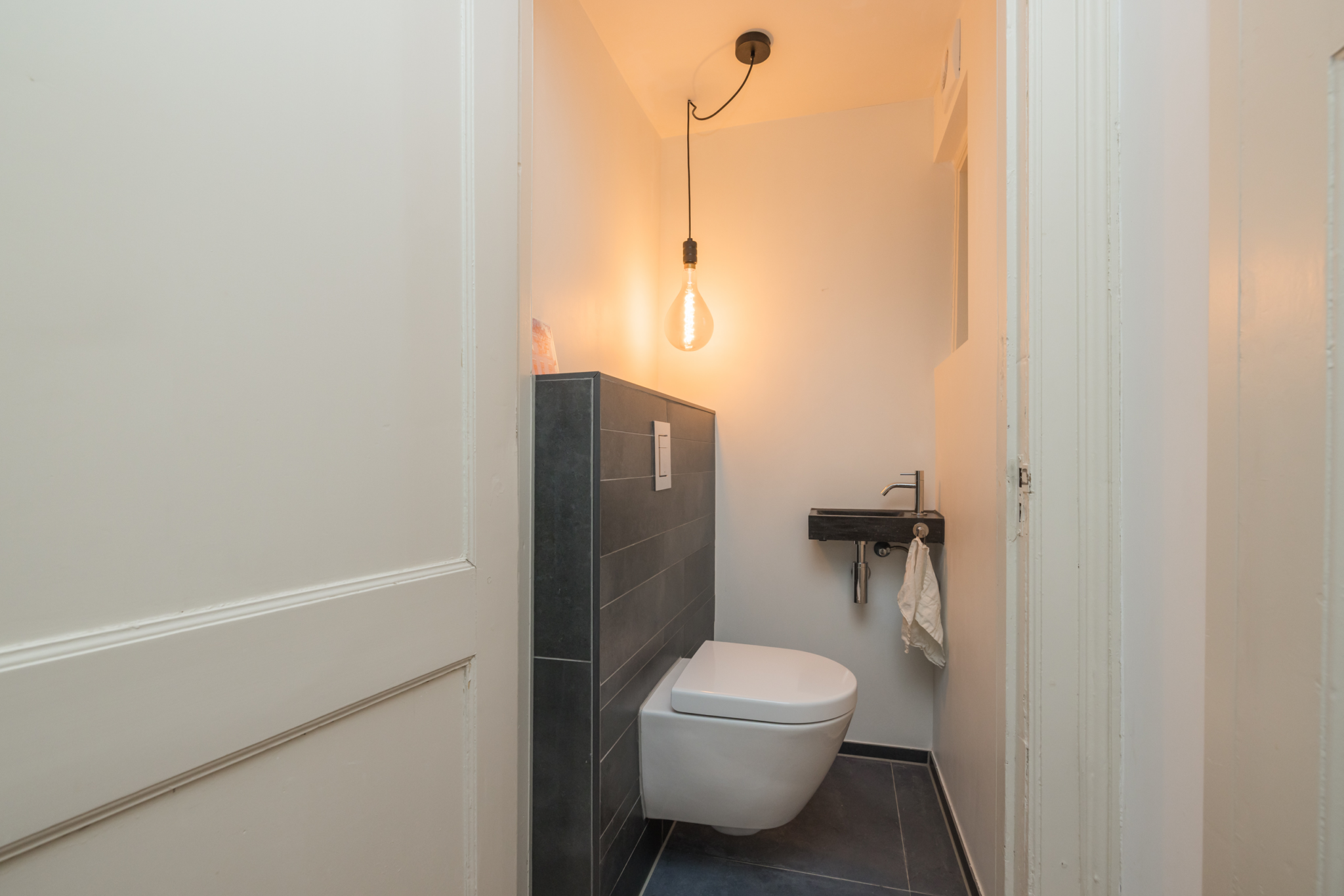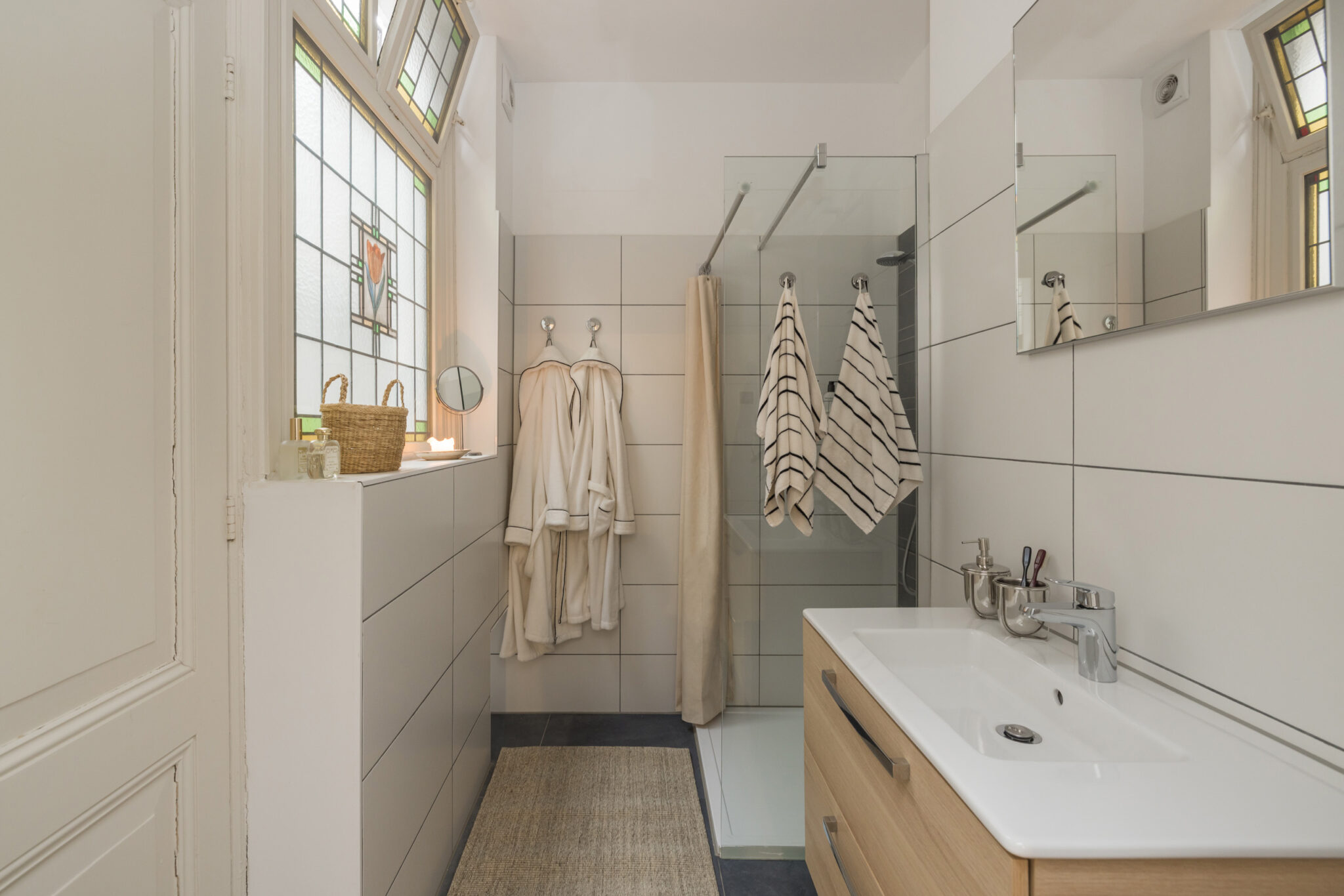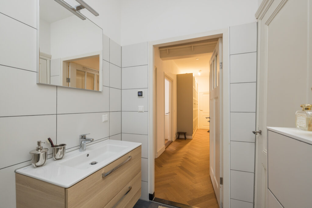 De hal beschikt over kasten van ruim drie meter breed en biedt veel praktische bergruimte. In de aangrenzende wasruimte bevinden zich de wasmachine en droger. De hal biedt tevens de mogelijkheid om een kleine kamer te realiseren. Ook bevindt zich hier het toilet, voorzien van mechanische ventilatie en een te openen raam, en de badkamer. De badkamer wordt gekenmerkt door een origineel glas-in-lood raam met een tulp. Daarnaast beschikt de ruimte over een wastafelmeubel, vloerverwarming, een praktisch ingerichte doucheruimte en een ruime bergkast.