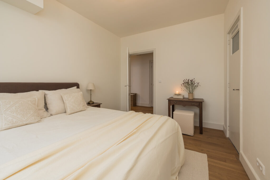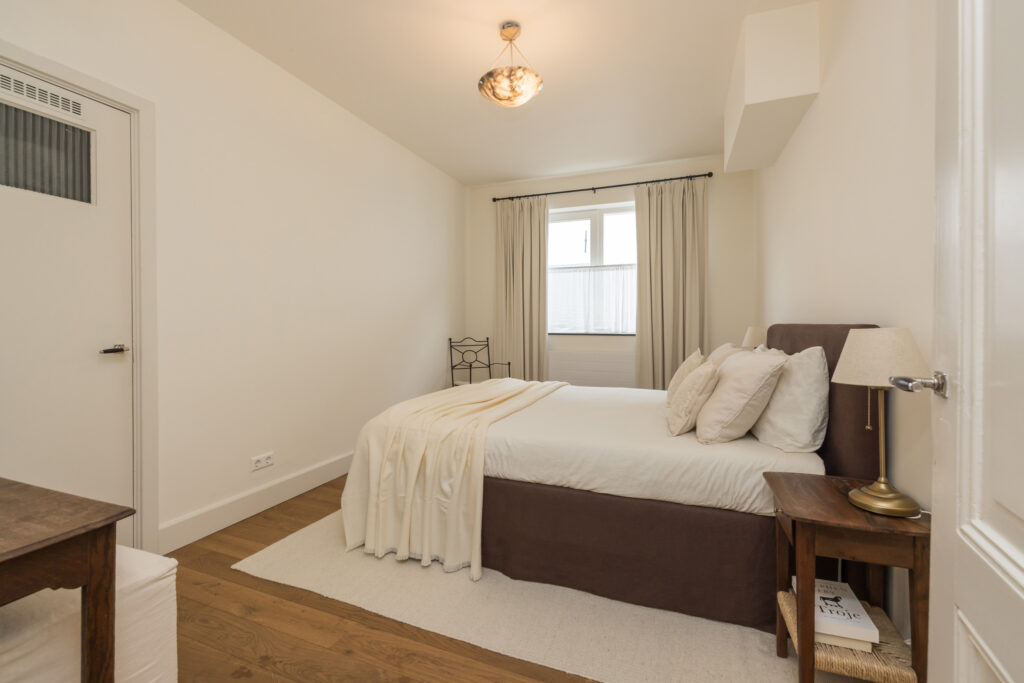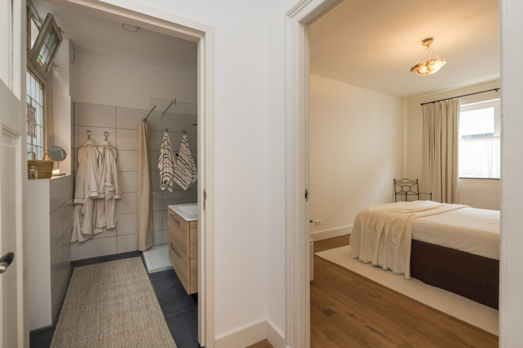 De slaapkamer is voorzien van een houten vloer, biedt voldoende ruimte aan een groot bed én een bureau. De ramen zorgen voor veel daglicht en in de ruimte bevindt zich tevens een ruime bergkast met daarin de elektrische boiler.