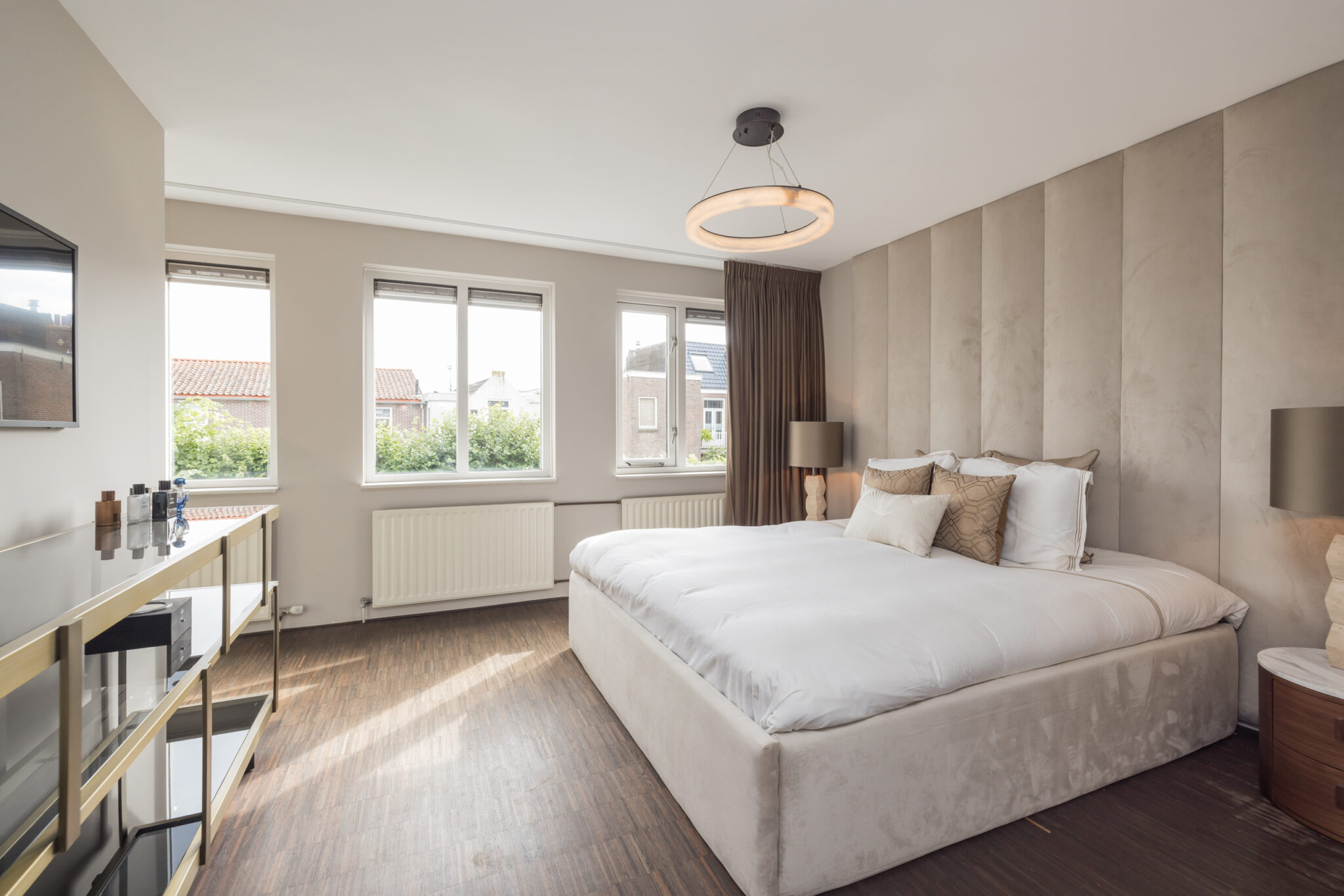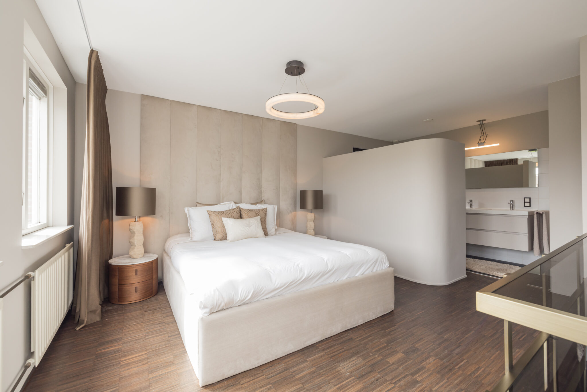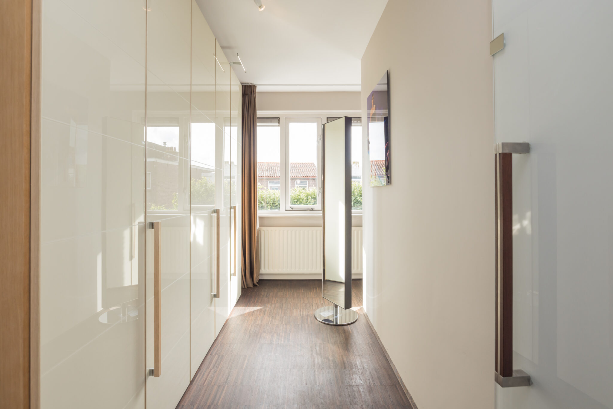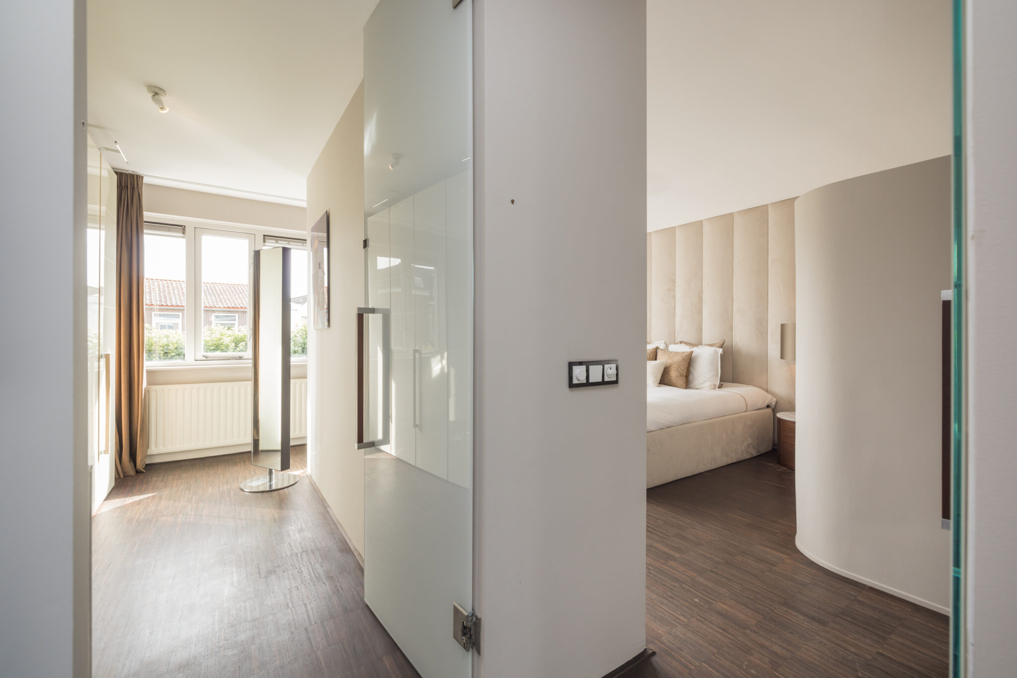 Overloop met mogelijkheid tot bijvoorbeeld een werkplek op de entresol. 1e slaapkamer aan de voorzijde. Royale 2e (ouder)slaapkamer aan de achterzijde met walk-in closet en badkamer en-suite met ligbad, douchecabine, toilet en wastafelmeubel met dubbele wasbak.