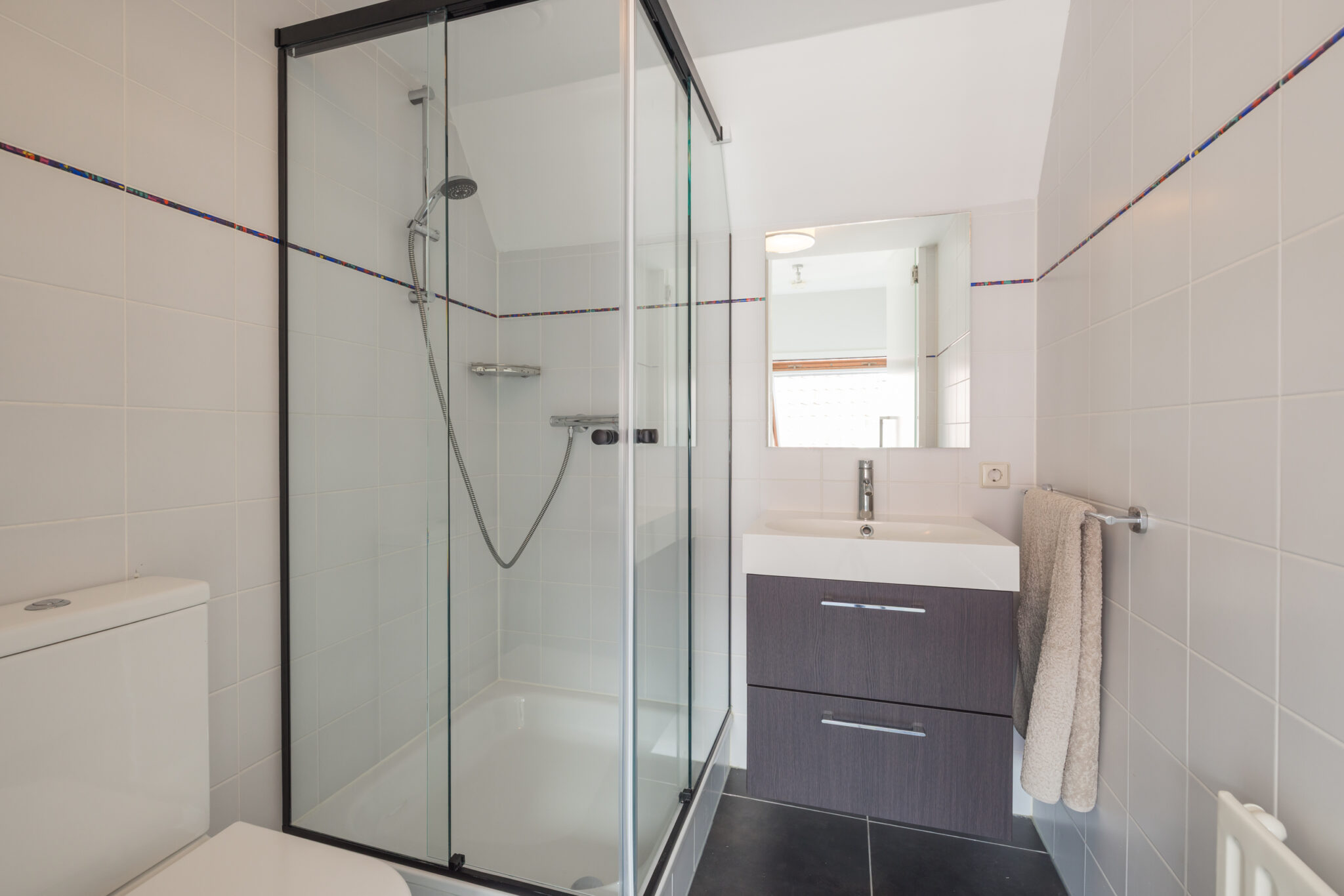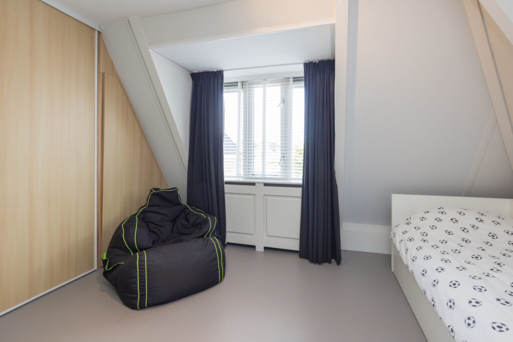 Overloop met groot Velux dakraam. 3e slaapkamer aan de achterzijde met dakkapel en schuifkastenwand. 4e slaapkamer aan de voorzijde met dakkapel en schuifkastenwand. 2e badkamer met douchecabine, wastafelmeubel en toilet.