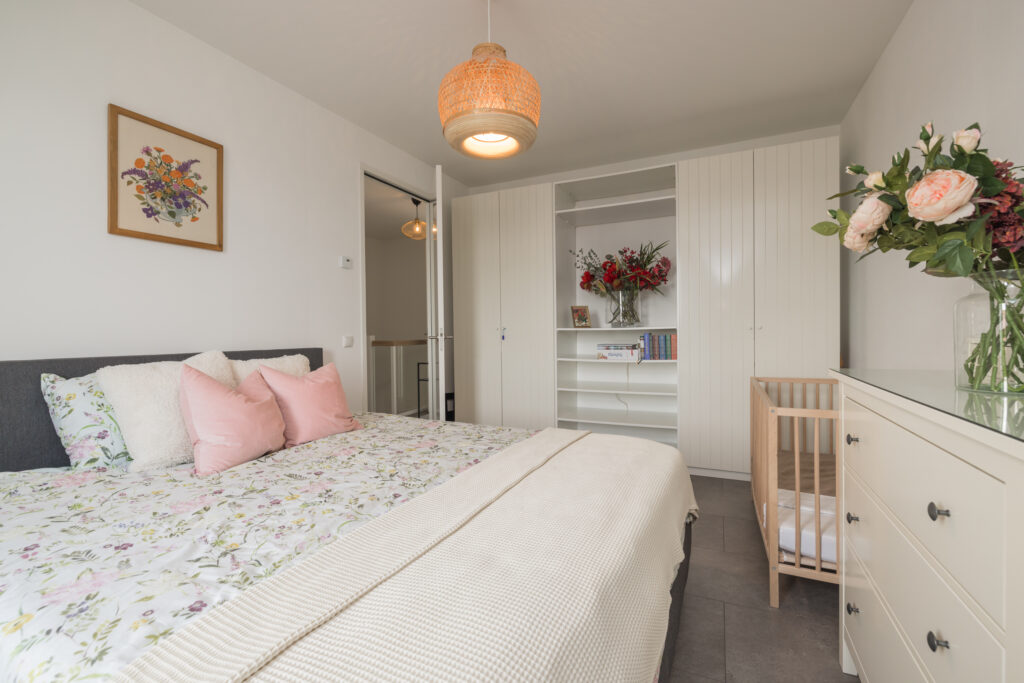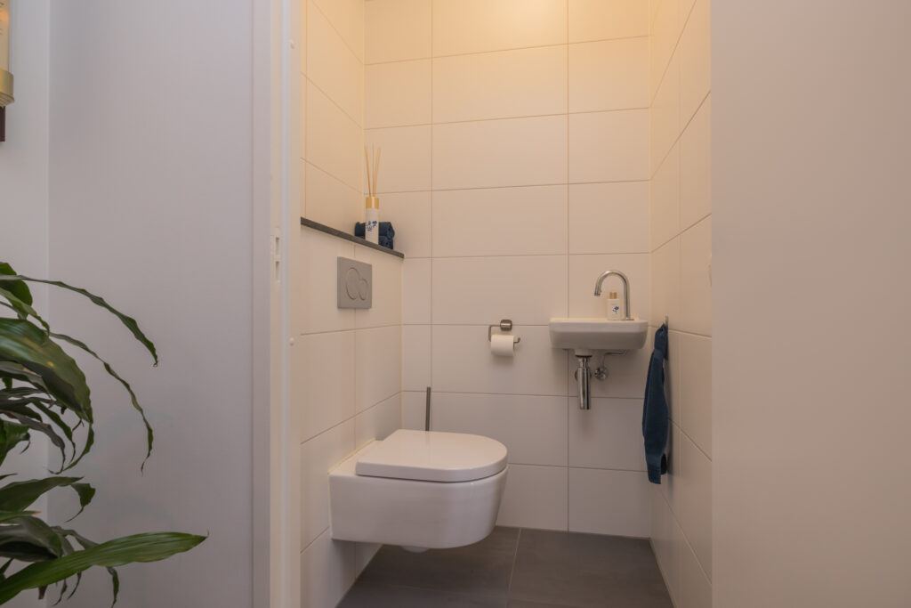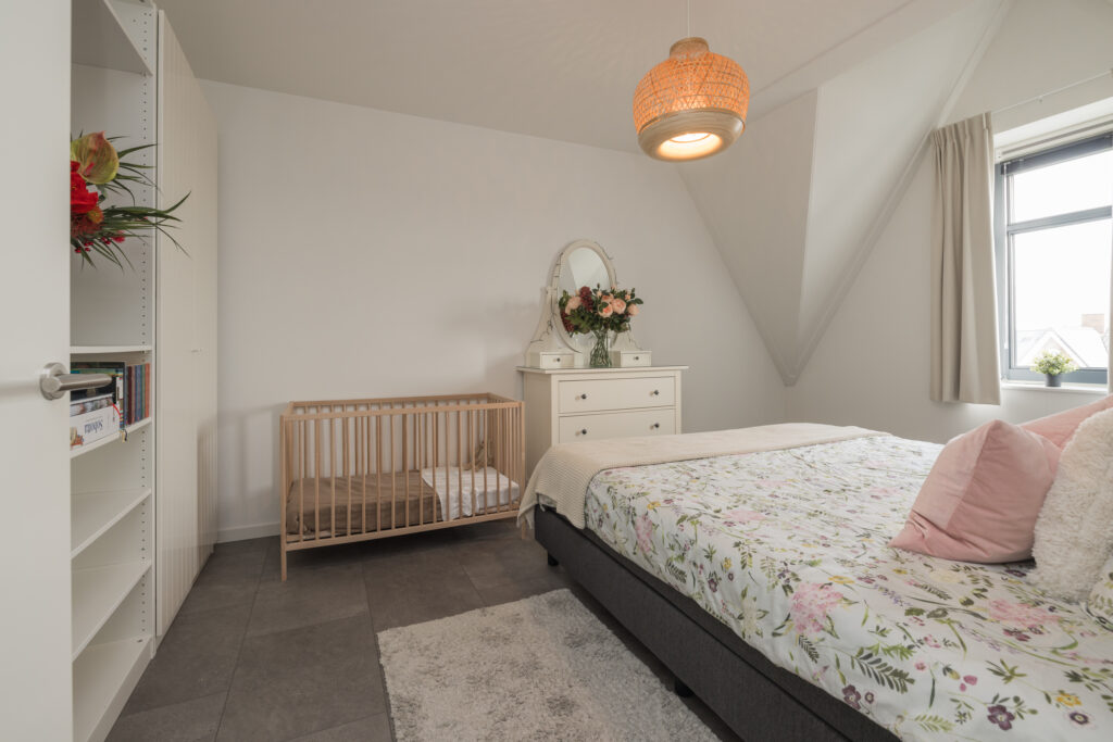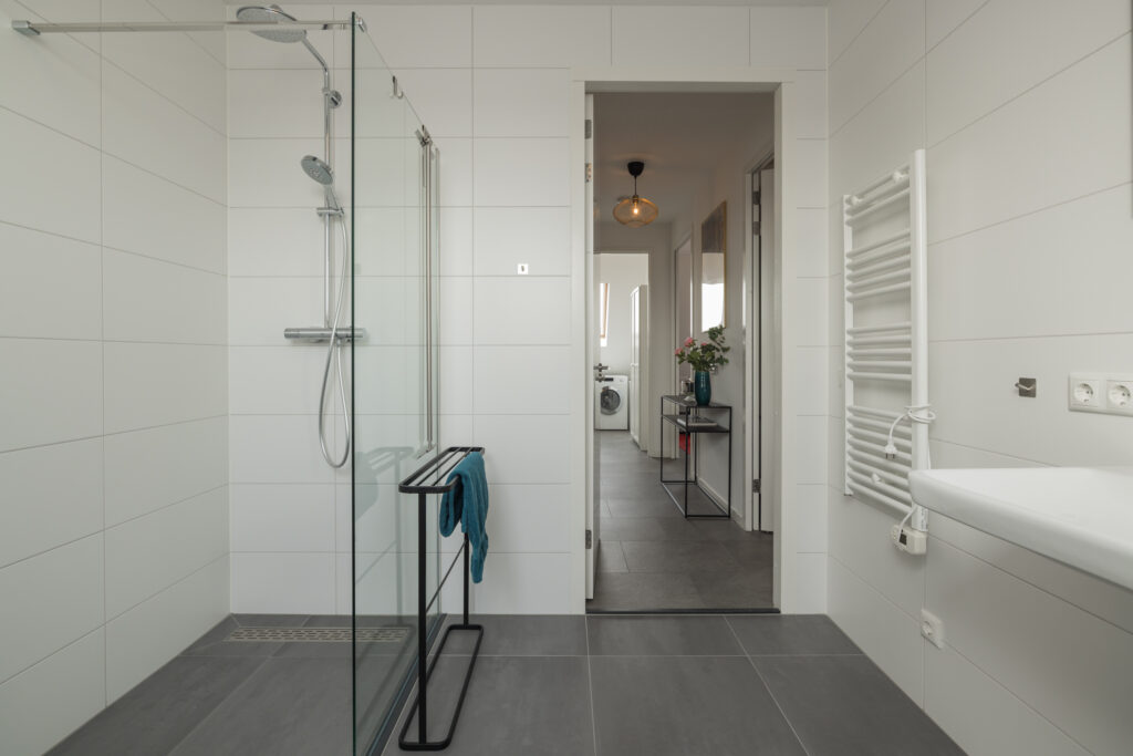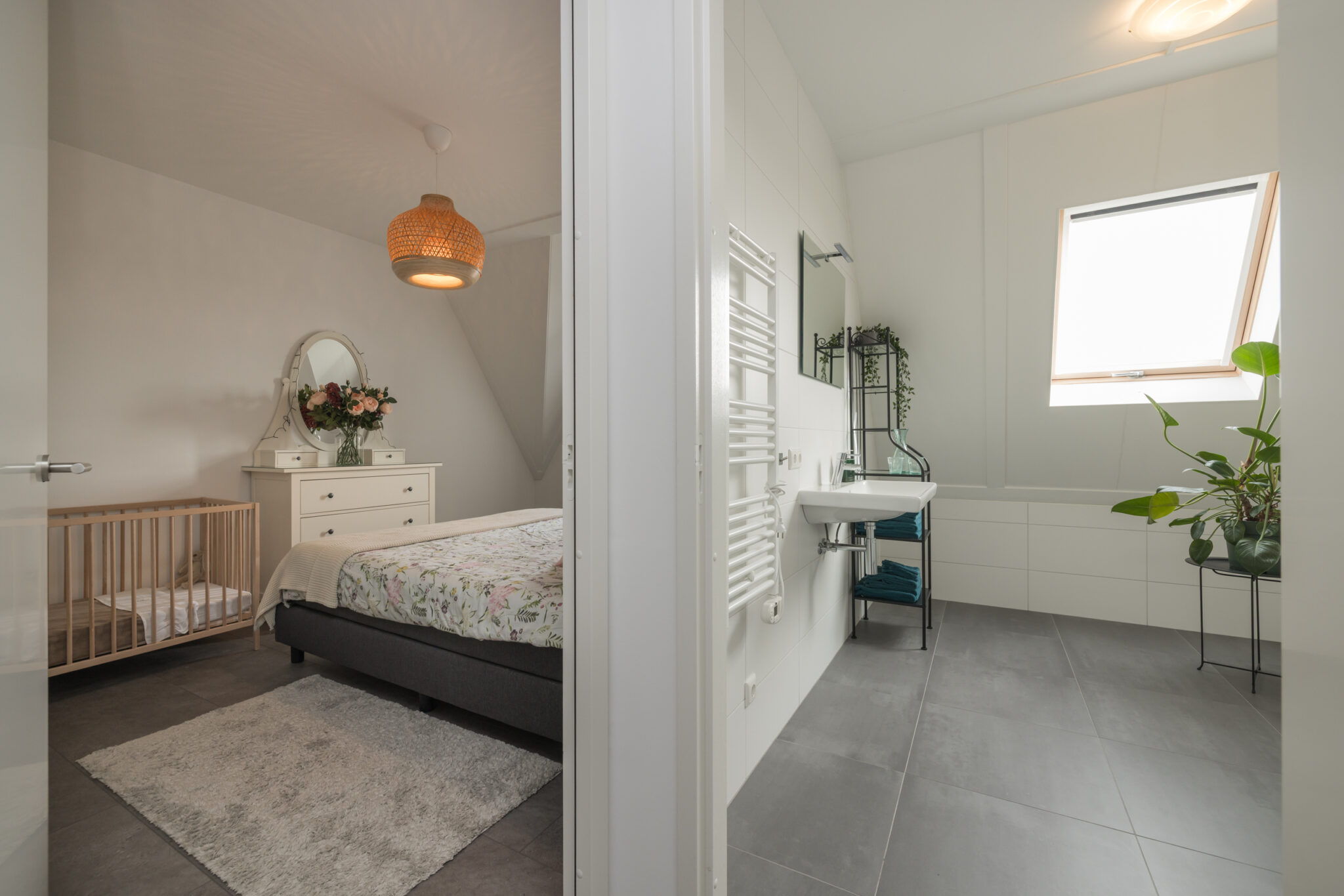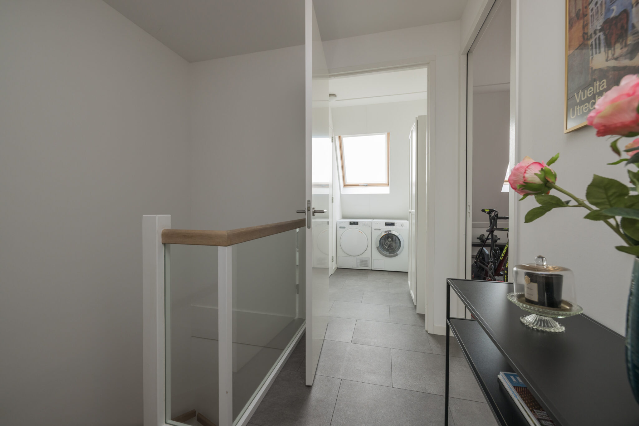 De bovenste verdieping biedt nog eens twee ruime slaapkamers en een tweede badkamer met inloopdouche en wastafel. Daarnaast is hier een keurig afgewerkte wasruimte aanwezig. Achter een aparte deur bevinden zich de aansluitingen voor wasmachine en droger en daarachter ligt nog een separate technische ruimte met de installaties van de woning. Alles is netjes weggewerkt en praktisch ingericht.