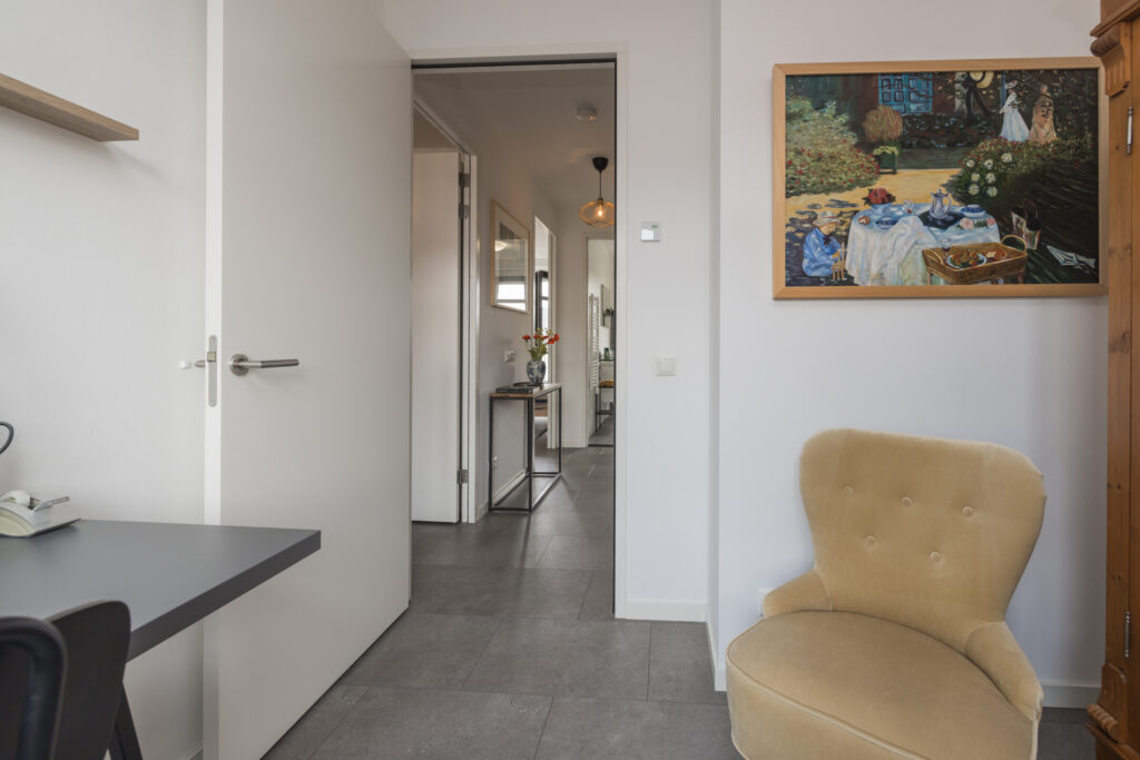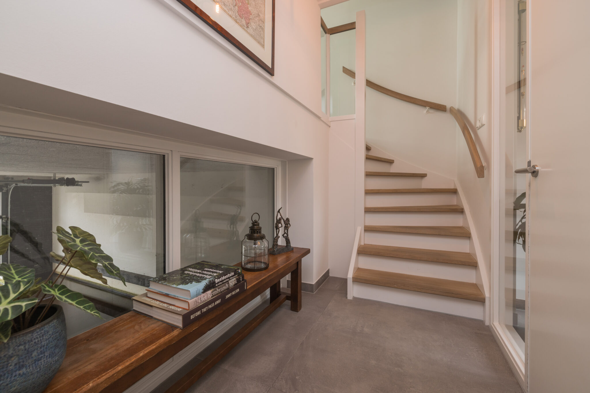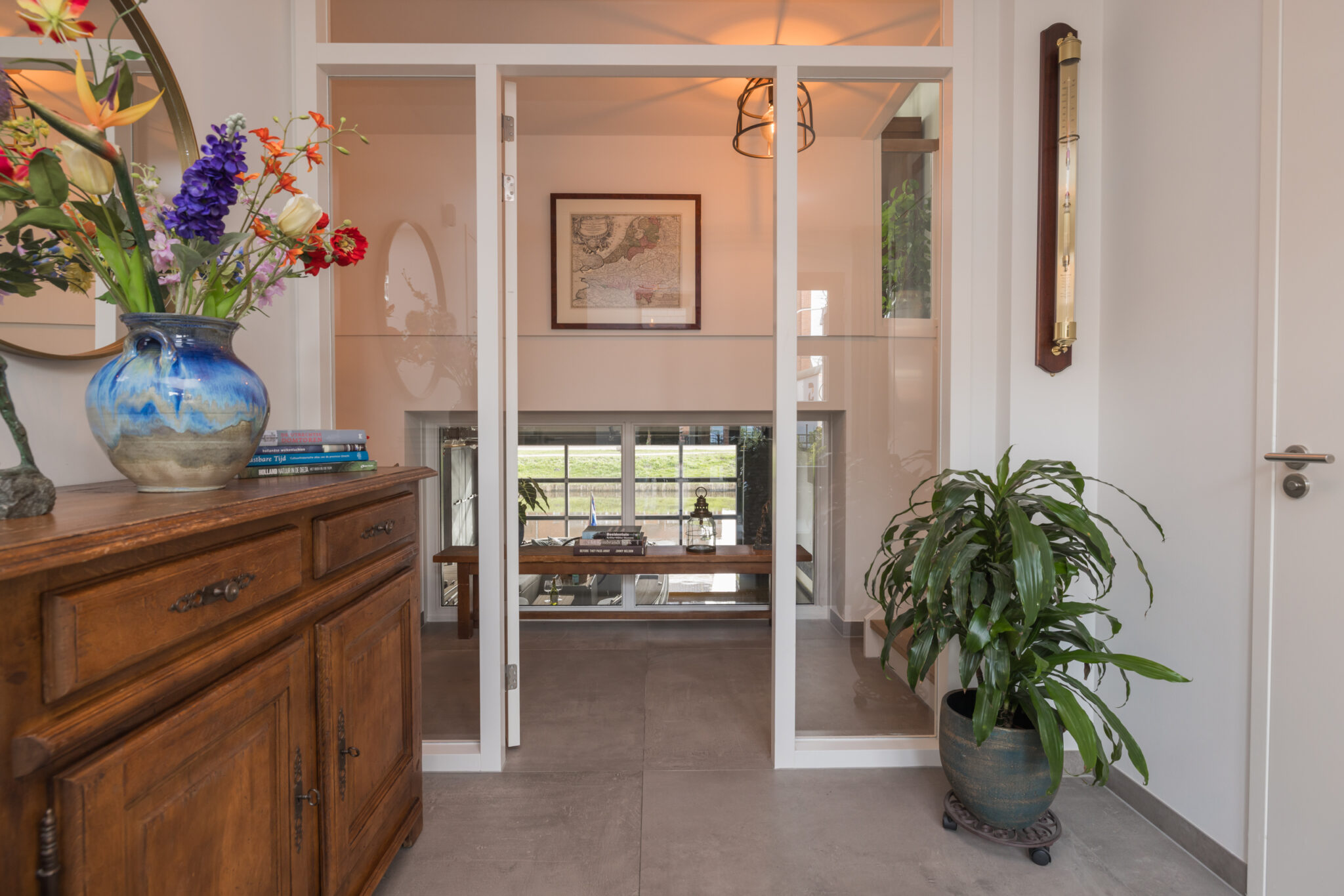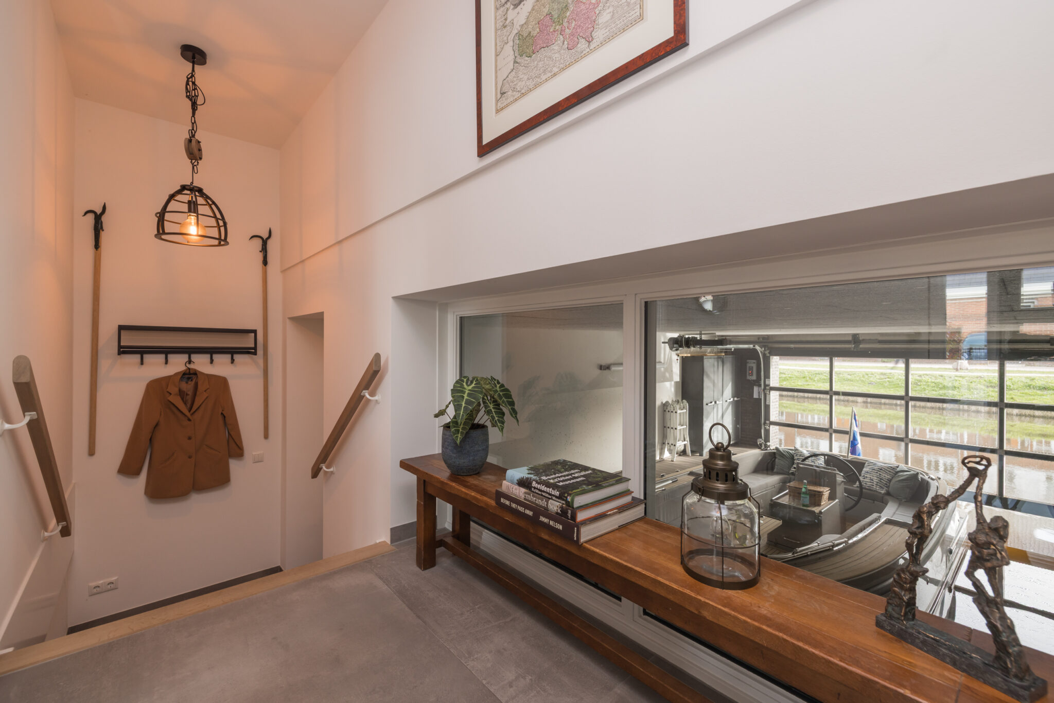 Vanuit de hal is er direct zicht op één van de meest bijzondere onderdelen van deze woning: via een tussendeur en een korte trap bereik je het inpandige botenhuis.