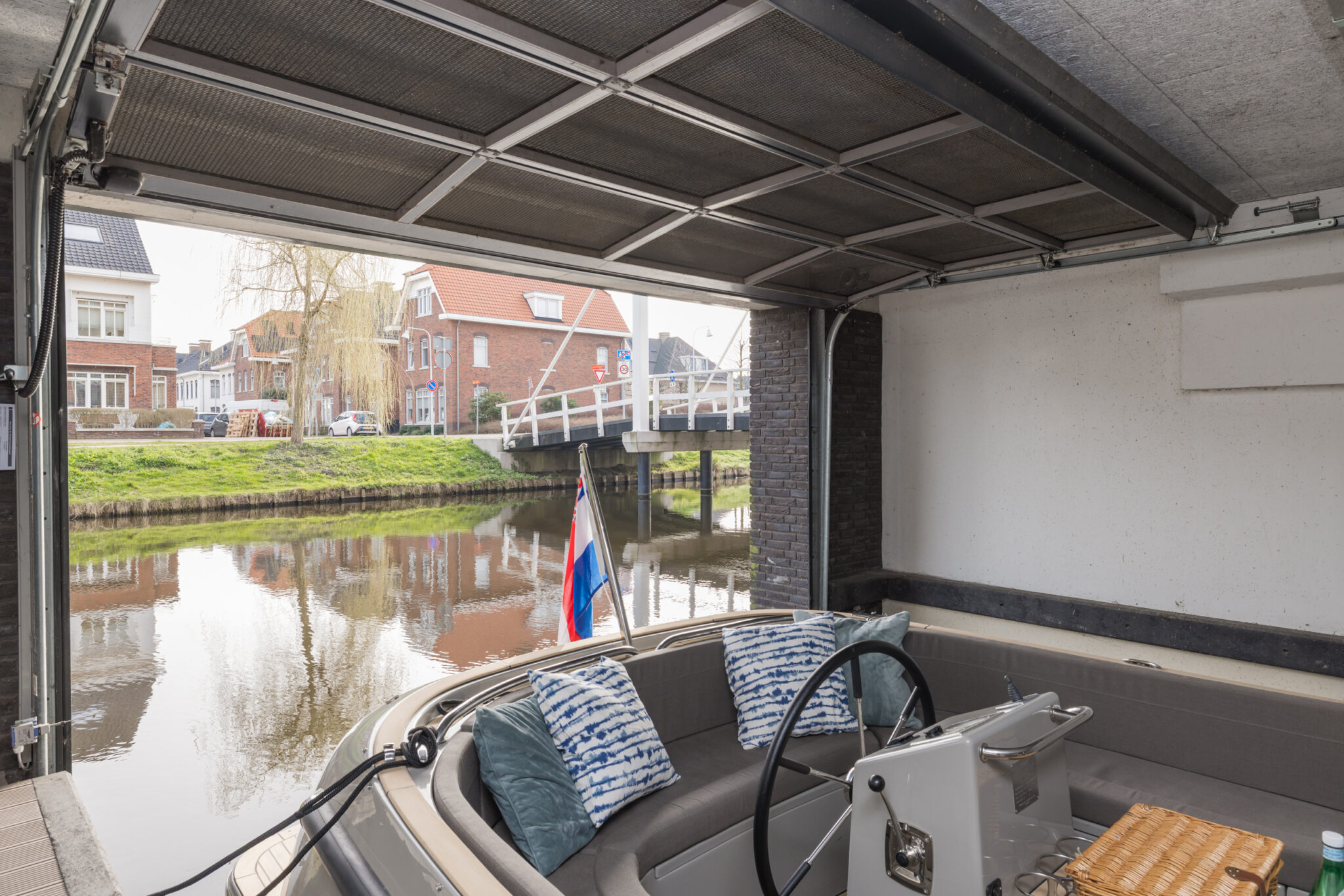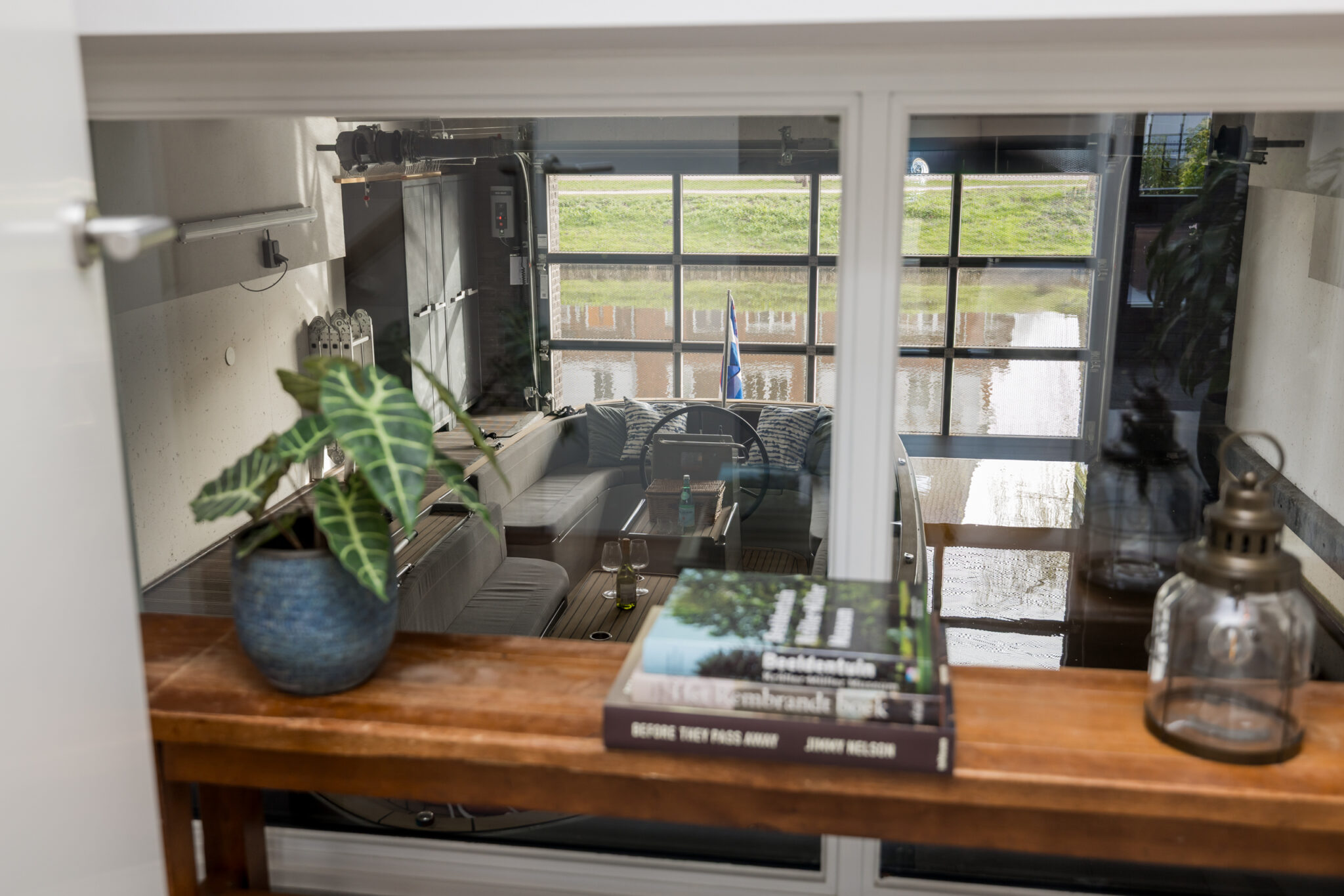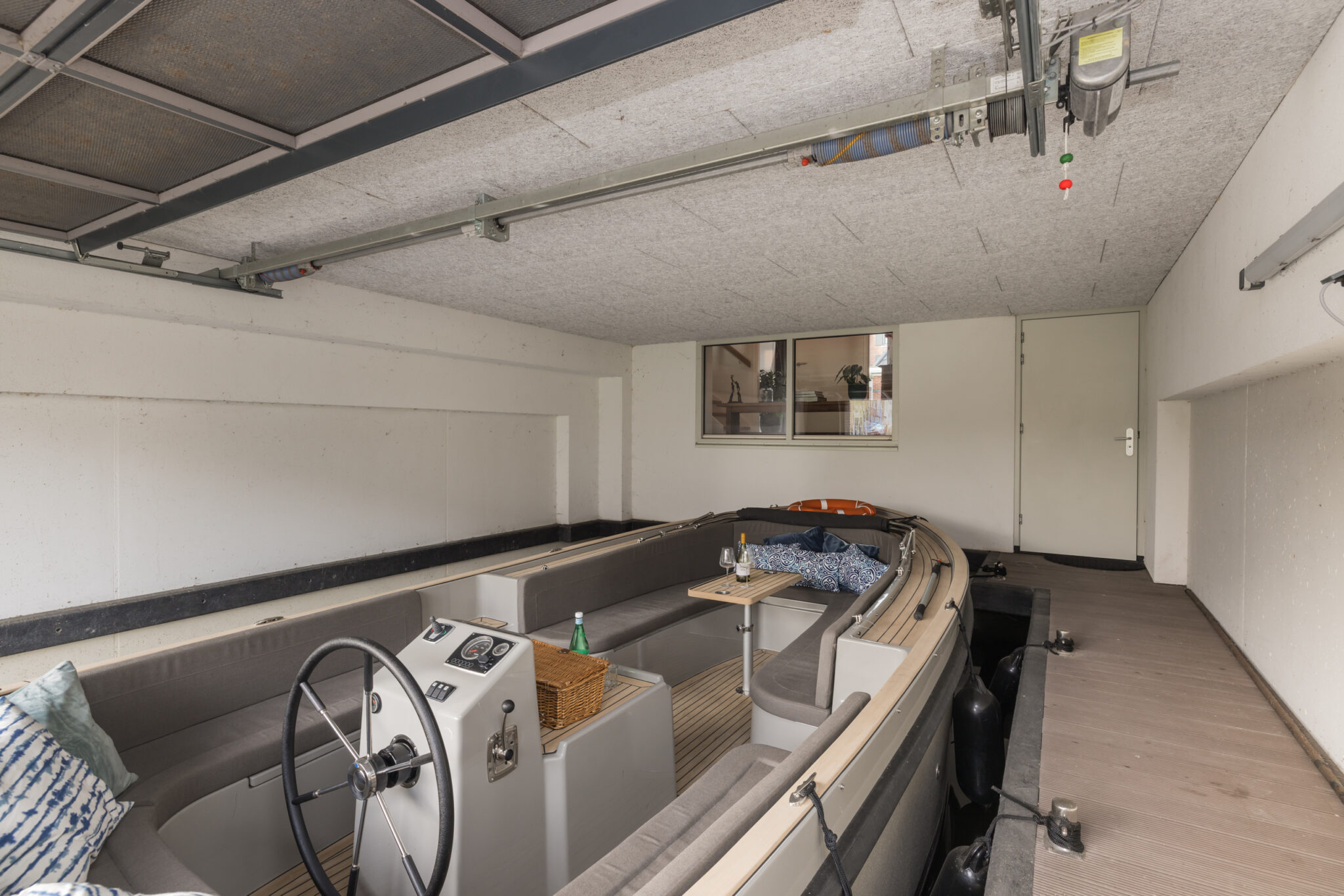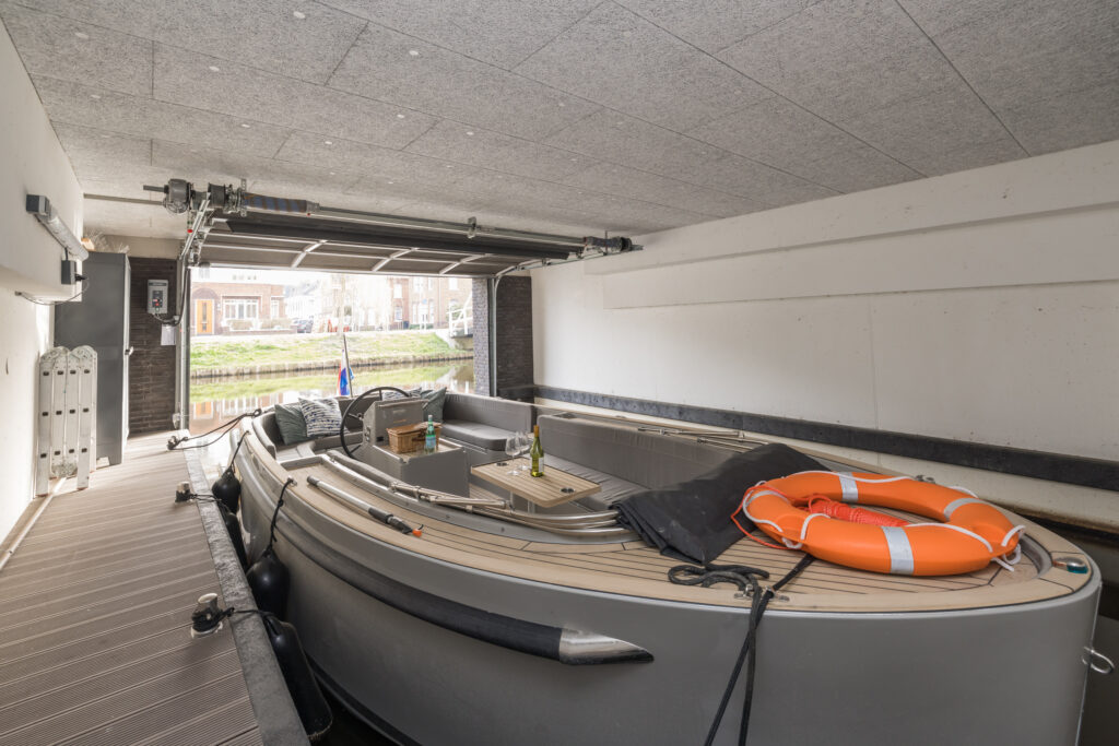Een woning die zich onderscheidt door zijn bijzondere opzet: onder het huis ligt namelijk een inpandig botenhuis, waardoor je letterlijk vanuit huis het water op vaart.