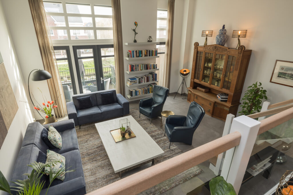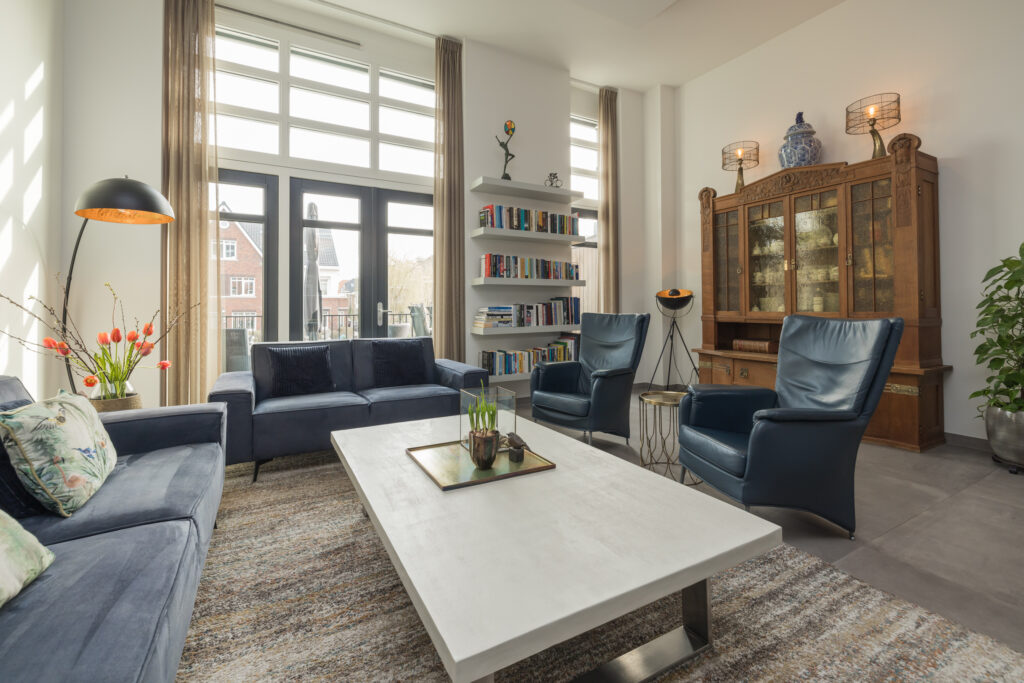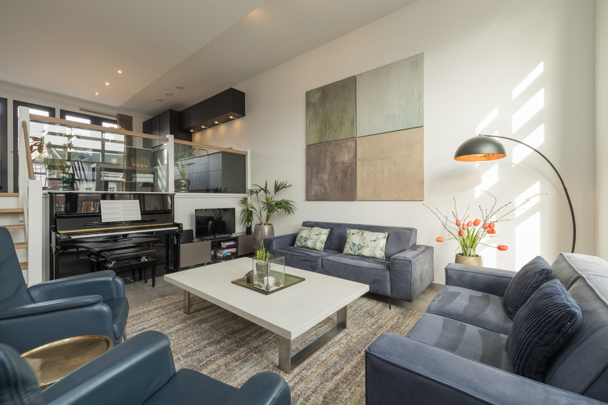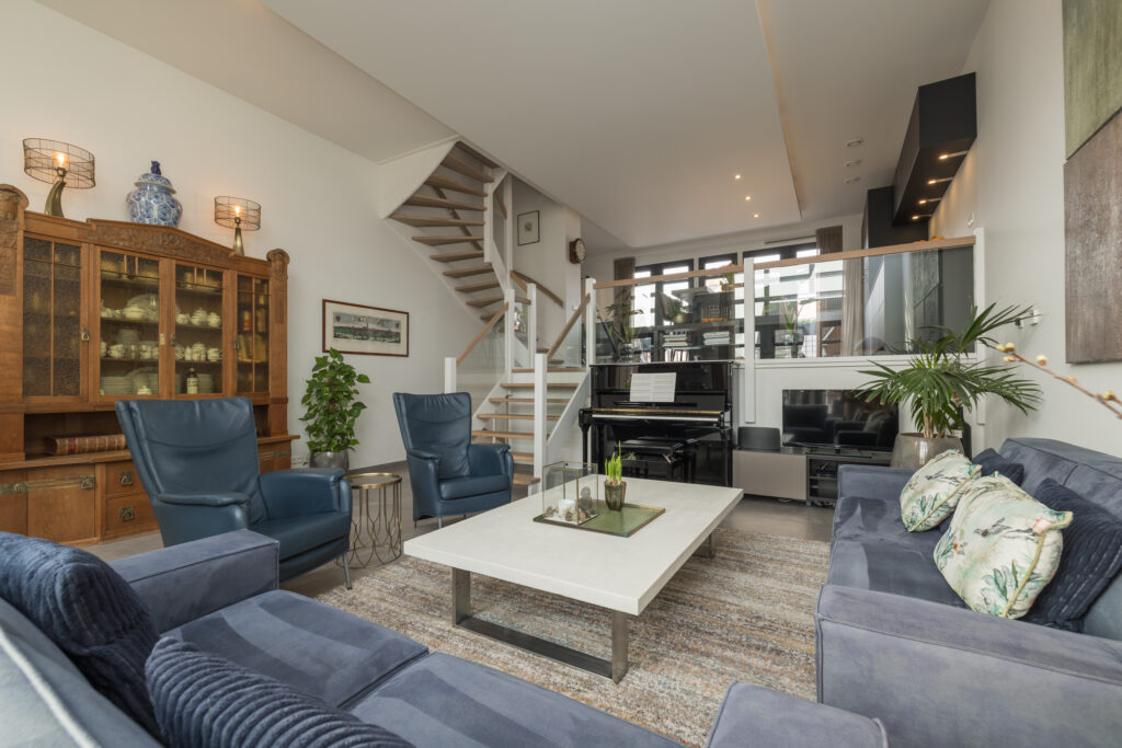Een halve trap omhoog kom je in de woonkamer. Deze lichte leefruimte ligt aan de achterzijde van de woning en grenst direct aan het balkon aan het water, een heerlijke plek om in de ochtend rustig wakker te worden met een kop koffie.