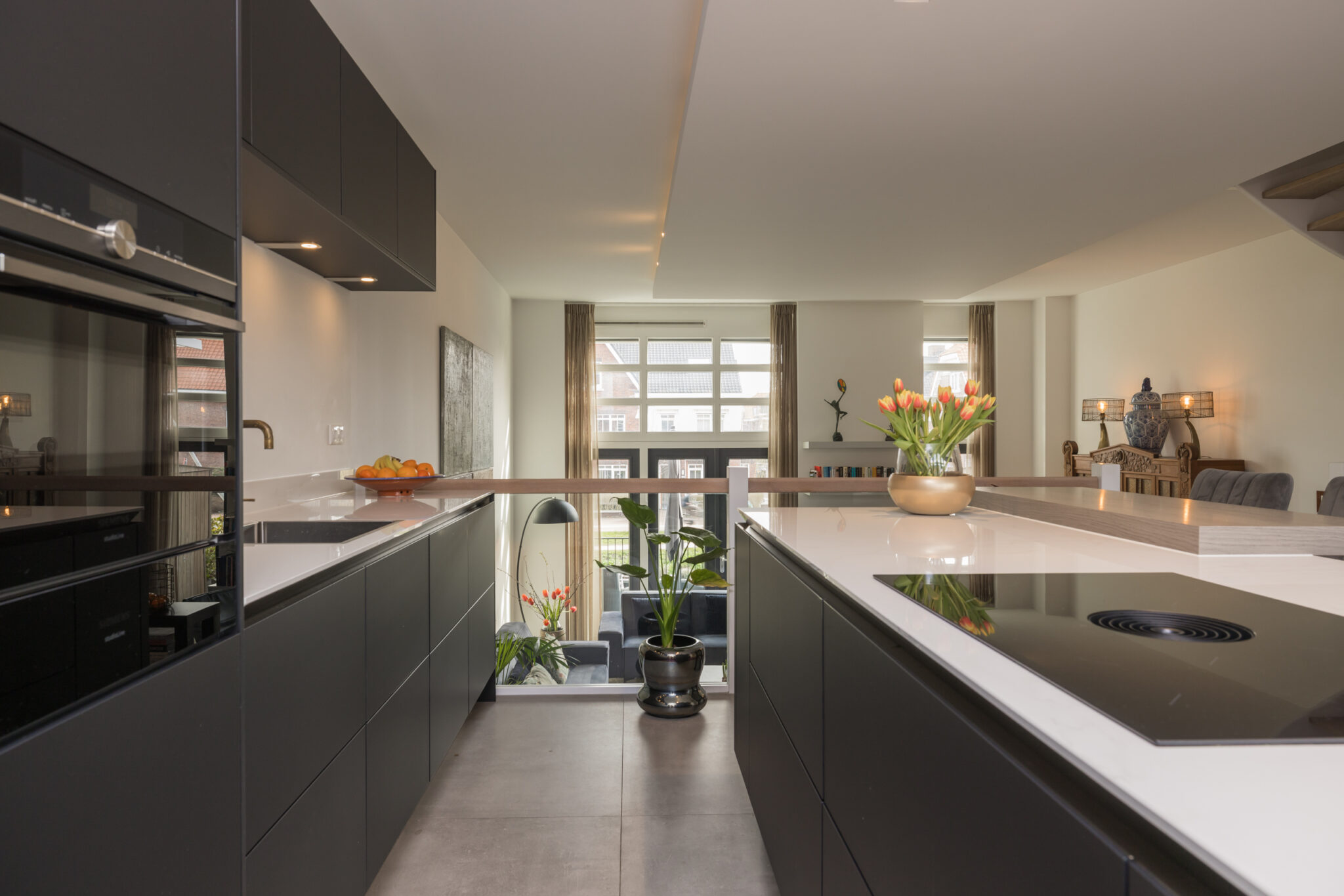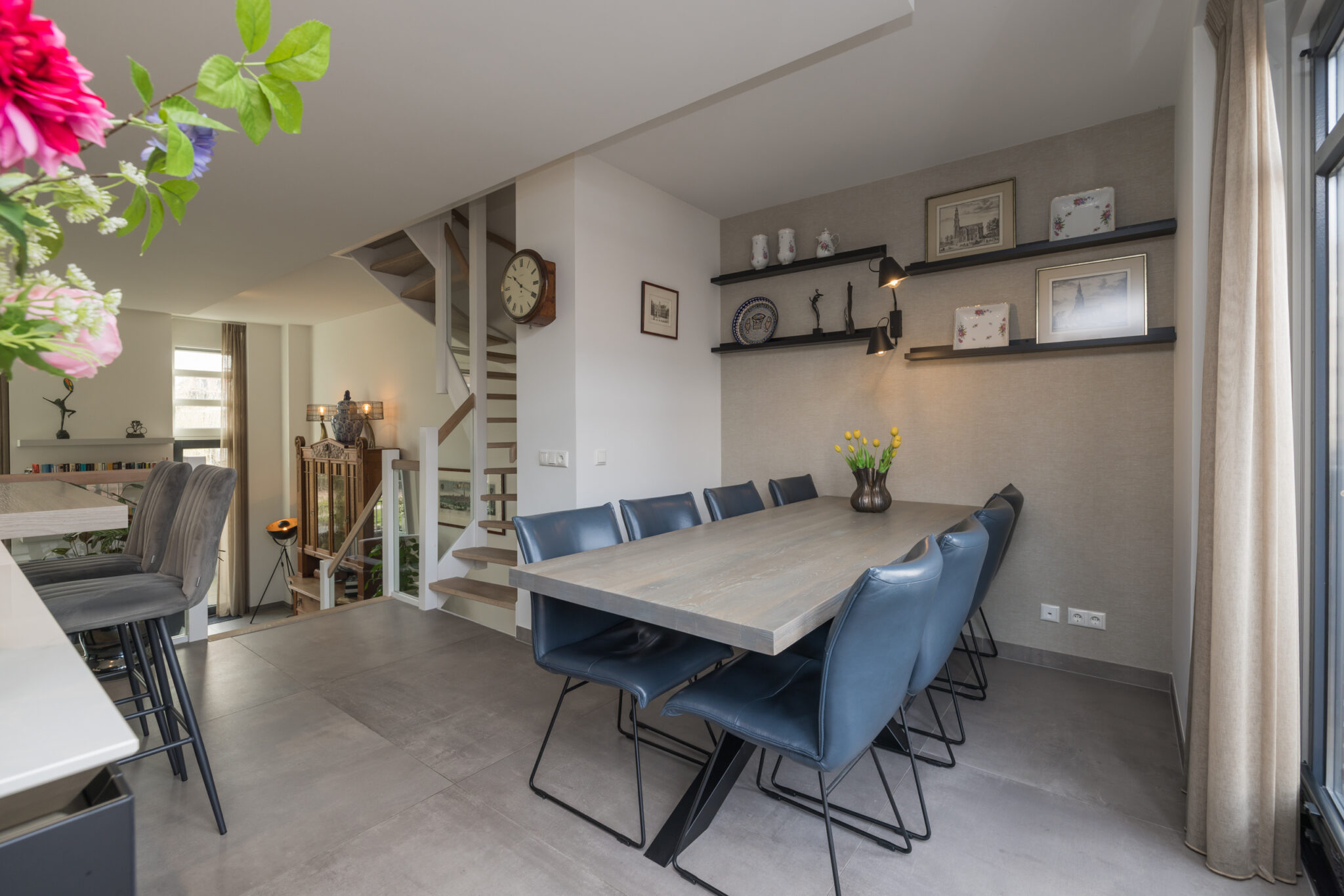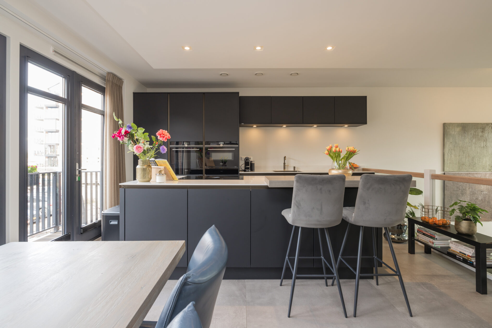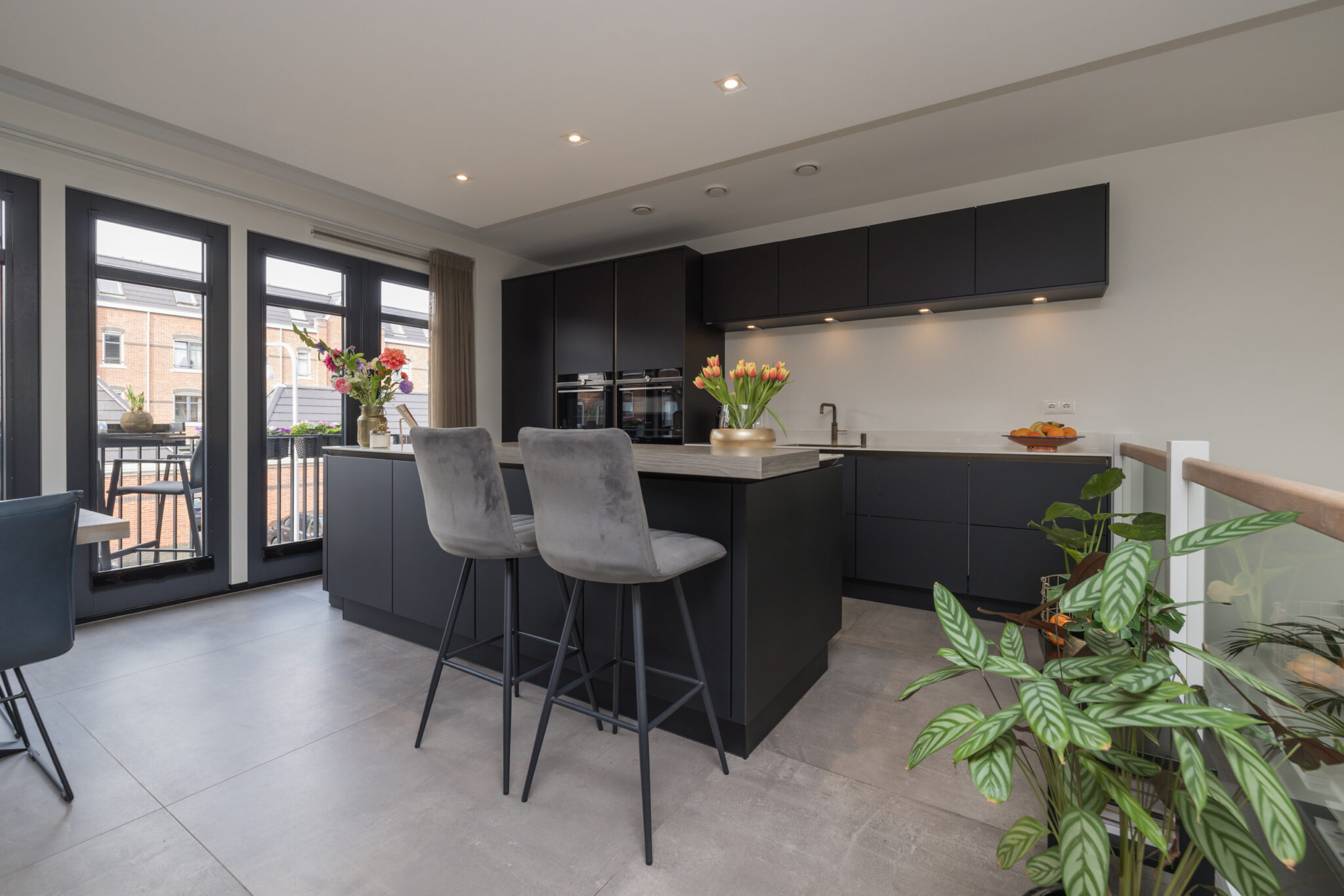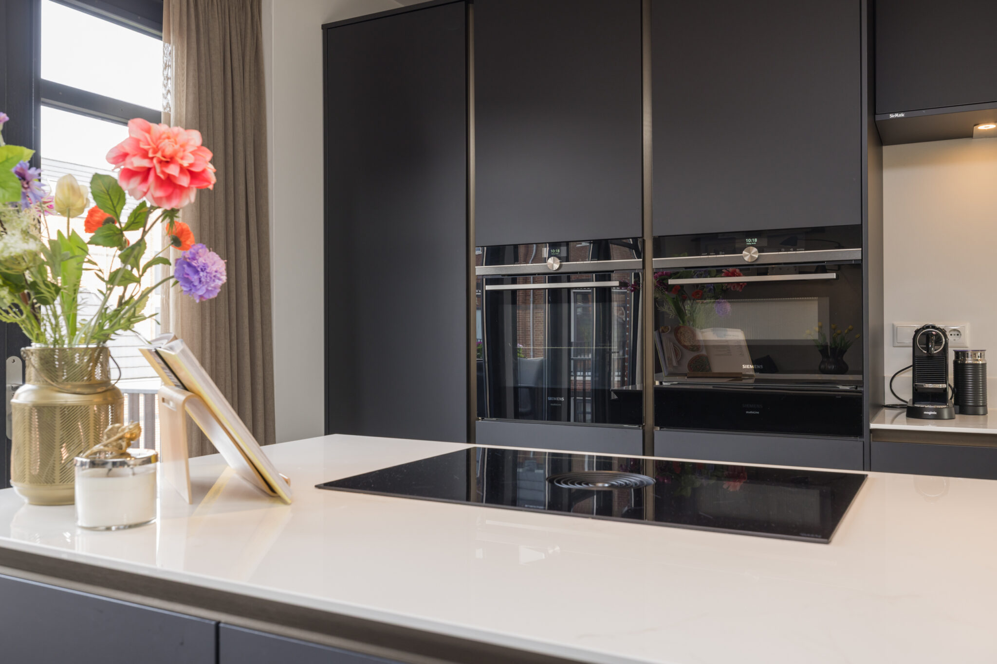 Vanuit de woonkamer loop je via een paar treden naar de hoger gelegen woonkeuken. De moderne keuken is ruim opgezet en voorzien van een kookeiland en diverse inbouwapparatuur. Er is hier volop plek voor een grote eettafel, waardoor dit een fijne plek is om samen te koken, eten en borrelen.
