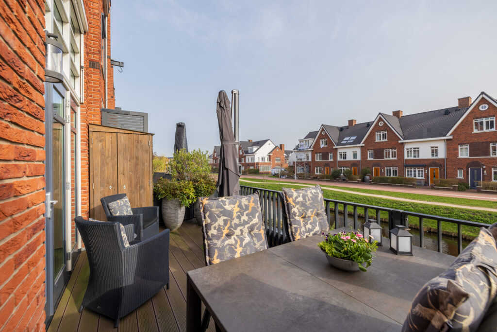 Aan de achterzijde ligt een ruim balkon aan het water, terwijl aan de voorzijde een tweede balkon over de volledige breedte van de woning ligt. De voortuin op het zuidwesten biedt daarnaast voldoende ruimte voor een zitje, waardoor je hier heerlijk van de middag- en avondzon kunt genieten.