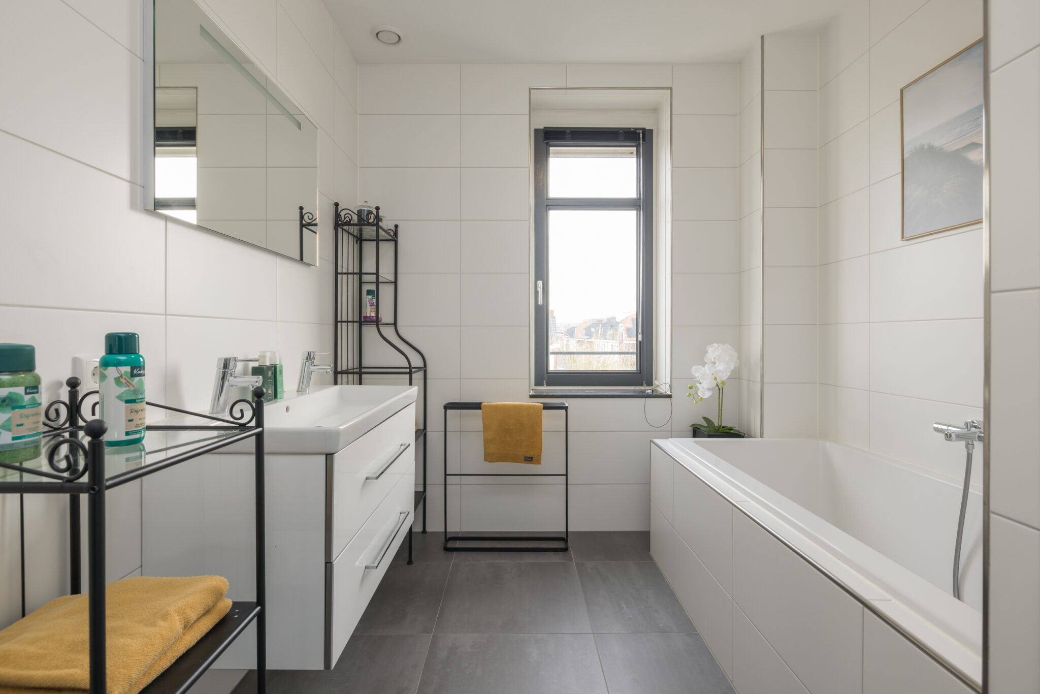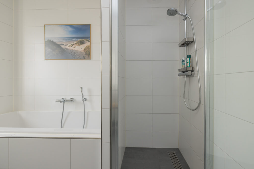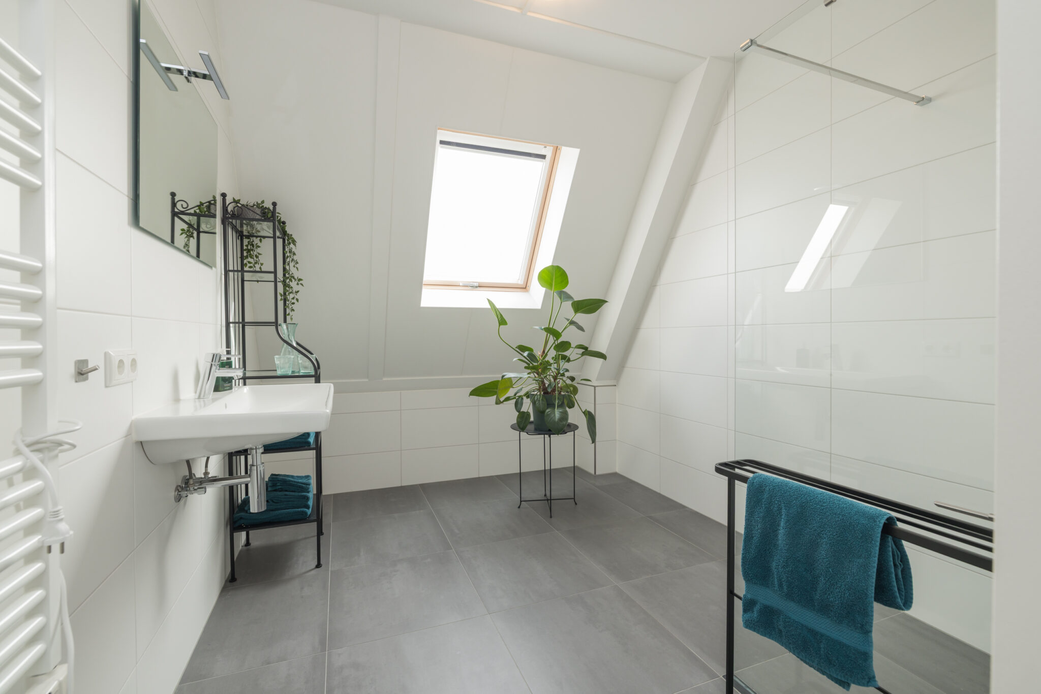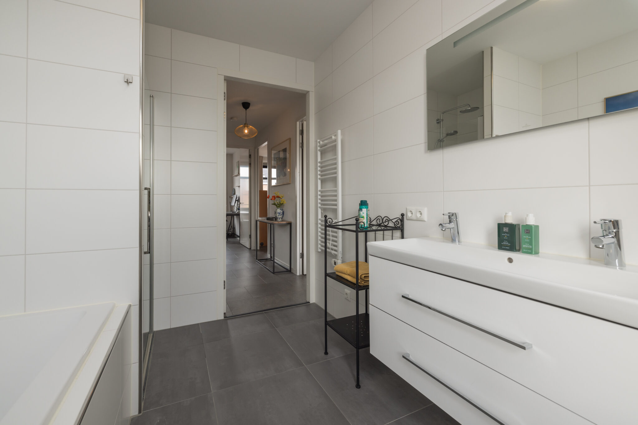 De badkamer is netjes en compleet uitgevoerd met een ligbad, inloopdouche en een wastafelmeubel. Daarnaast is er een apart toilet op de overloop.