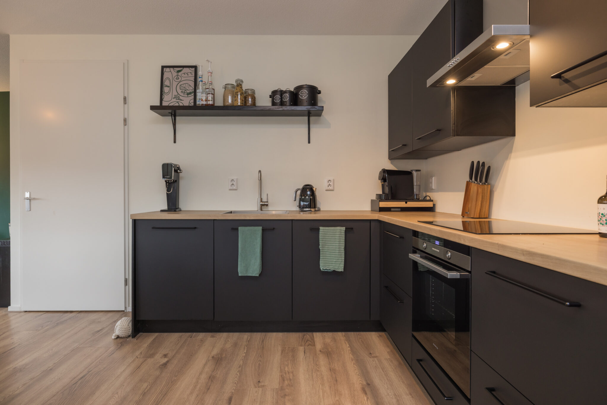 Indeling: entree, intercom, ruime garderoberuimte, modern betegelde badkamer met douchecabine, wastafelmeubel en handdoekenradiator, apart modern vrij hangend toilet, twee goed formaat slaapkamers met laminaatvloeren en dubbel glas, afsluitbare was-/droog-, stookruimte met CV Remeha combiketel uit 2019, goed formaat woonkamer met een moderne laminaatvloer en rondom ramen, moderne open keuken (2019) met diverse inbouwapparatuur wo. vaatwasser, oven, inductiekookplaat, afzuigkap en een koel-/vriescombinatie.