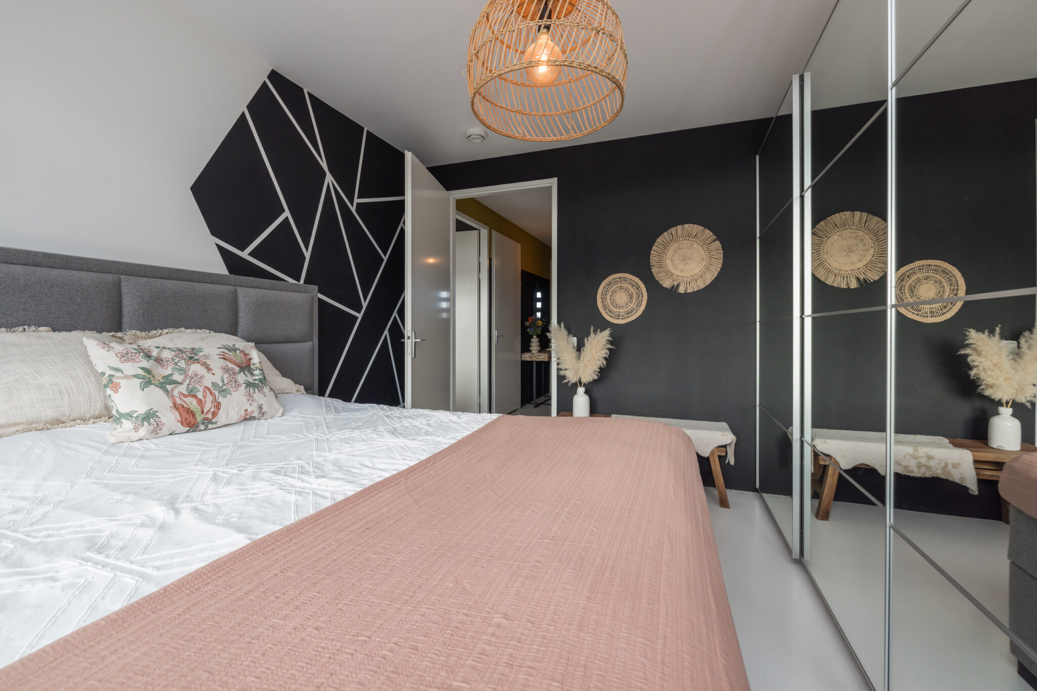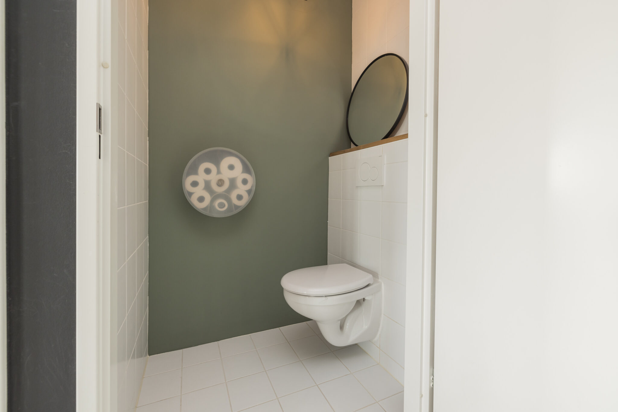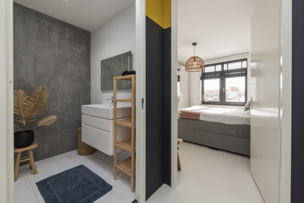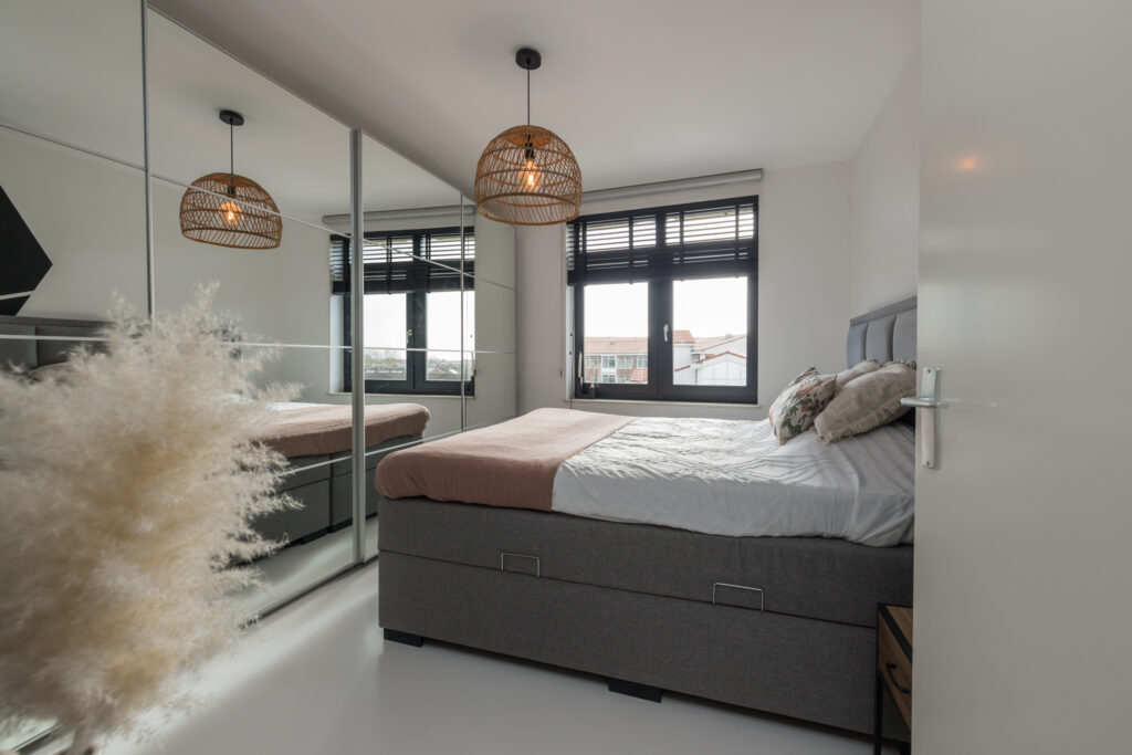 De open keuken is uitgerust met een lichtkoepel en uitgevoerd in hoogglans wit met diverse bovenkastjes en inbouwapparatuur zoals een inductiekookplaat, afzuigkap, combimagnetron, koelkast en vaatwasser. De grote slaapkamer ligt aan de achterzijde en beschikt over een moderne schuifkastenwand die achterblijft. De tweede slaapkamer aan de entreezijde is momenteel in gebruik als werkplek. Tegenover deze kamer bevindt zich de technische ruimte met het Warmte-Terug-Win-ventilatiesysteem, de aansluitingen voor wasapparatuur en extra bergruimte. De moderne badkamer is voorzien van een heerlijk ligbad, een stijlvol wastafelmeubel en een lichtkoepel die zorgt voor extra daglicht.