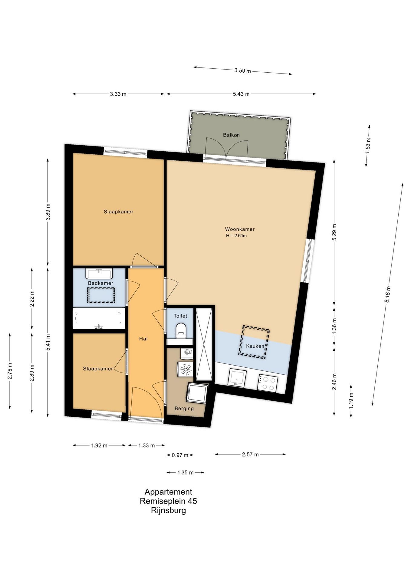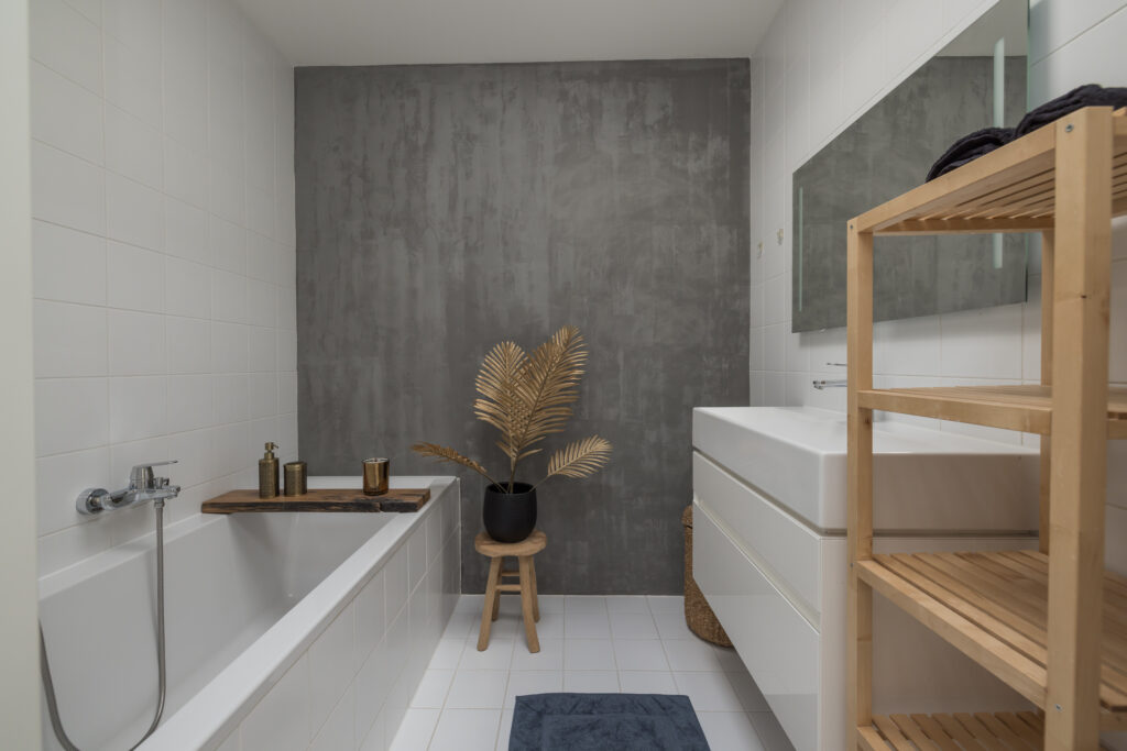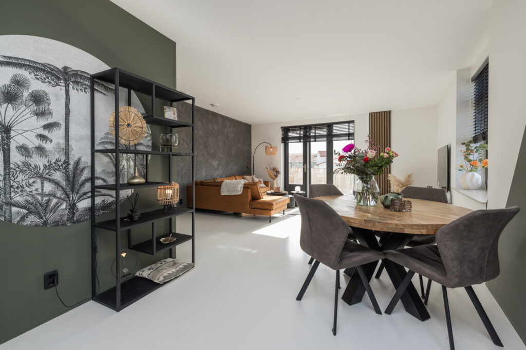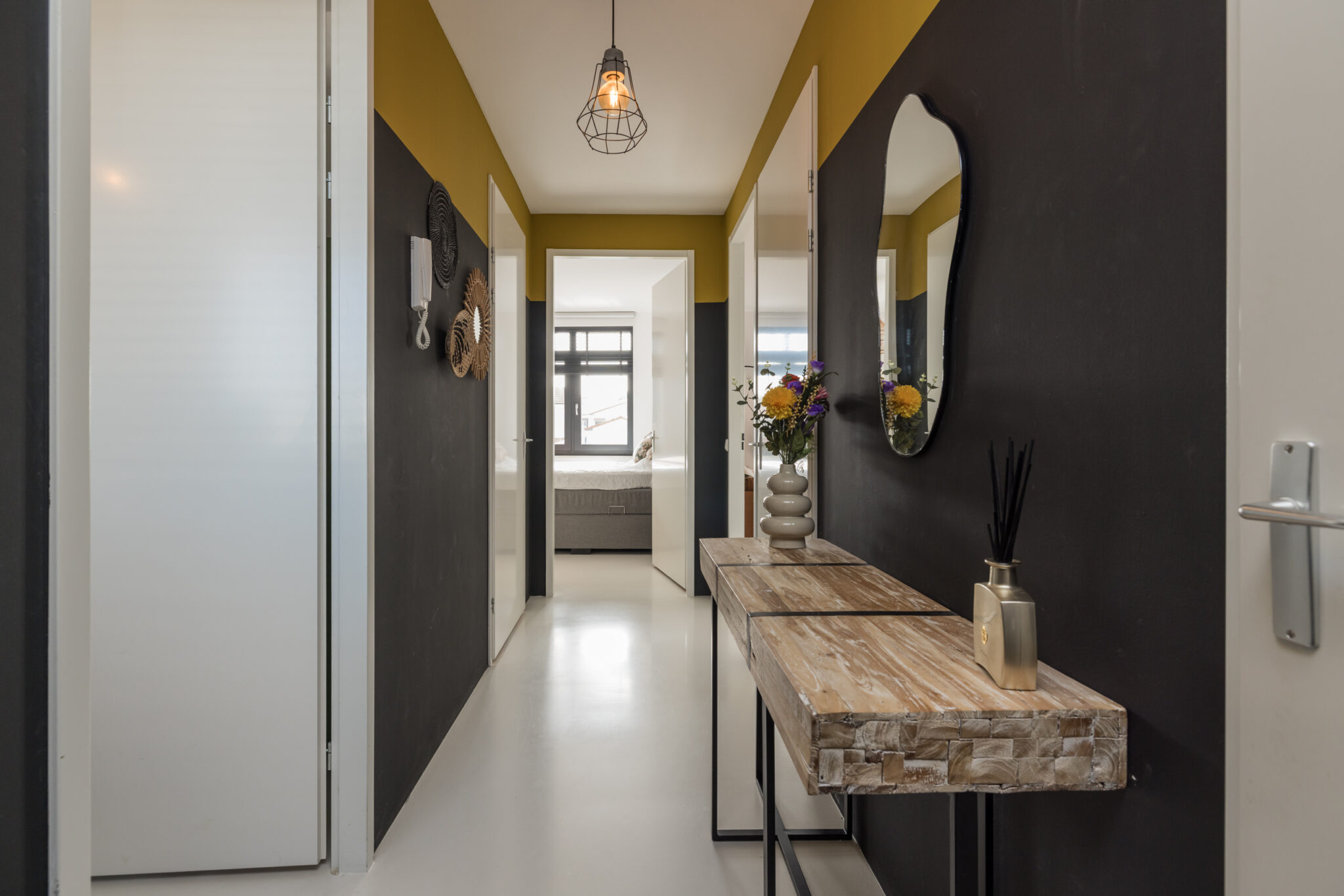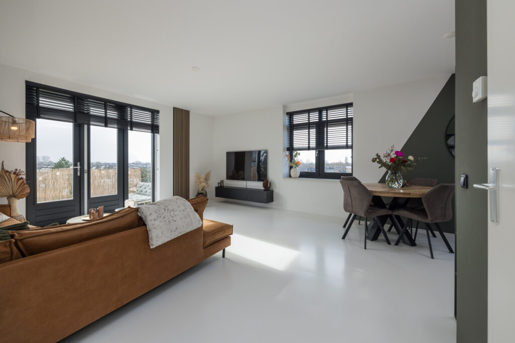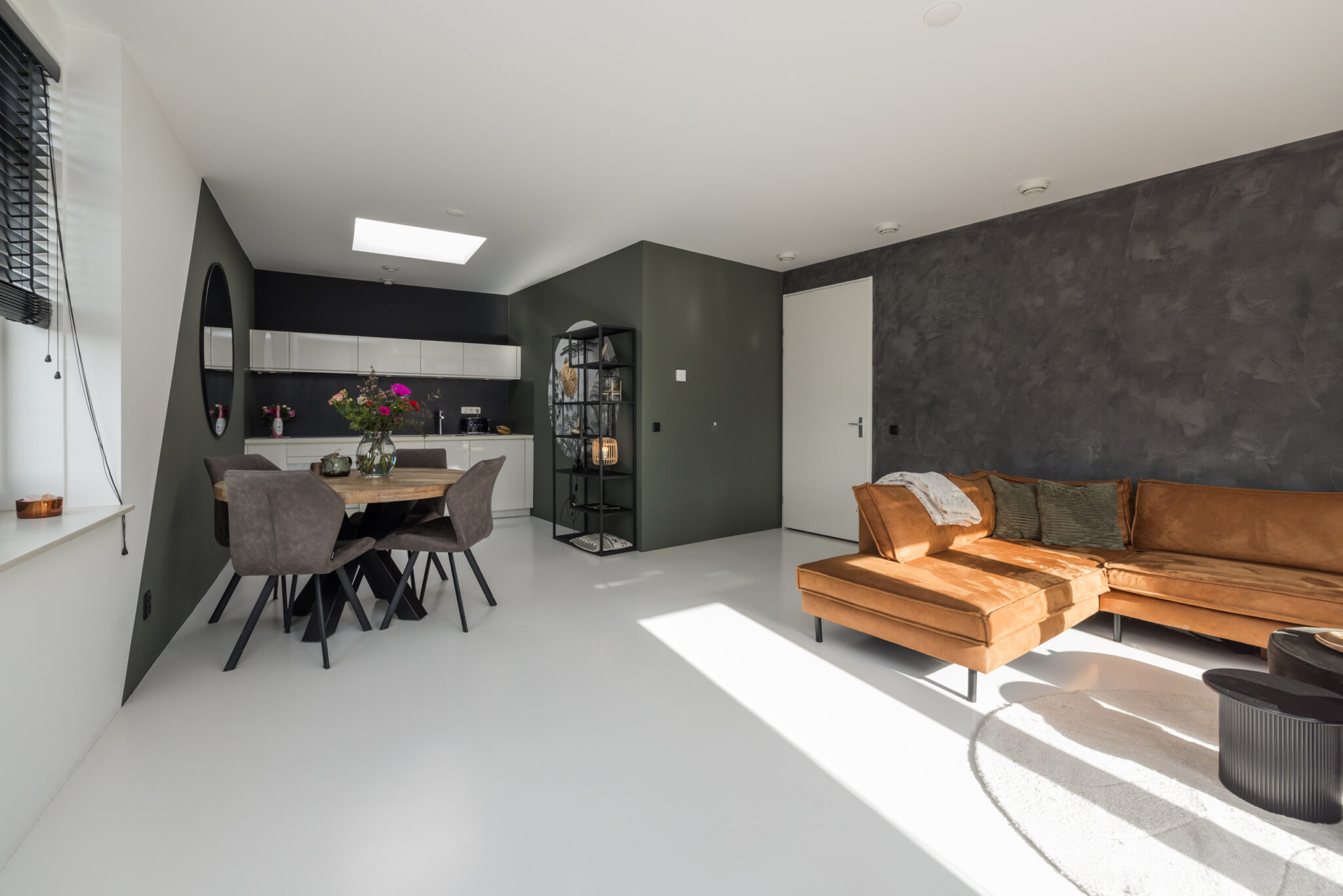 Indeling: Via de centrale entree op de begane grond met afgesloten portiek en liftinstallatie bereik je het appartement. De woning beschikt over een ruime hal met intercom en een modern vrijhangend toilet. De zeer zonnige woonkamer heeft een extra zijraam en openslaande deuren naar het ruime balkon op het zuiden, waar je de hele dag door van het directe zonlicht geniet. De woonkamer is afgewerkt met een fraaie epoxyvloer voorzien van vloerverwarming en koeling via de centrale WKO-installatie. De wanden en het plafond zijn strak gestuukt, inclusief een luxe Marrakesh Wall.