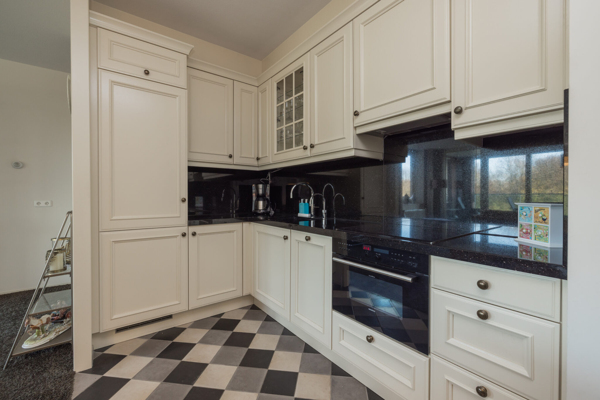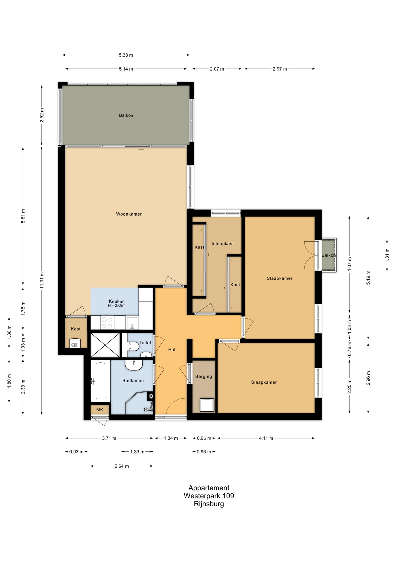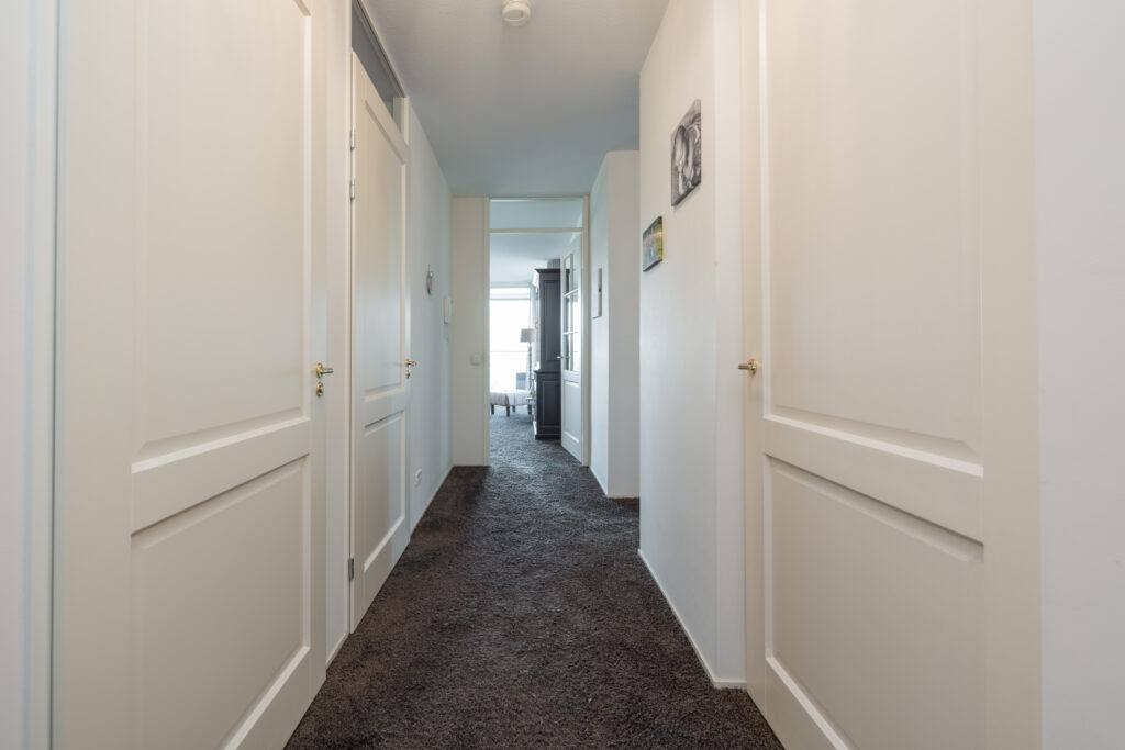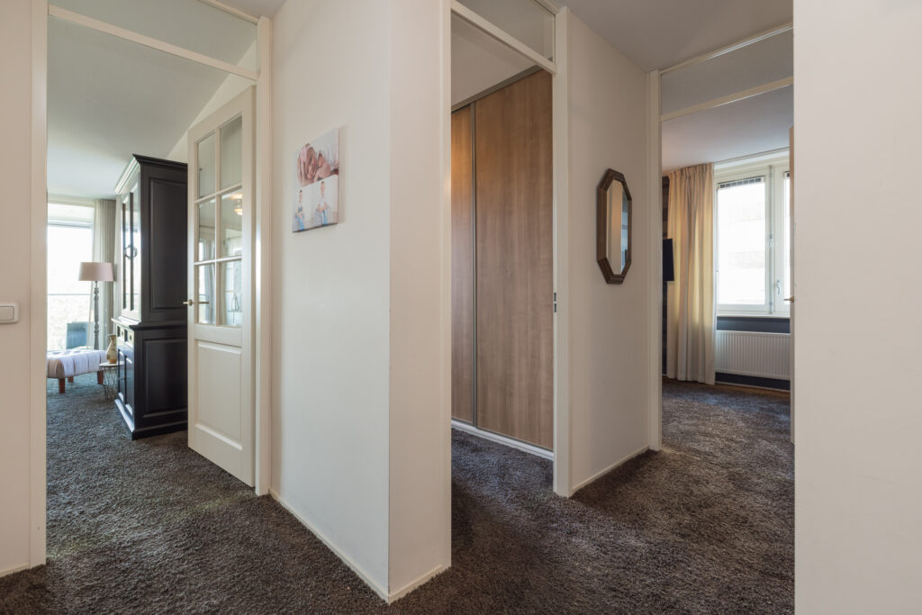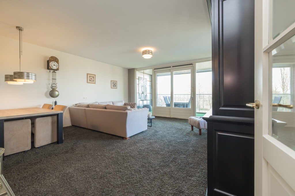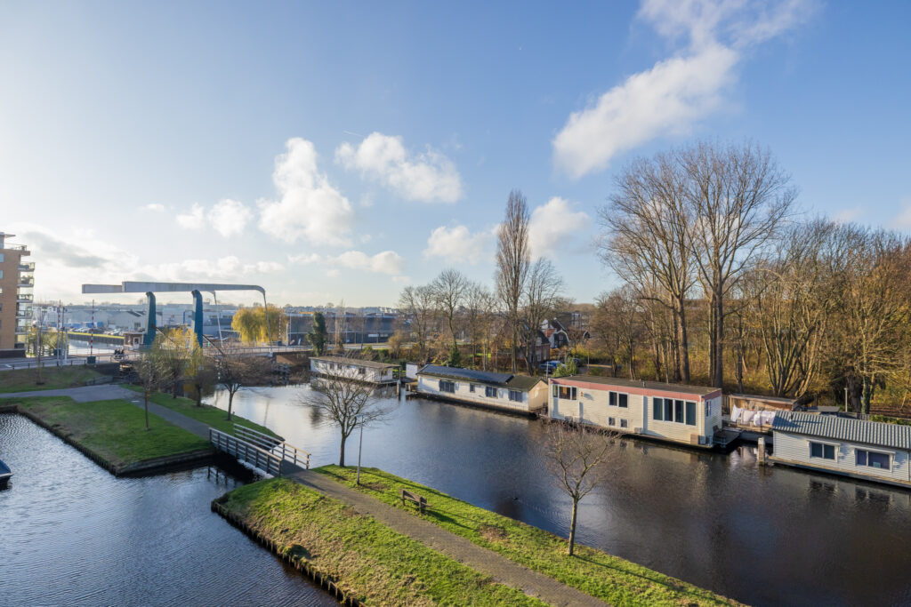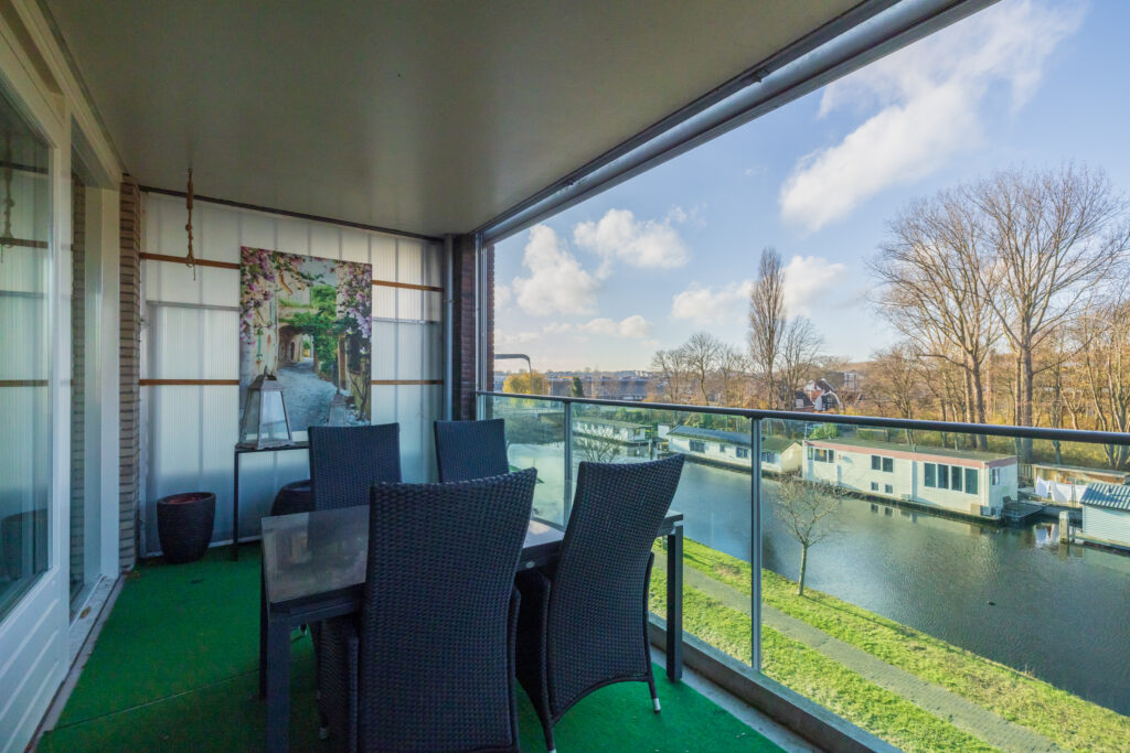 Entree, hal met garderobe, separate toiletruimte met fonteintje en een ruime berging met aansluiting wasapparatuur. Ruime woonkamer met schuifpui naar het balkon met elektrische zonnescherm en schitterend weids uitzicht over de Oude Rijn. Open keuken voorzien van diverse inbouwapparatuur zoals o.a. inductiekookplaat, vaatwasser, koelkast en combi-oven. Naast de keuken bevindt zich een vaste kast met veel bergruimte en de c.v.-ketel. 1e (ouder)slaapkamer met frans balkon. 2e en 3e ruime slaapkamer met uitzicht over de Oude Rijn. Volledig betegelde badkamer voorzien van ligbad, douche en wastafelmeubel.