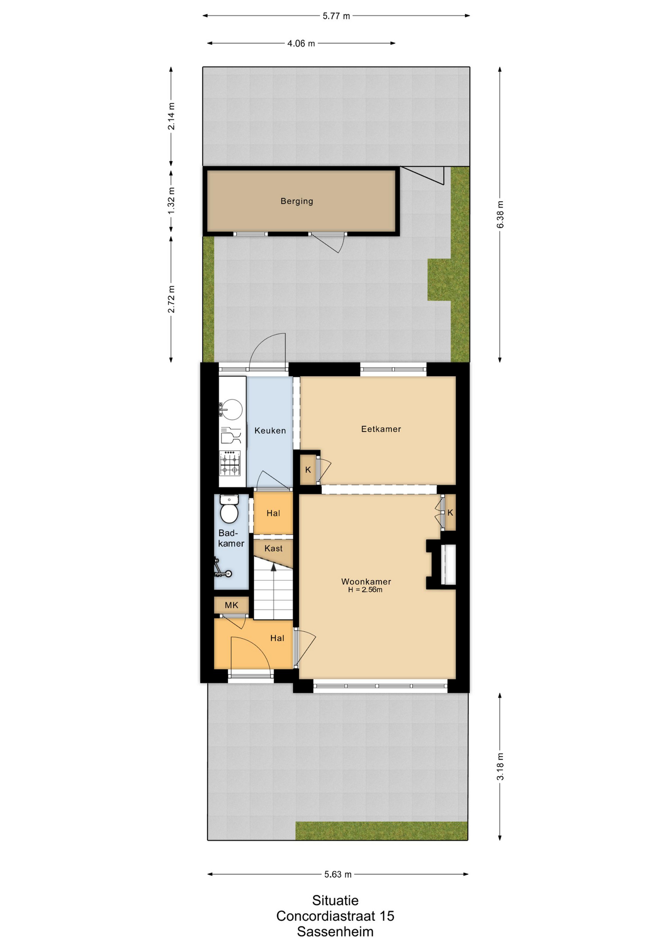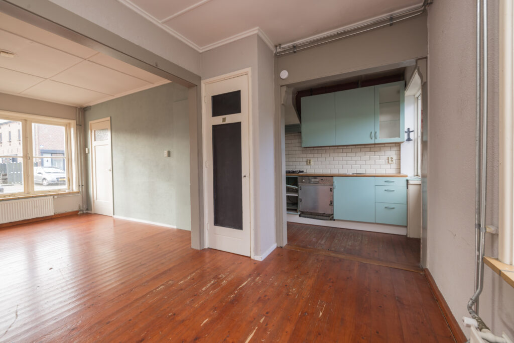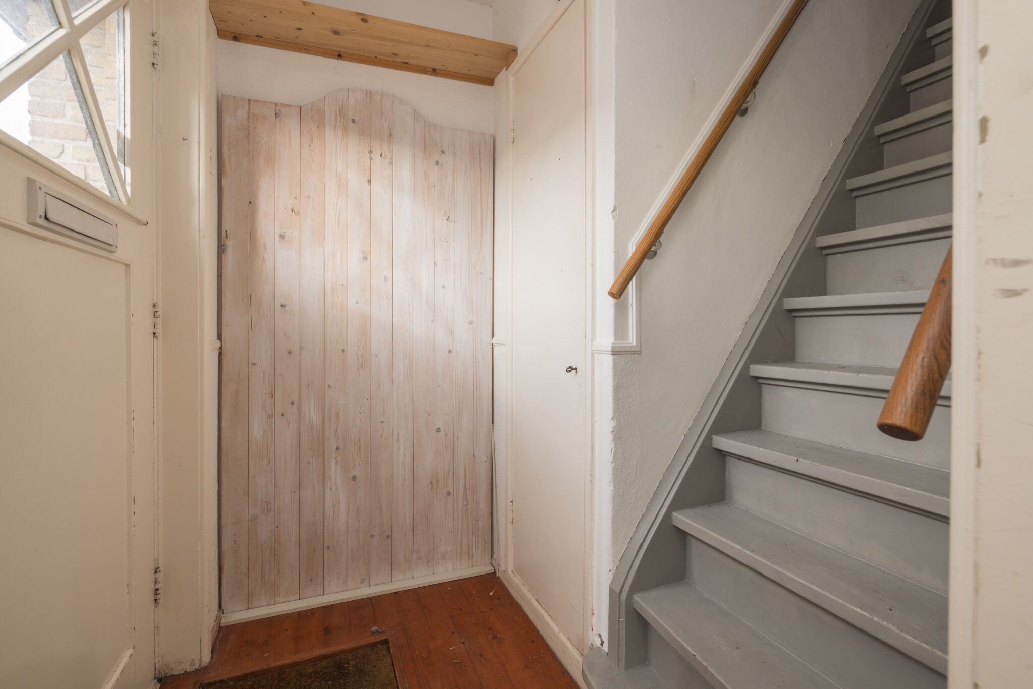 Indeling: entree, hal, woonkamer, tussenhal met trapkast, badkamerruimte met toilet en een keukenruimte met een eenvoudig keukenblok.