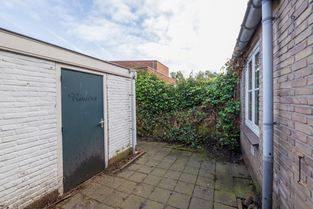Buiten: zonnige voortuin en een besloten achtertuin met stenen schuur en een achterom.