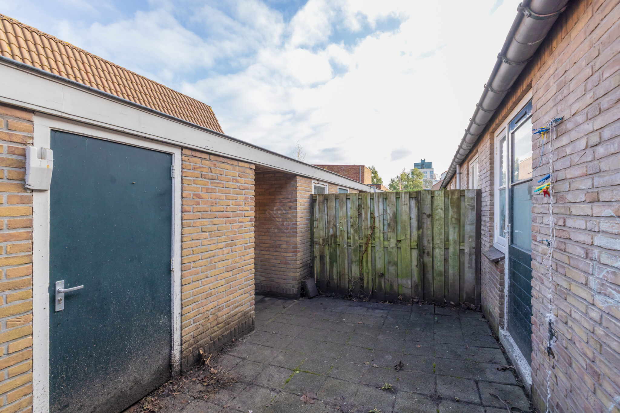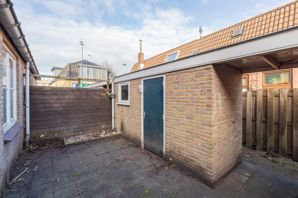 Buiten: zonnige voortuin en een besloten achtertuin met stenen schuur en een achterom.