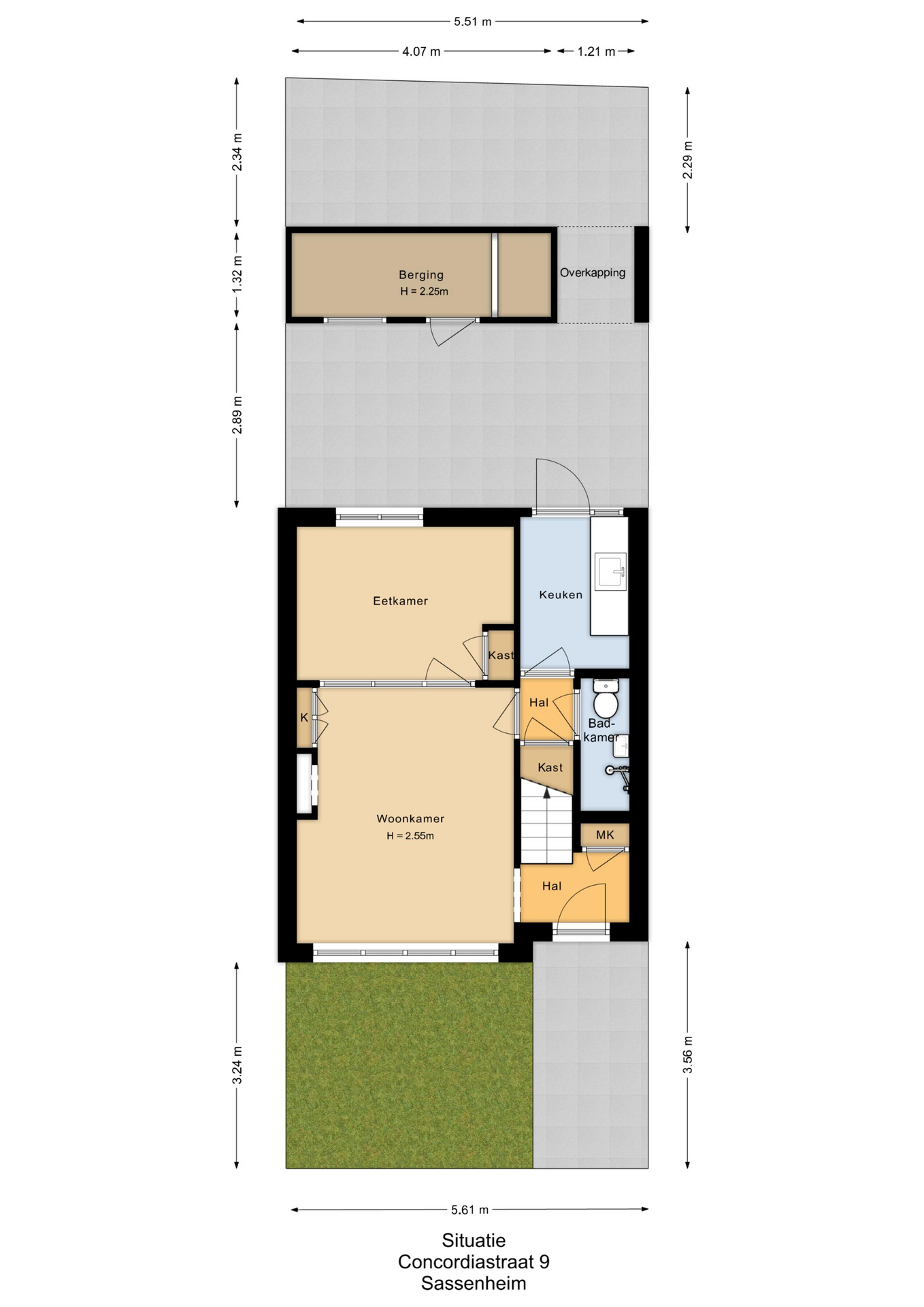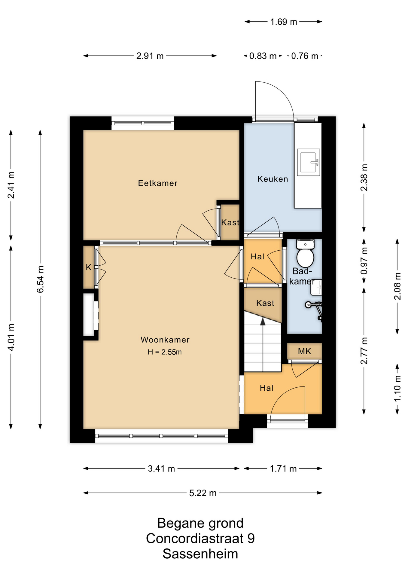 Indeling: entree, hal, woonkamer, tussenhal met trapkast, badkamerruimte met toilet en een keukenruimte met een eenvoudig keukenblok.