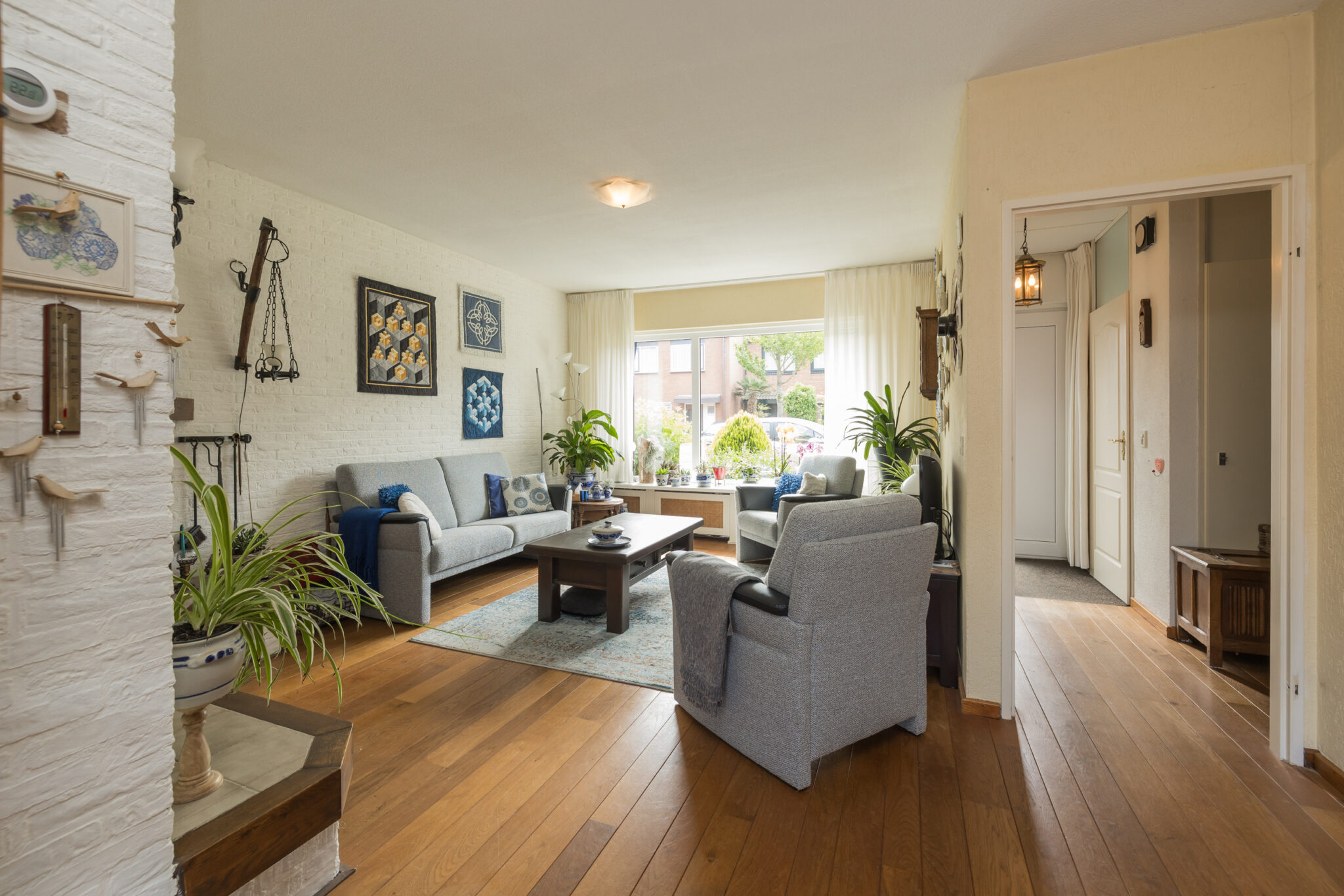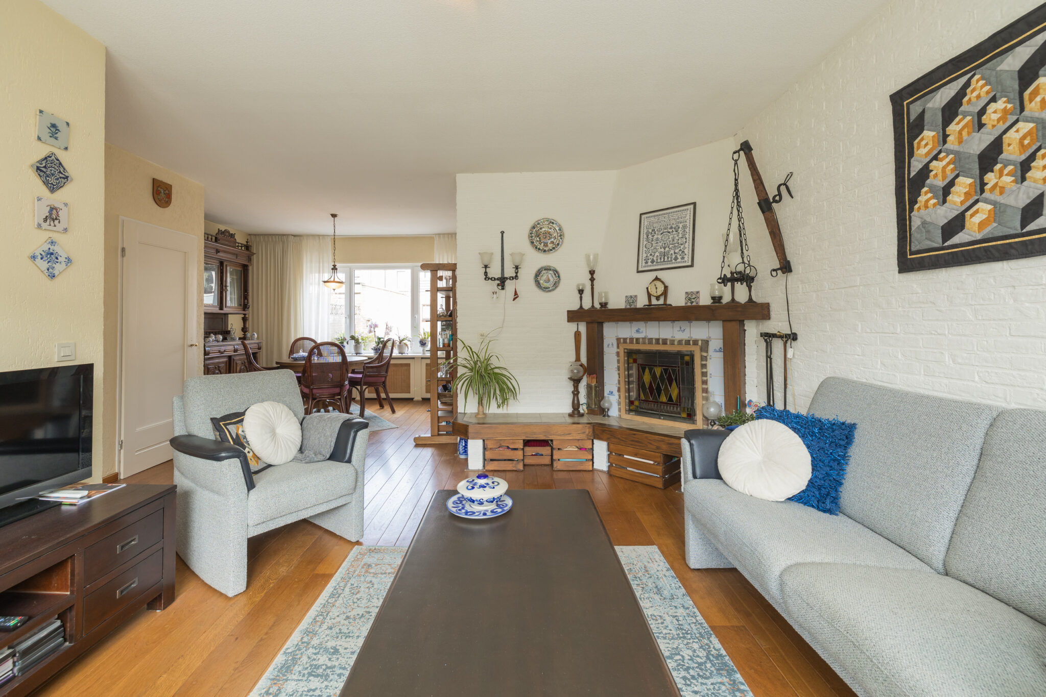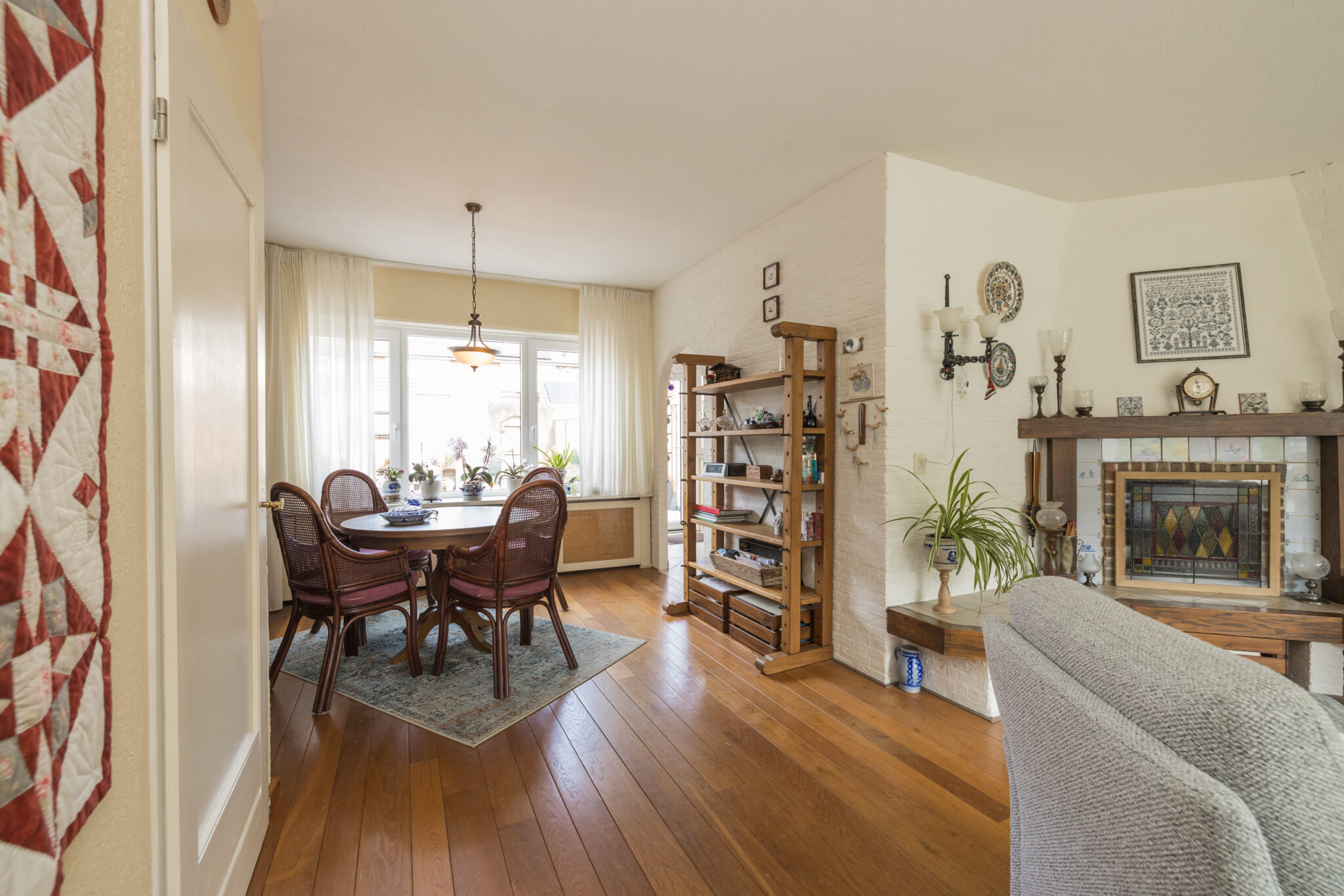• Houten vloerdelen en een open haard op de begane grond;