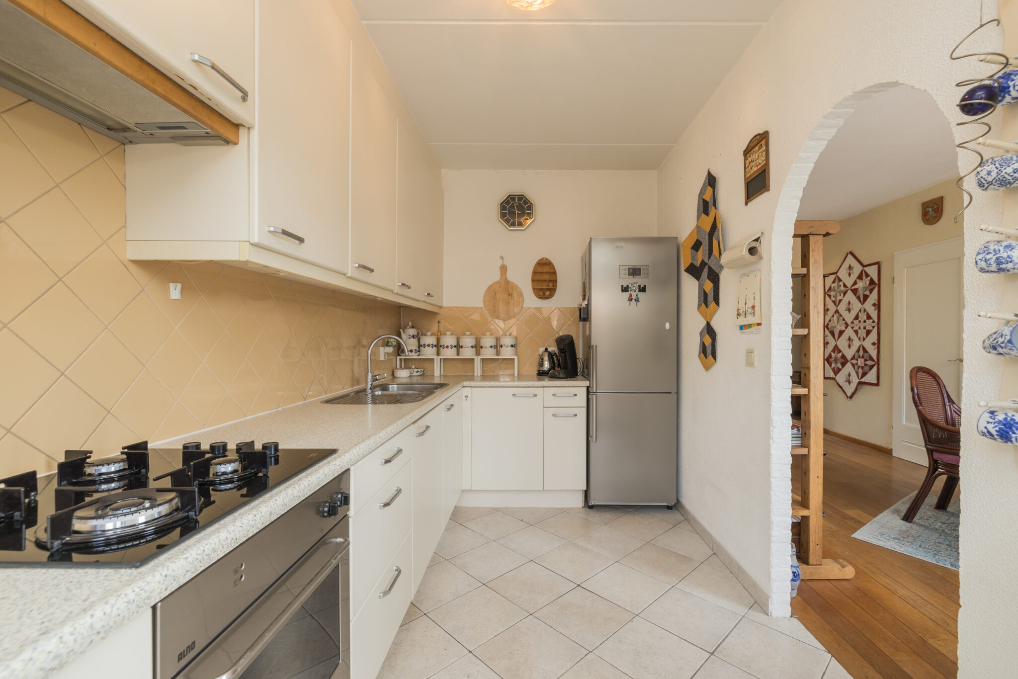 Indeling: Entree, verzorgd toilet, grote lichte woonkamer met houten vloerdelen, open haard, trapkast en een uitgebouwde keuken met plavuizenvloer v.v. oven, kookplaat en afzuigkap.