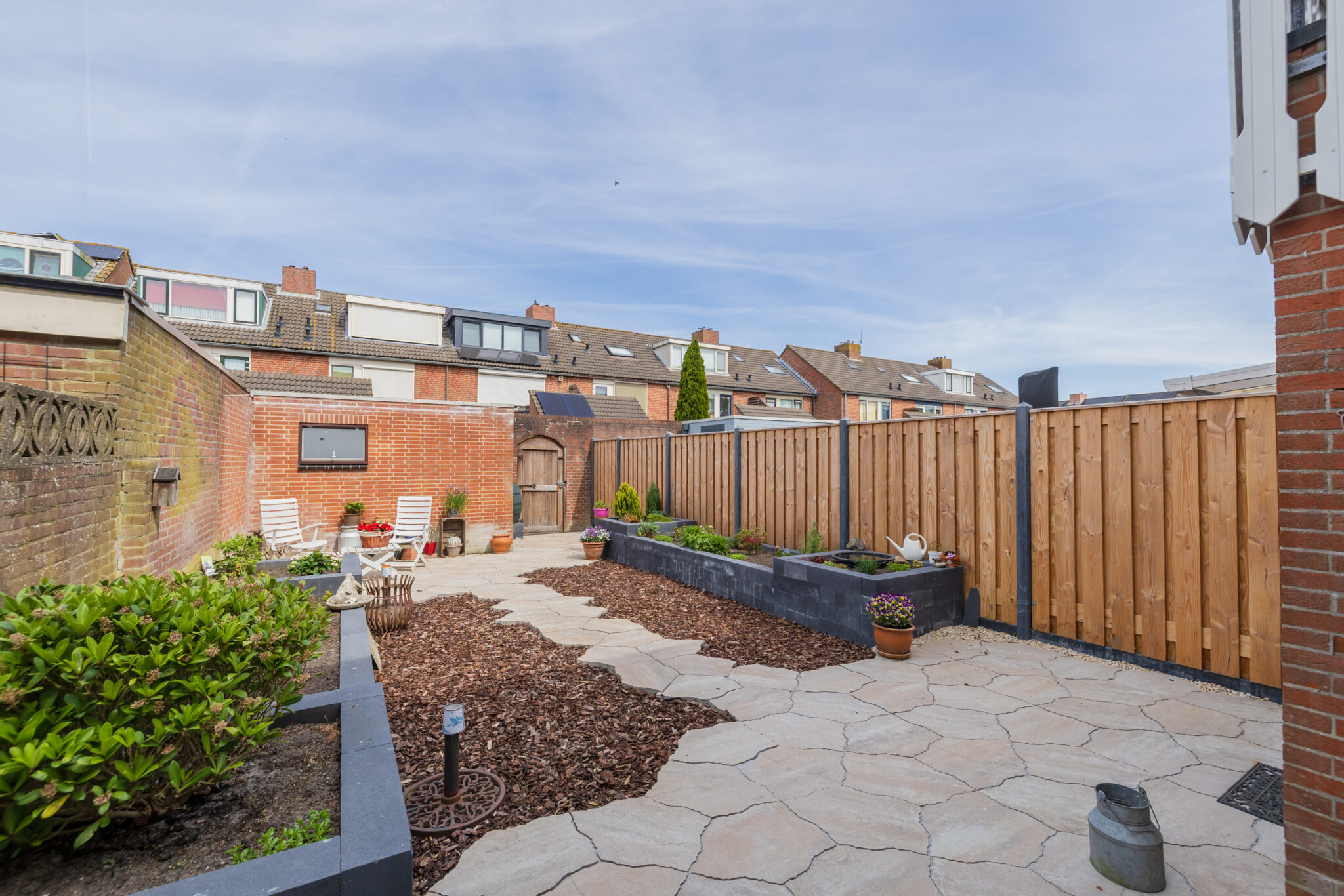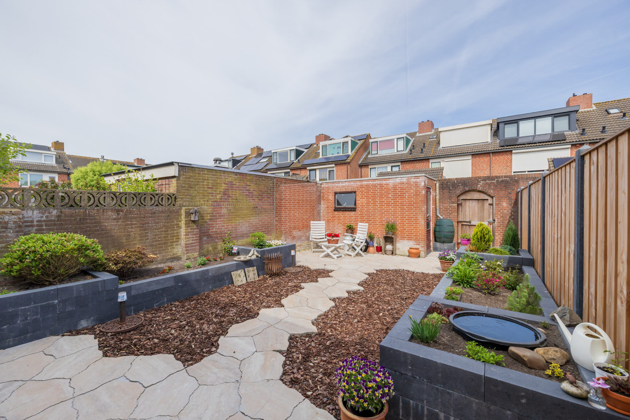 • Diepe achtertuin met zonneterras en stenen schuur;