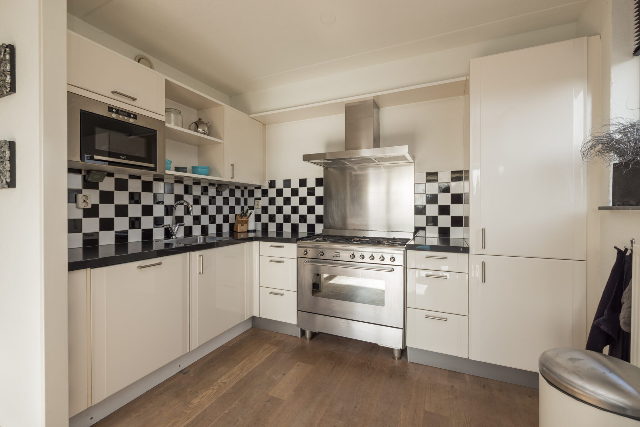 Indeling: entree, hal, sfeervolle woonkamer met parketvloer, ruim en groenrijk uitzicht, zonnig balkon, moderne lichte keuken met natuurstenen aanrechtblad, robuust gasfornuis met oven, 5 gaspitten, magnetron, vaatwasser en een koel-/vriescombinatie, gang naar was-/stookruimte met CV Nefit HR combiketel, ouderslaapkamer met laminaatvloer en vaste kastenwand en een 2e slaap-/werkkamer met een laminaatvloer en vaste kast.